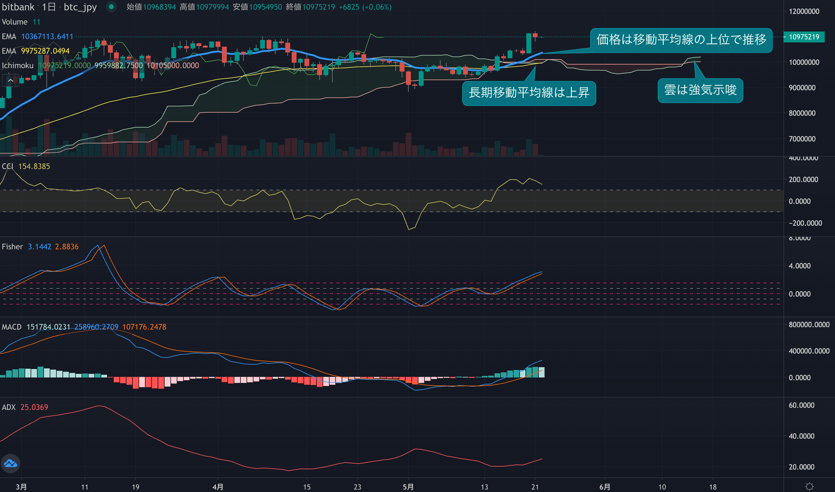 - オシレーター系インジケーターは、全て上昇基調にあります。CCIは強気圏の186で推移。Fisherはプラスで上昇しています。長期オシレーターのMACDも現在はプラス圏での推移となっています。