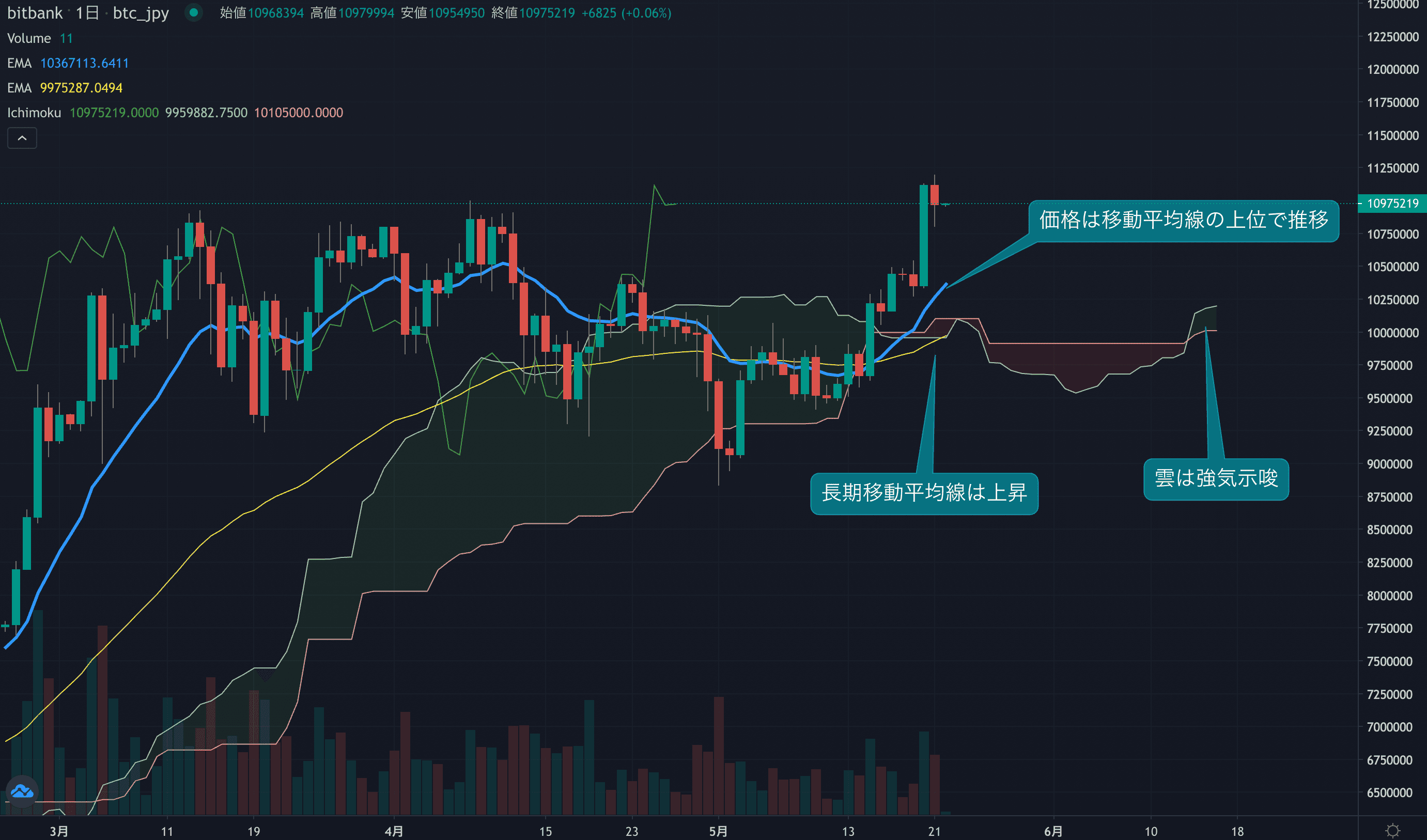 - 昨日のビットコインは1.3%下落し、終値は1096.8万円でした。価格は一昨日の上昇の反動から短期的な利確売りが発生しました。一方、下落は小幅に止まり、日足は移動平均線の上位を維持しています。