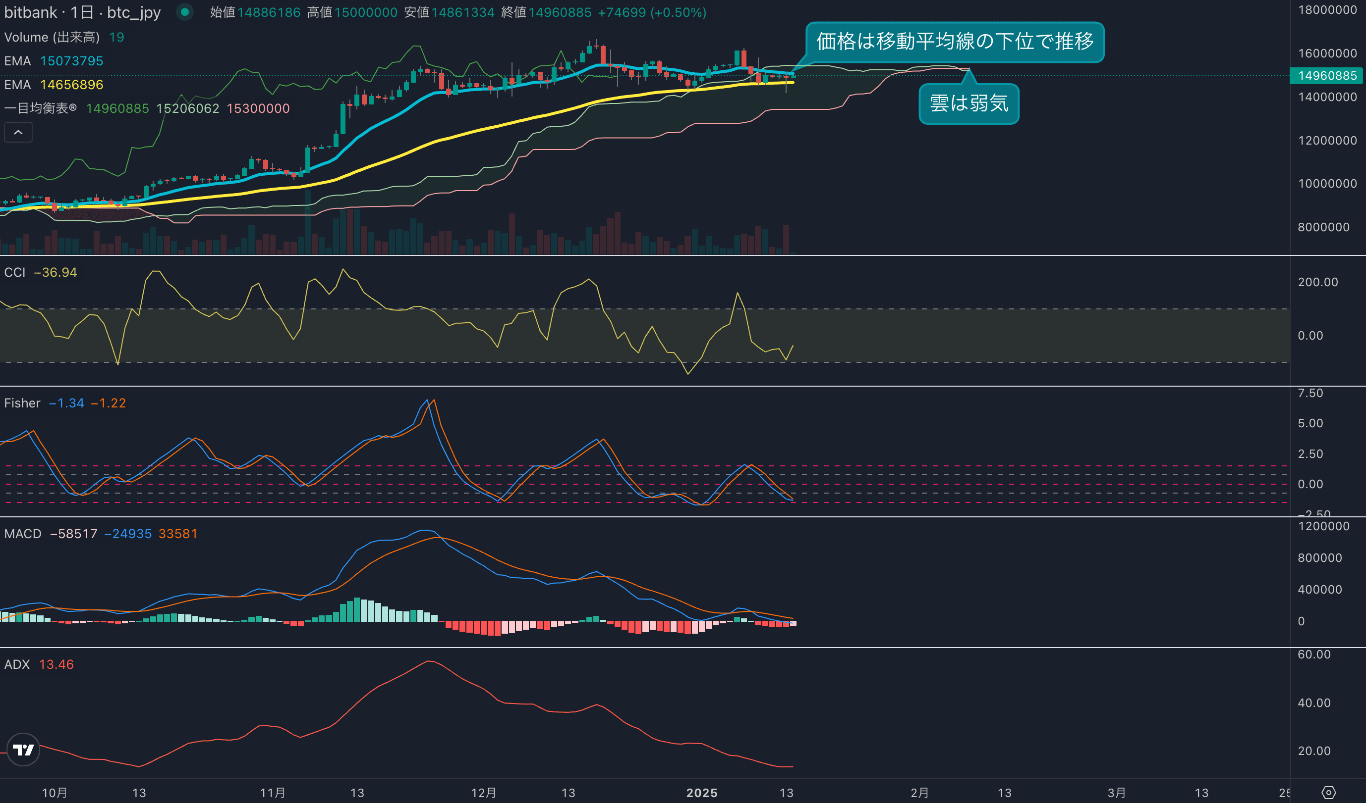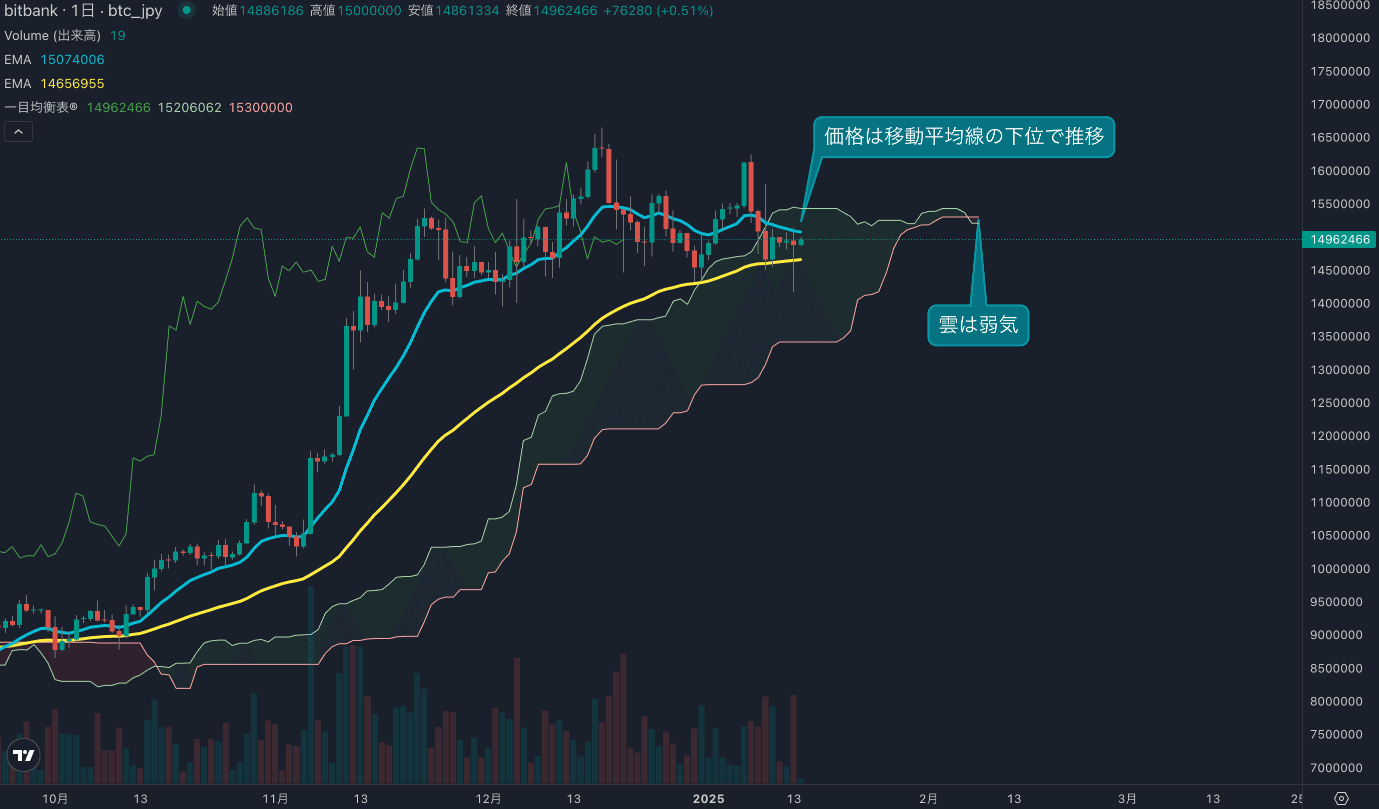 - 価格は14EMA(1509万円)を下回り弱気示唆です。53EMA(1464万円)は上昇しており、長期トレンドは強気です。一目均衡表の雲は先行スパン1(1520万円)が先行スパン2(1530万円)を下回り弱気示唆です。