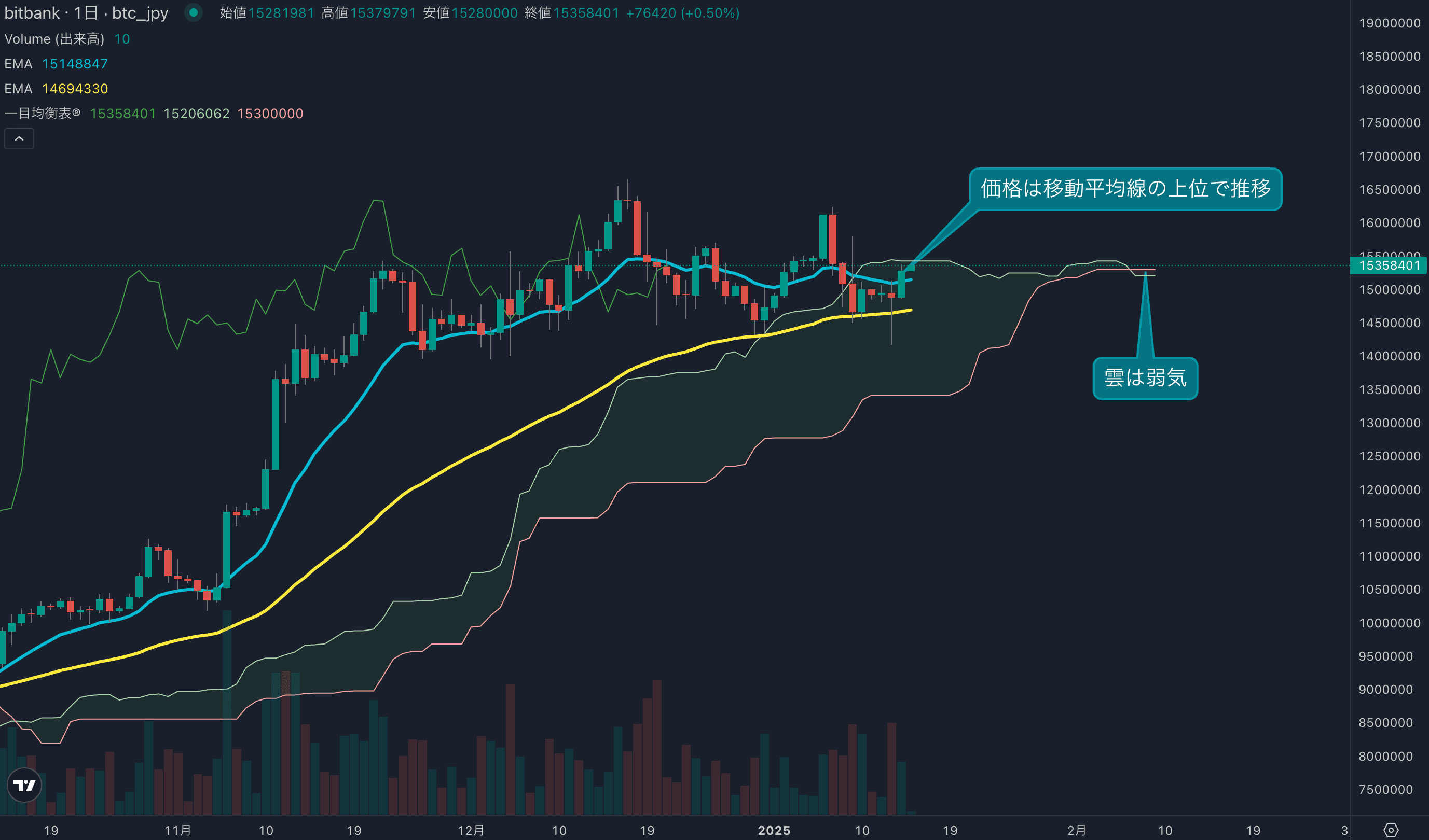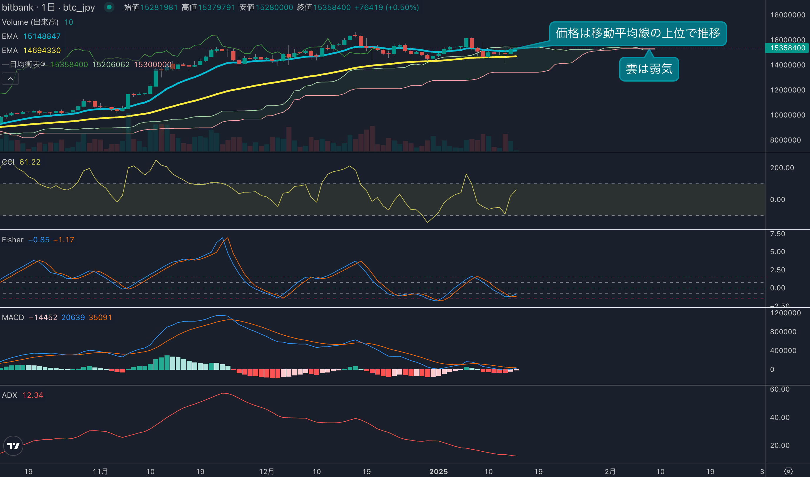 - 価格は14EMA(1511万円)を上回り強気示唆です。53EMA(1466万円)は上昇しており、長期トレンドも強気です。一目均衡表の雲は先行スパン1(1520万円)が先行スパン2(1530万円)を上回り強気示唆です。