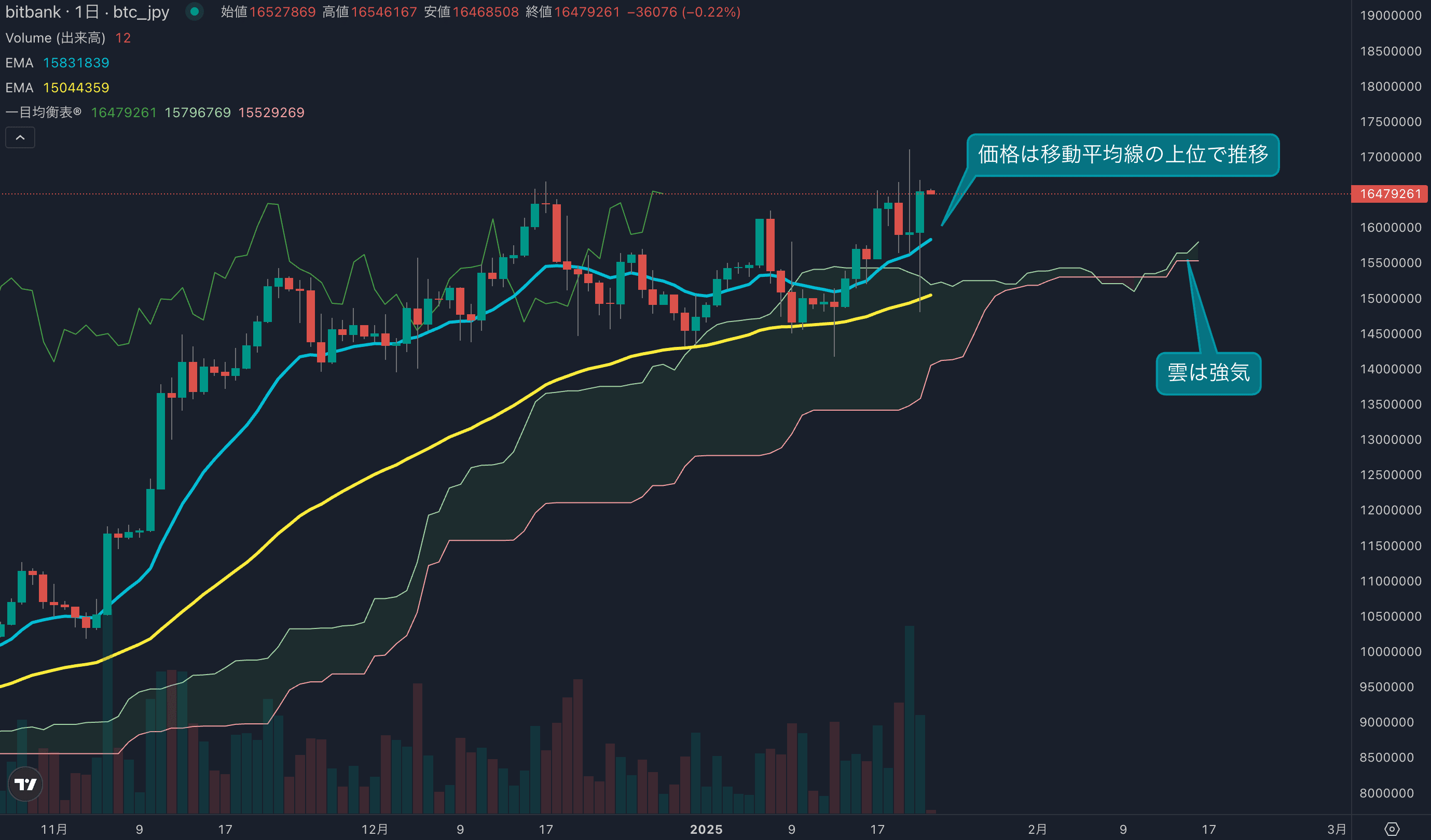 - 価格は14EMA(1573万円)を上回り強気示唆です。53EMA(1498万円)は上昇しており、長期トレンドも強気です。一目均衡表の雲は先行スパン1(1563万円)が先行スパン2(1552万円)を上回り強気示唆です。