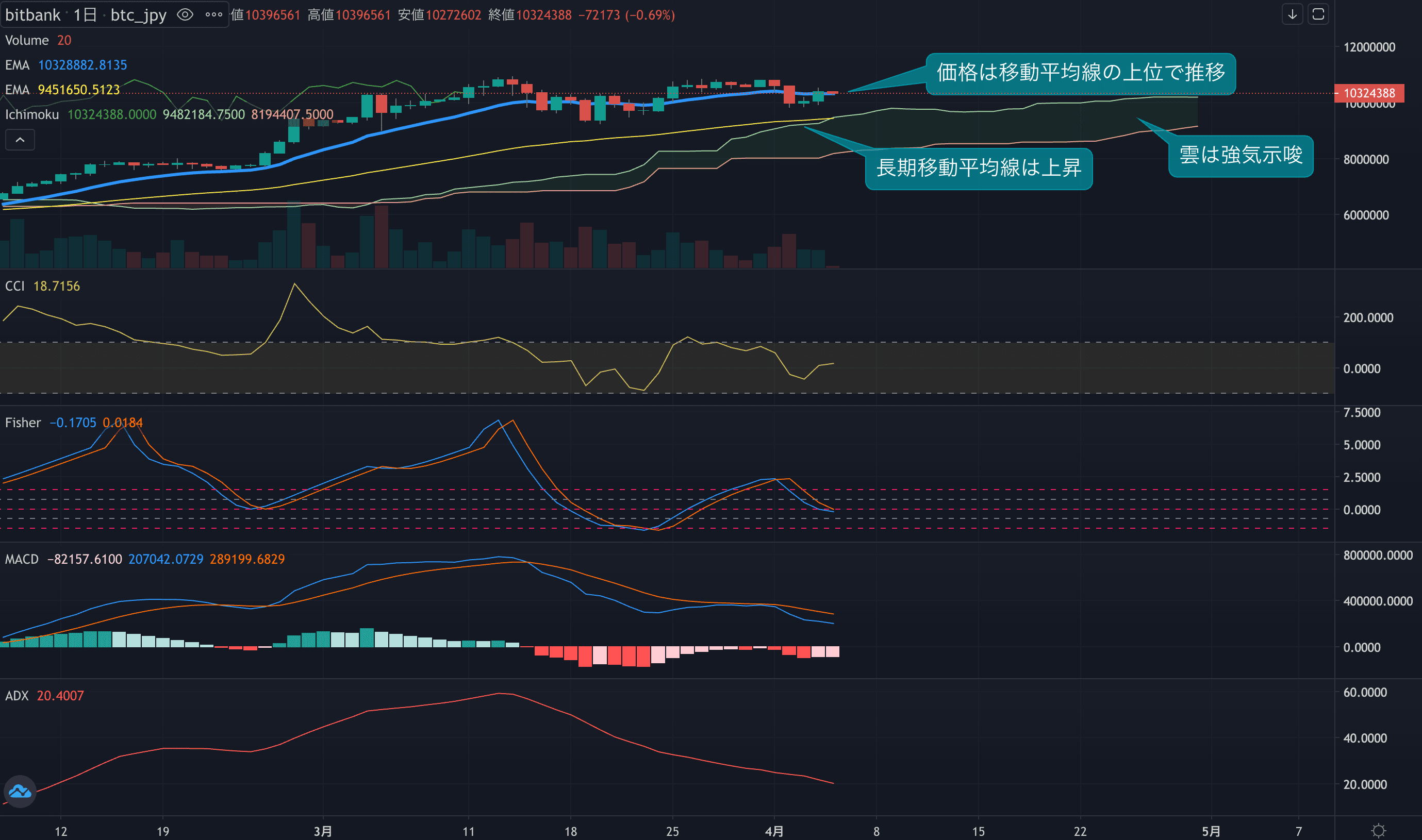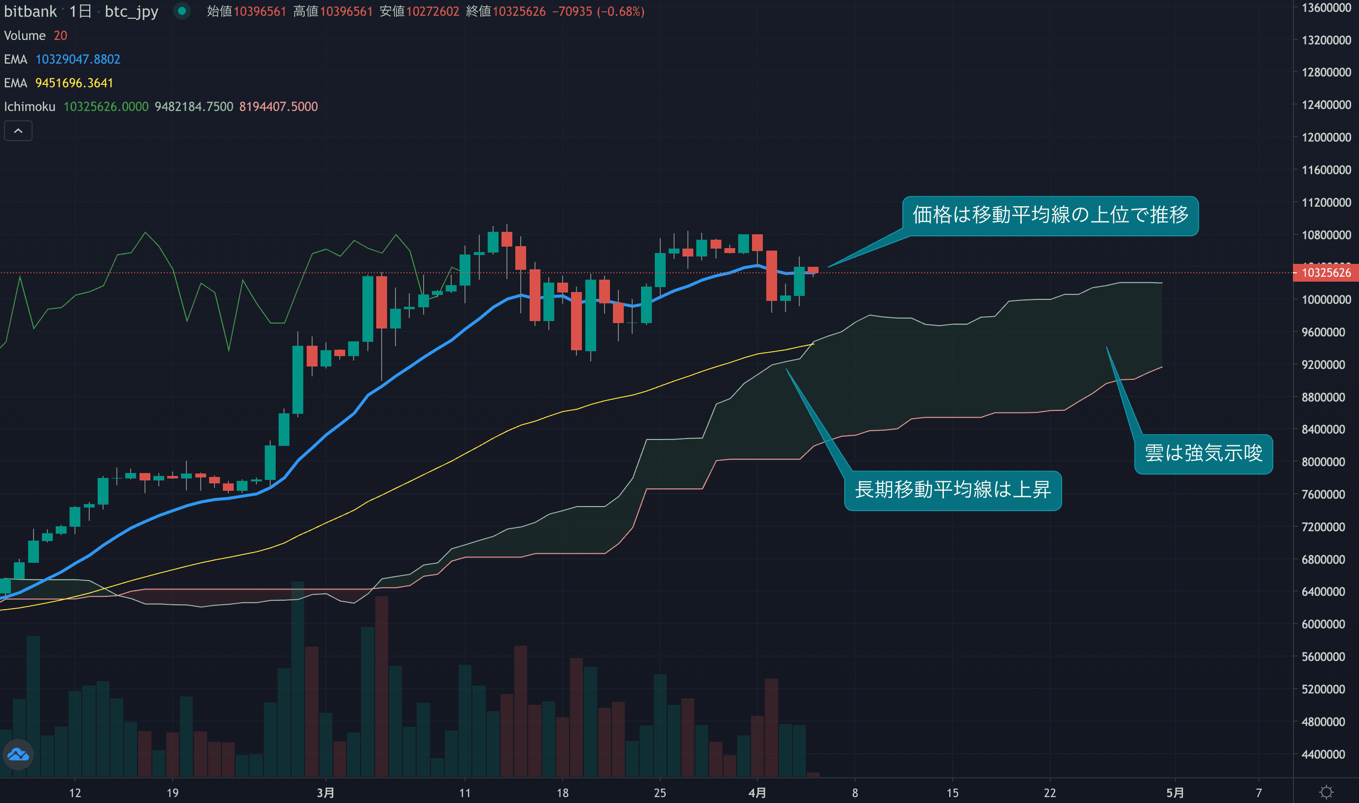 - 価格は14EMA(1039.6万円)を上回り強気示唆です。53EMA(941.8万円)は上昇しており、長期トレンドも強気です。一目均衡表の雲は先行スパン1(1020.9万円)が先行スパン2(909.8万円)を上回り強気示唆です。