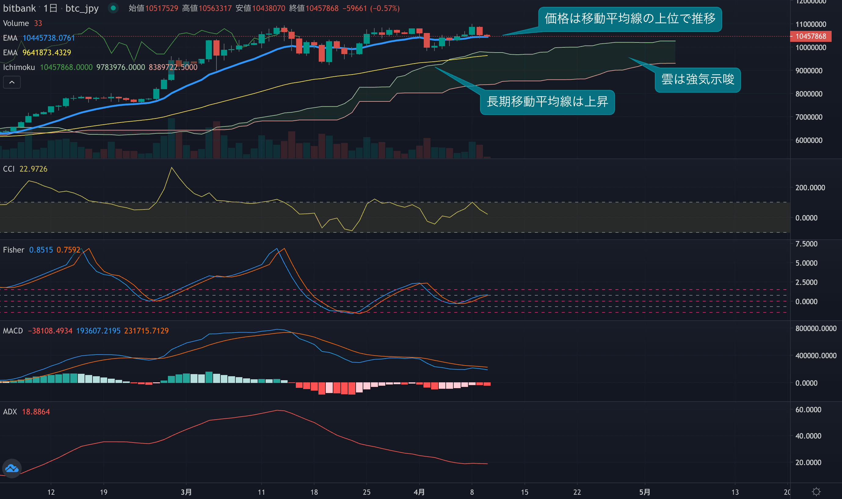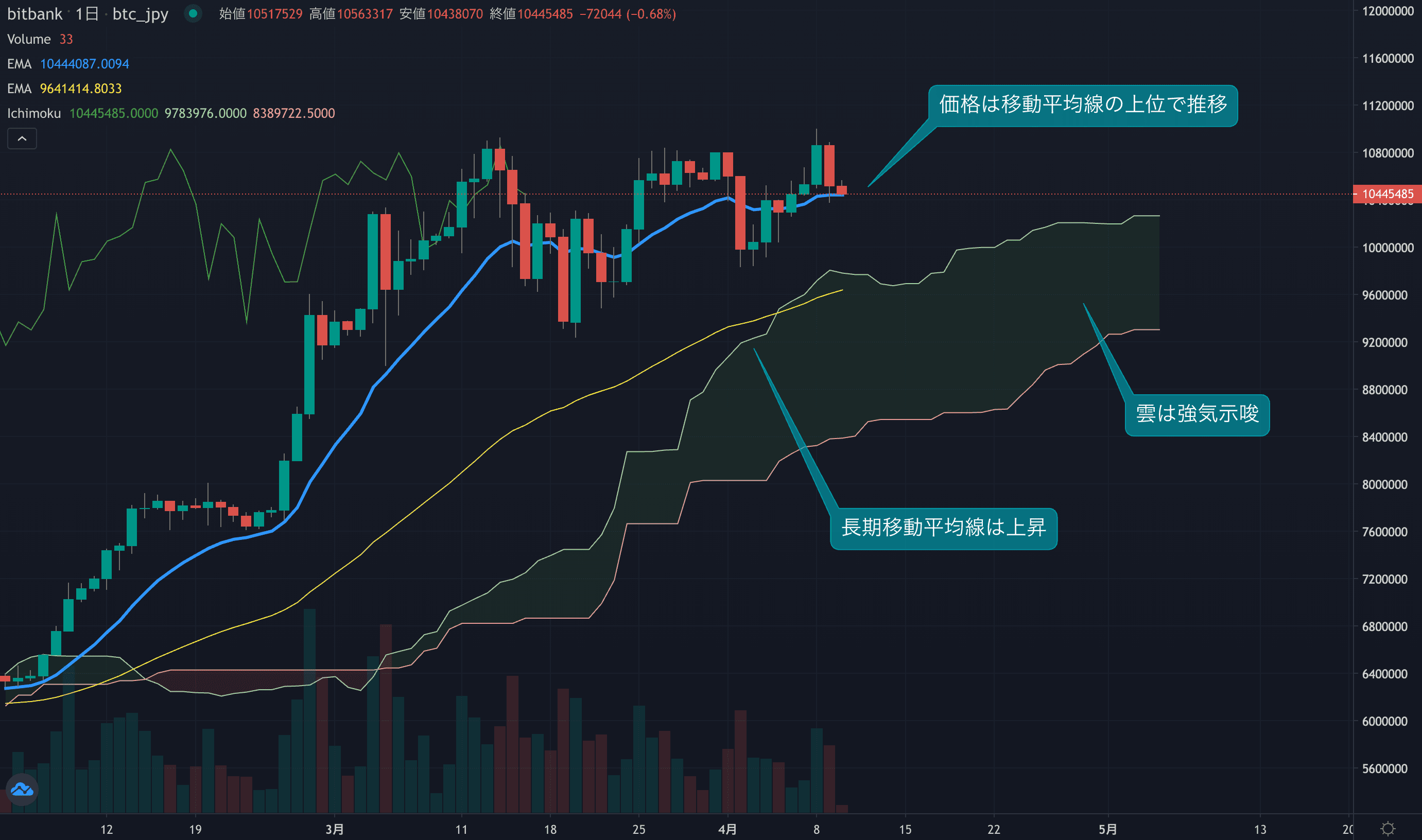 - 価格は14EMA(1044.3万円)を上回り強気示唆です。53EMA(961.0万円)は上昇しており、長期トレンドも強気です。一目均衡表の雲は先行スパン1(1026.8万円)が先行スパン2(930.6万円)を上回り強気示唆です。