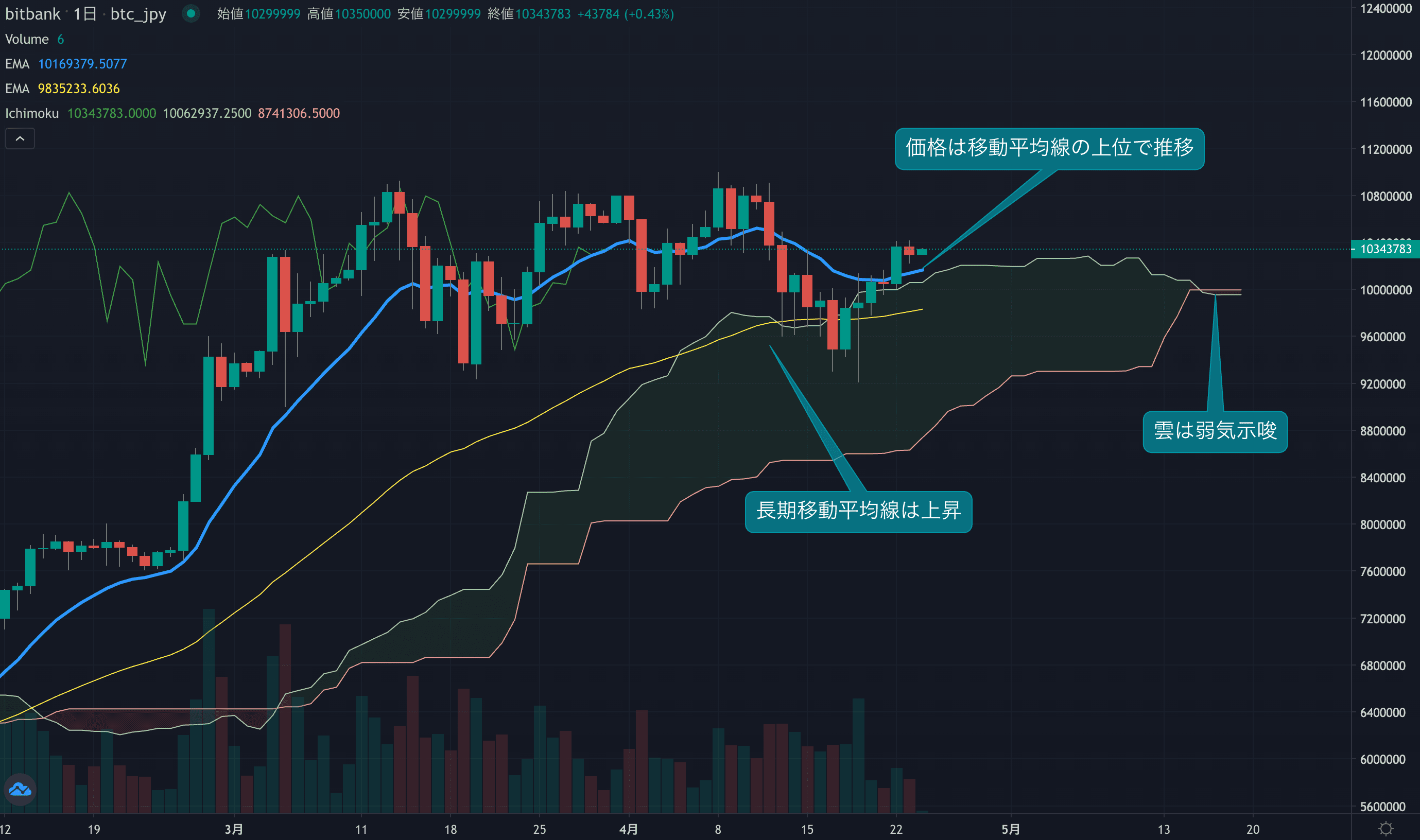 - 昨日のビットコインは0.6%下落し、終値は1029.9万円でした。週明けは強い上昇となりましたが昨日は上値が重い展開となりました。一方、下落幅は限定的で昨日の安値圏1020万円台では買い戻しの動きも見られました。日足は移動平均線の上位も維持しています。