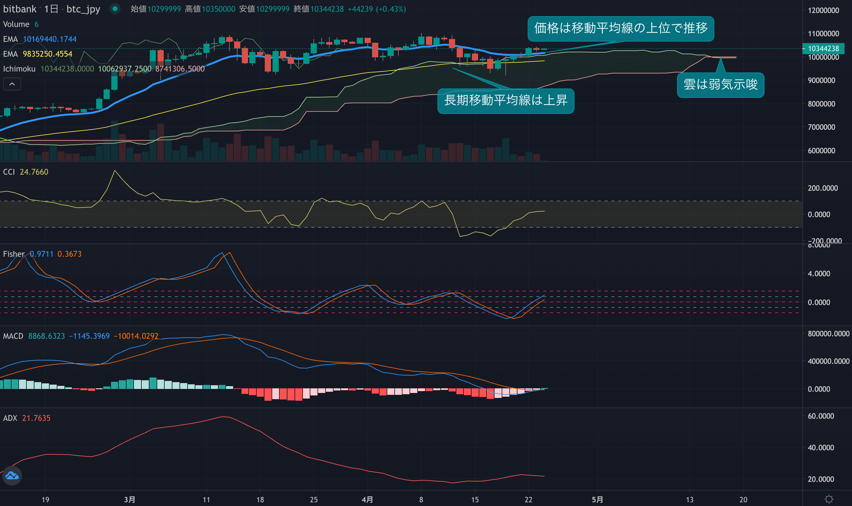 - ビットコインは昨日は陰線となったものの、テクニカルは上向きつつあります。ADXを見る限り、まだ強い上昇トレンドは発生していませんが、上値を目指す流れとなっています。本日MACDのゴールデンクロスが成立すると3月15日以来となります。長期のモメンタムも徐々に改善傾向にあります。相場は4月に入り調整局面を迎えていましたが、徐々に次のトレンドに向けた推移となっています。日足がこのまま移動平均線の上位を維持できれば、高値の更新を狙う動きに発展することが今後予想されます。