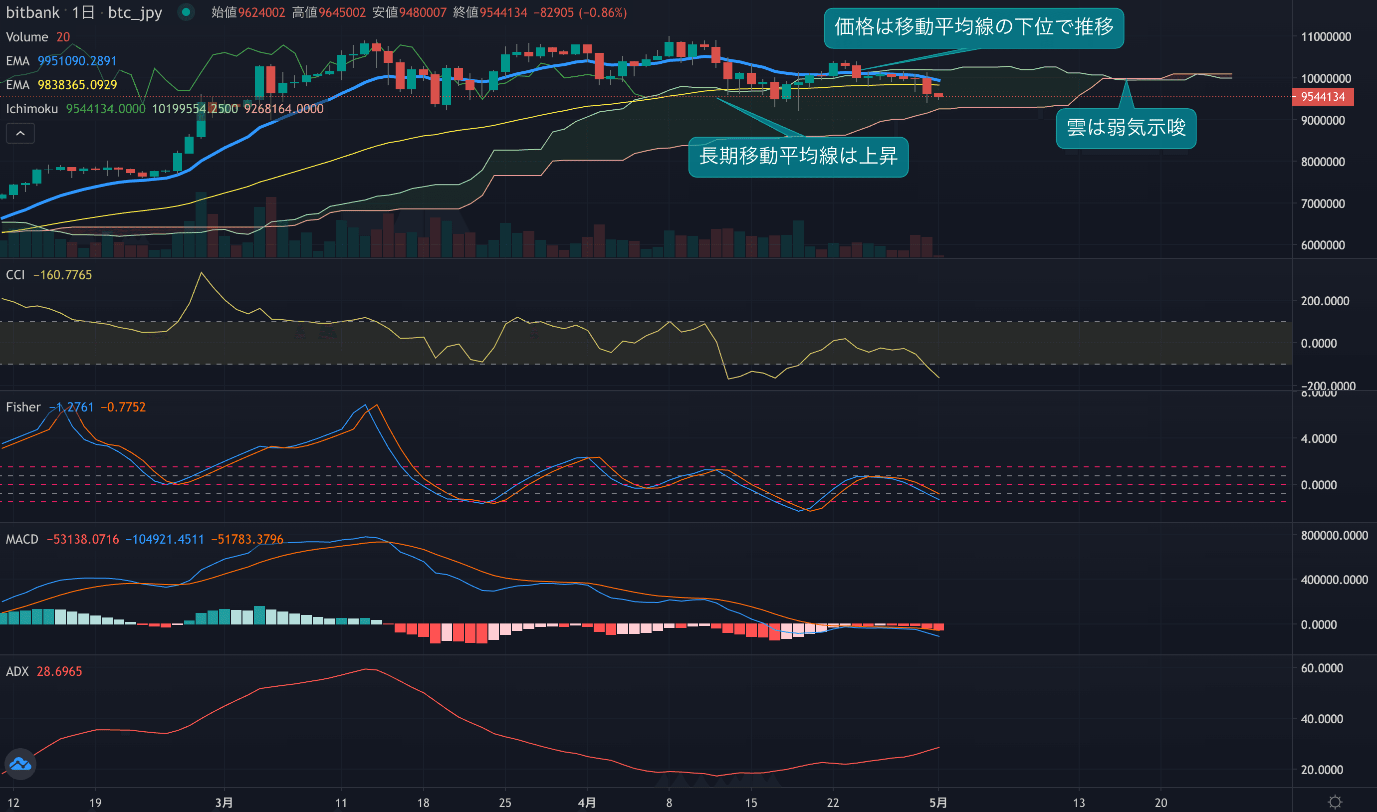 - オシレーター系インジケーターは下落が明確化しています。CCIは弱気圏となり-100を下回っています。Fisherはマイナス圏で下落しています。長期オシレーターのMACDは先週ゴールデンクロスが成立せず、再度下落し始めました。
