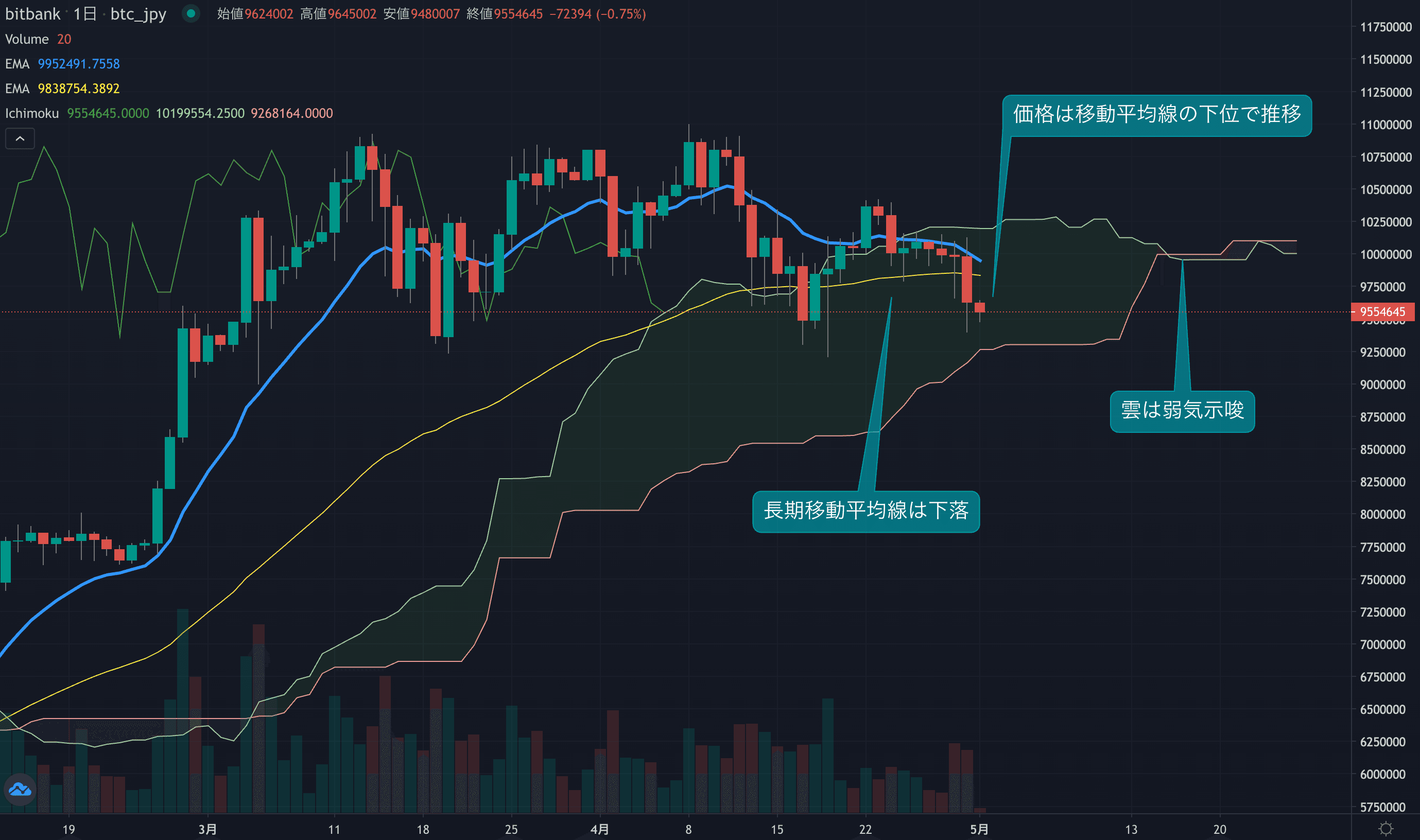 - 昨日のビットコインは3.5%下落し、終値は962.7万円でした。日足は足元で上値が重い動きとなり4日連続の陰線を記録しました。昨日は長期移動平均線も下回り、弱いプライスアクションとなっています。