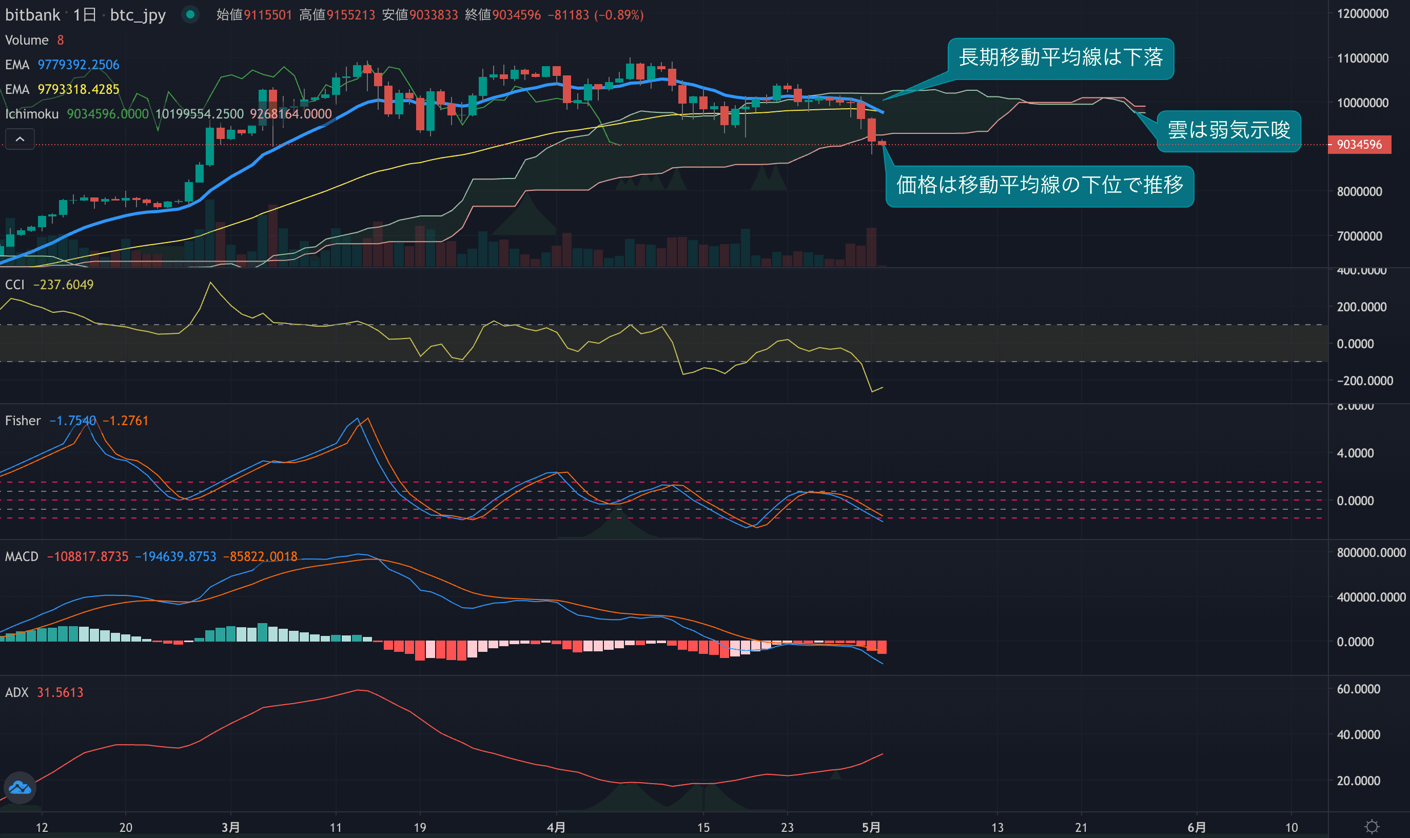 BTC相場は900万円を下回る、サポート割れで売りが急増