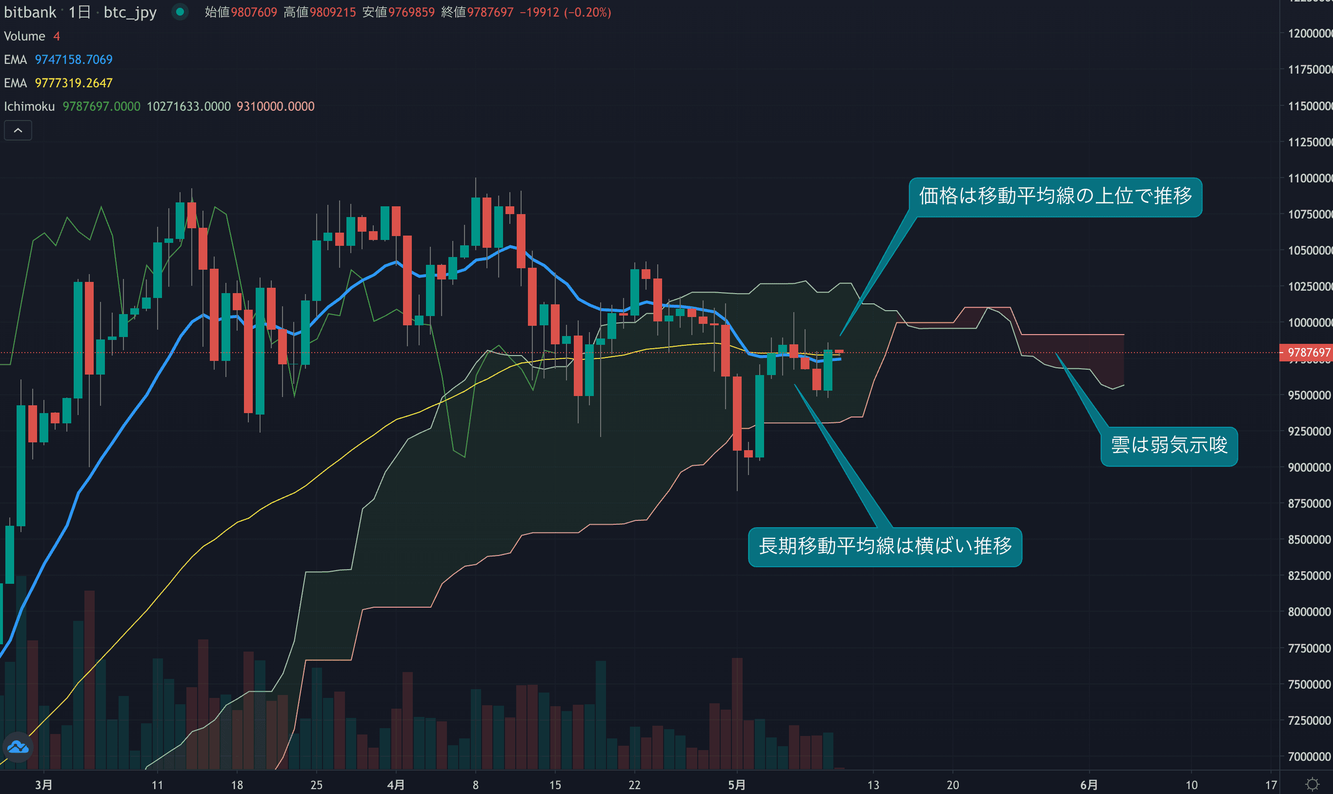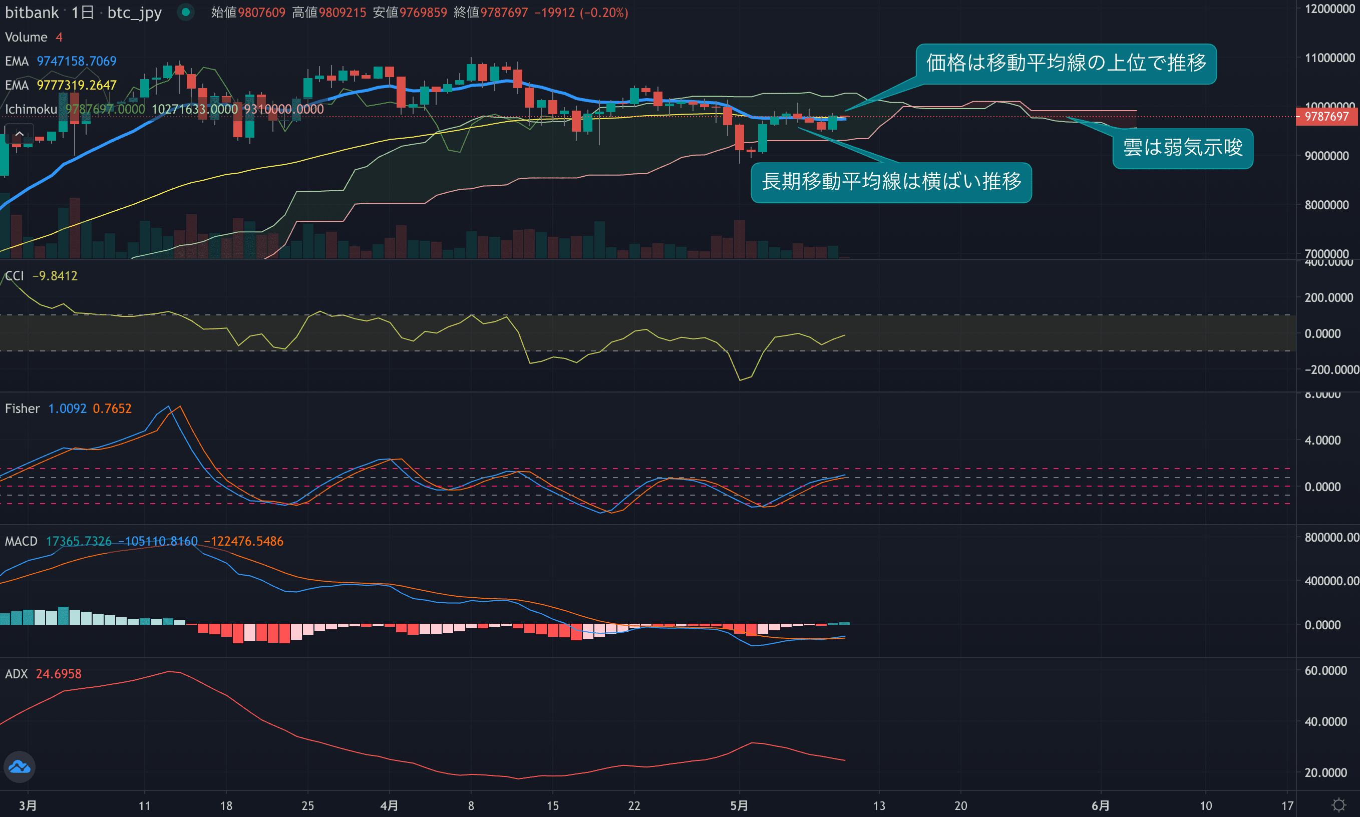 - 今週は上値が重い展開となっていましたが、昨日ようやく買い戻しが入り、底堅く推移しました。日足は移動平均線の上位に浮上し、オシレーターも上昇傾向にあることからテクニカル面では強気な相場状態となりました。一方、長期的にはADXが下落していることから、調整局面の範囲にあることを示しています。今年2月にはADXが10を下回る水準まで相場が調整したこともあり、来週以降も調整局面が続く可能性があります。一目均衡表の雲の上限である1020万円台を抜けるまでは、中長期的な相場感は様子見となるでしょう。