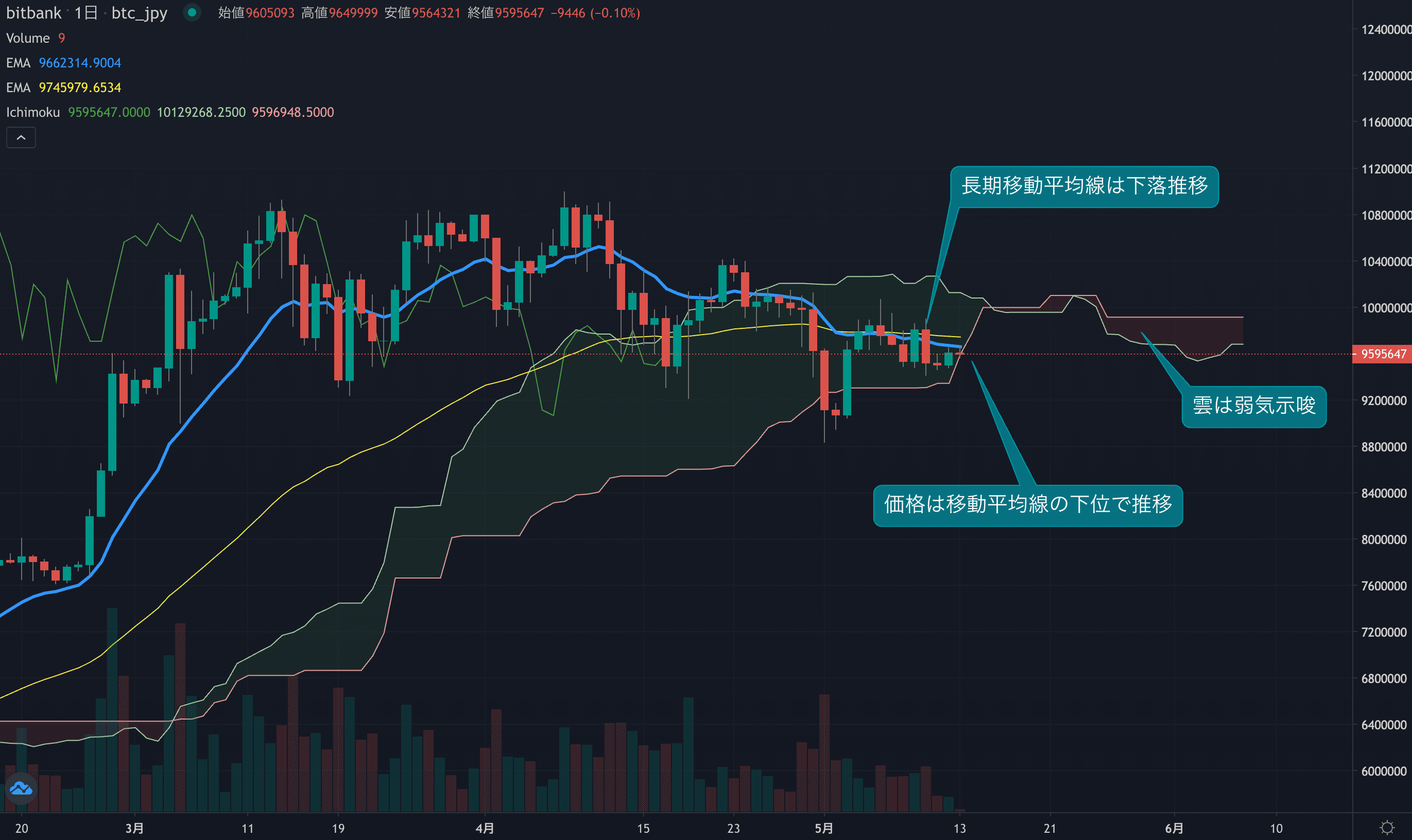 - 価格は14EMA(967.2万円)を下回り弱気示唆です。53EMA(975.1万円)は下落しており、長期トレンドも弱気です。一目均衡表の雲は先行スパン1(968.3万円)が先行スパン2(991.6万円)を下回り弱気示唆です。