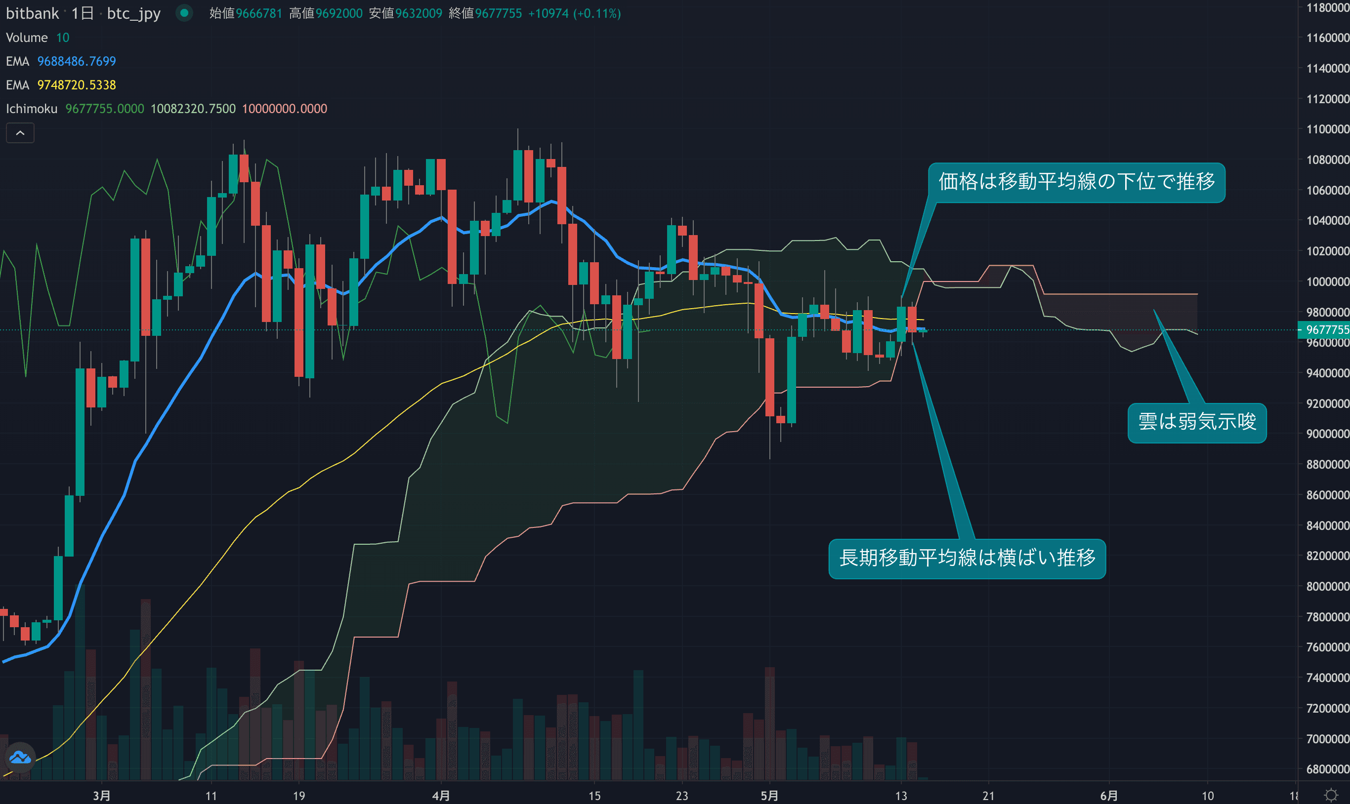 - 価格は14EMA(969.0万円)を下回り弱気示唆です。53EMA(975.1万円)は横ばい推移し、長期トレンドは中立です。一目均衡表の雲は先行スパン1(968.3万円)が先行スパン2(991.6万円)を下回り弱気示唆です。