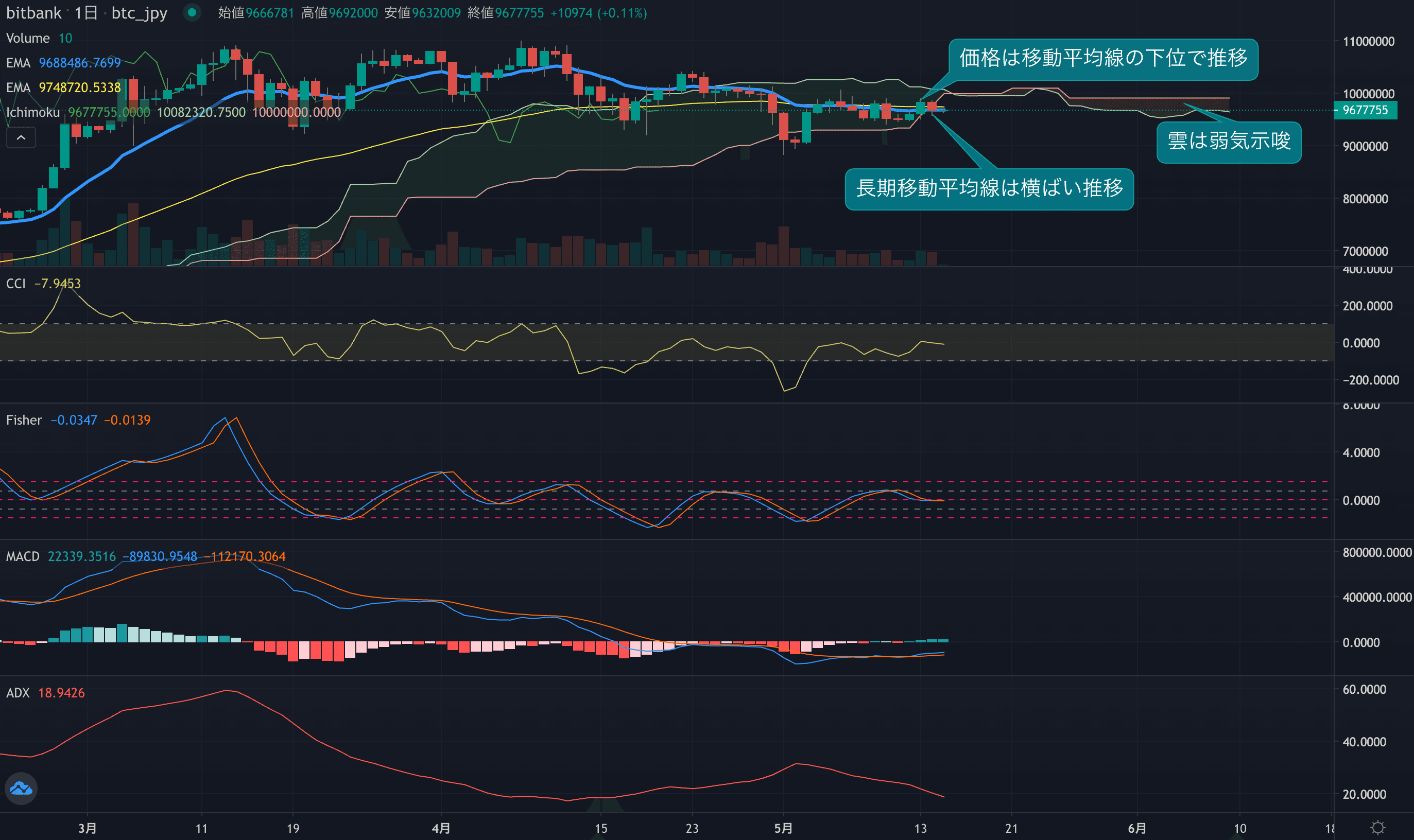 - オシレーター系インジケーターは、長期で上昇していますが、短期では反落の兆しがあります。CCIは僅かに下落し、マイナスで推移。Fisherは昨日の価格下落でゴールデンクロスが成立しませんでした。長期オシレーターのMACDはマイナス圏で上昇しています。
