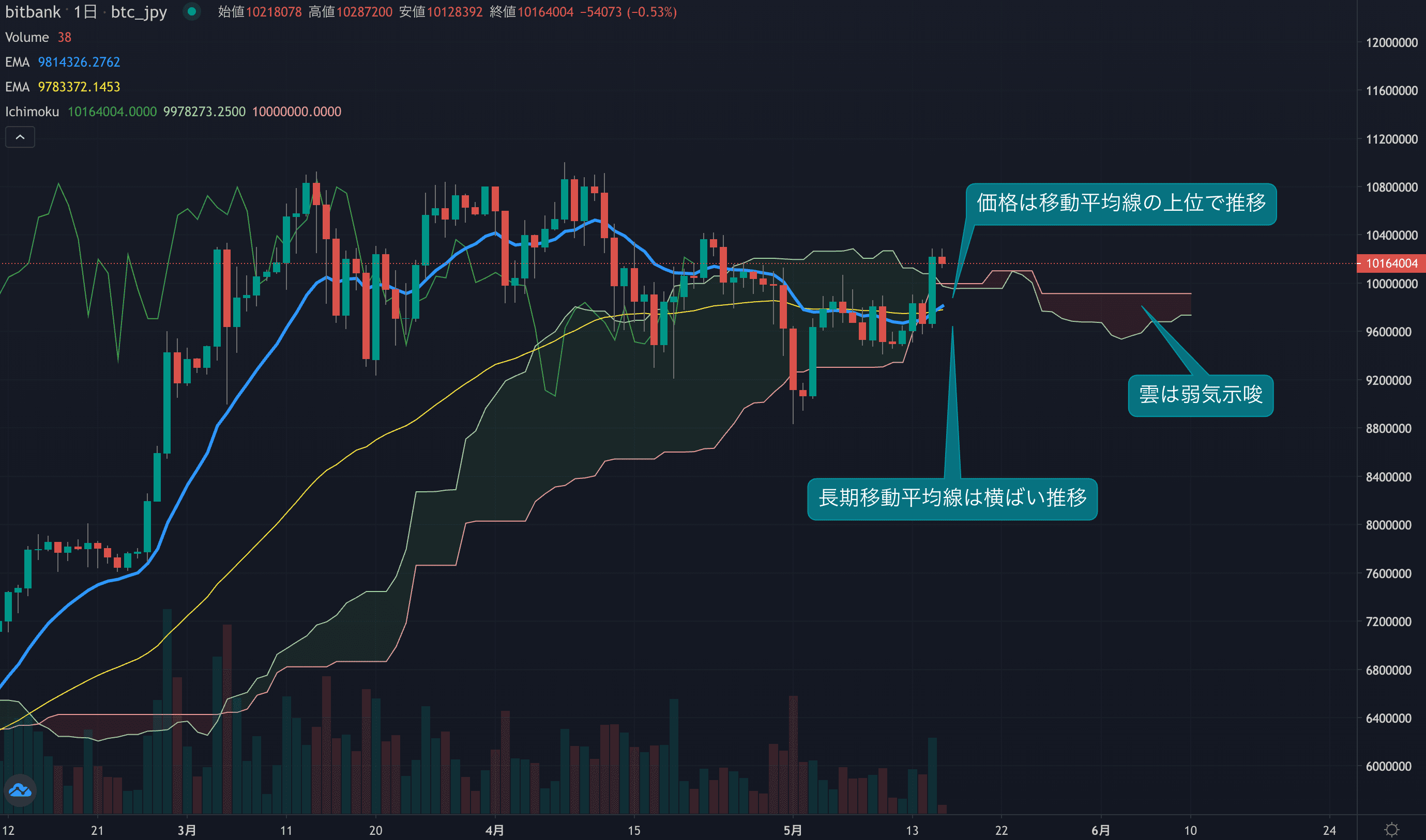 - 昨日のビットコインは強い買いが入り、日足は一目均衡表の雲を上抜けました。オシレーターも上昇しており、短期相場は上昇局面入りしています。ここ2週間の高値を更新しており、底堅い推移がみられます。調整局面が終了し、上昇トレンドが始まった可能性があります。再度上昇トレンド入りとなると、今後は最高値の1000万円台後半を目指す展開が予想されます。