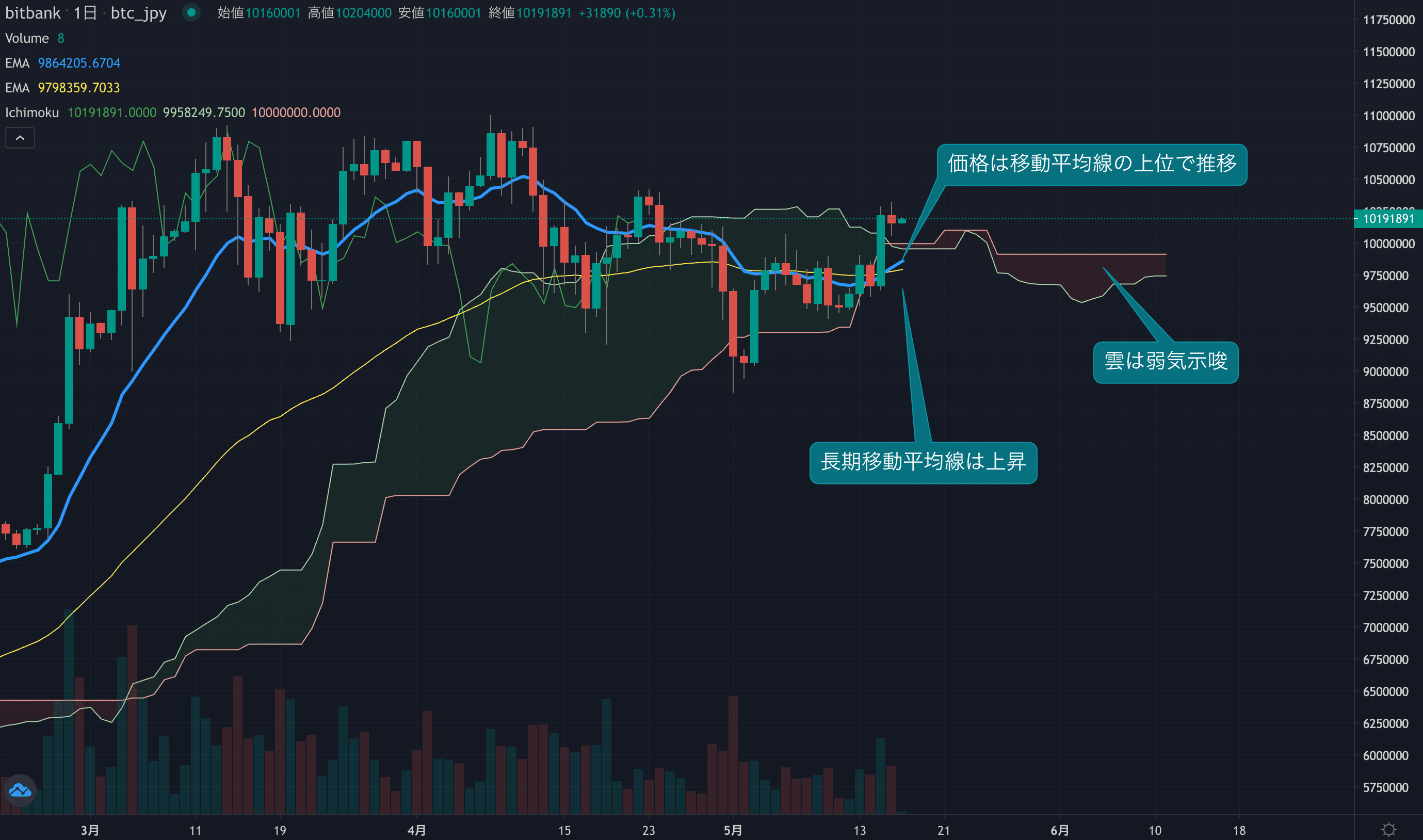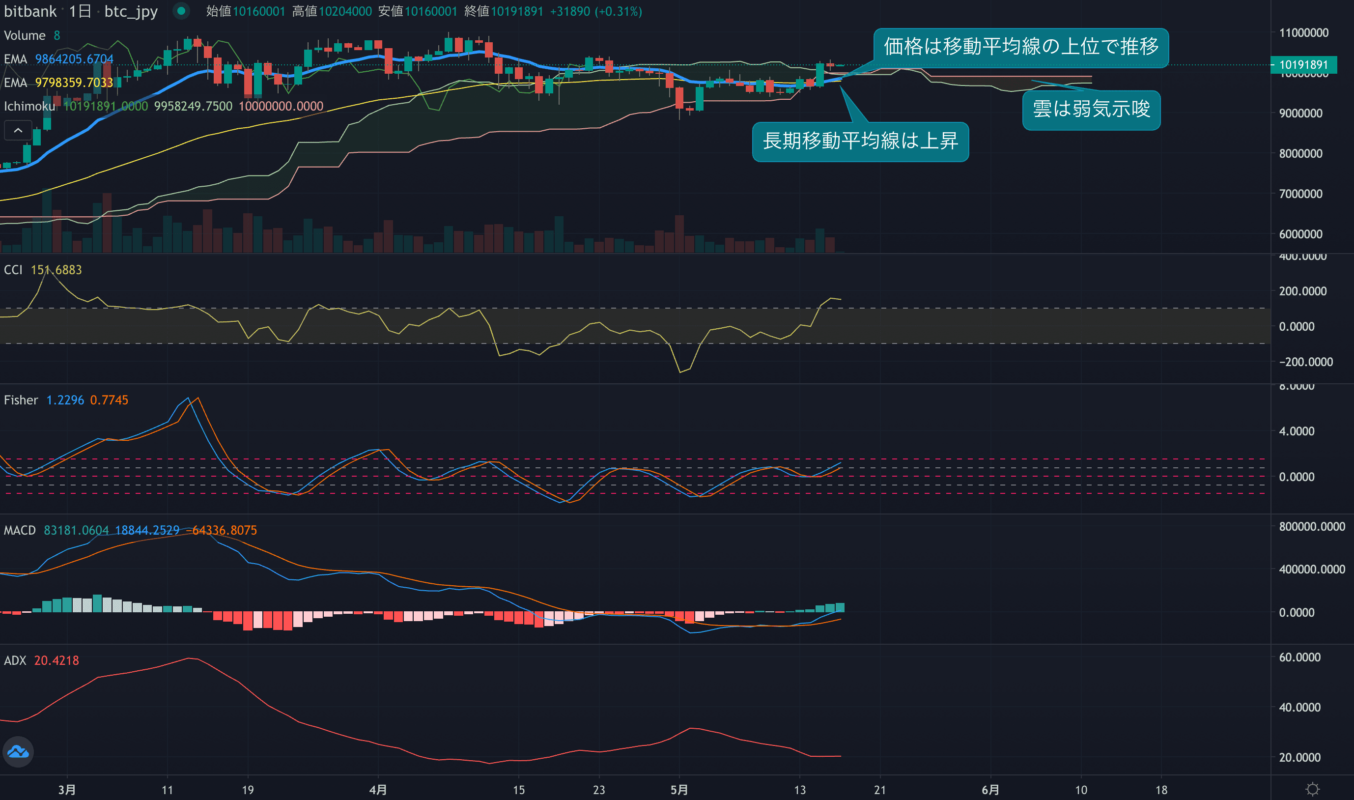 - 昨日のビットコインは0.5%下落し、終値は1016.0万円でした。相場は小幅に売られましたが1000万円台を維持しました。日足は長短期の移動平均線を上回っており、強気の値動きとなっています。