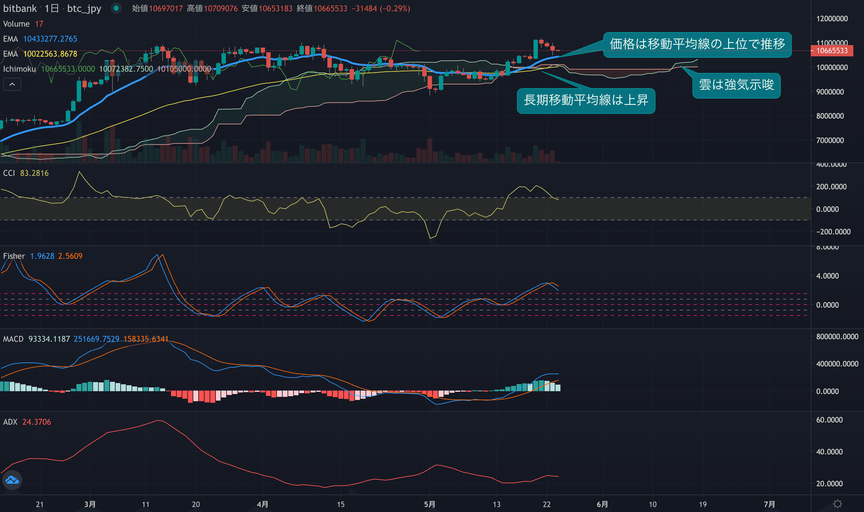 - 昨日のビットコインは1.4%下落し、終値は1069.7万円でした。ここ3日間ほど上値が重い動きとなっており、昨日は一時1050万円近辺まで下落しました。一方、移動平均線の上位は維持されています。