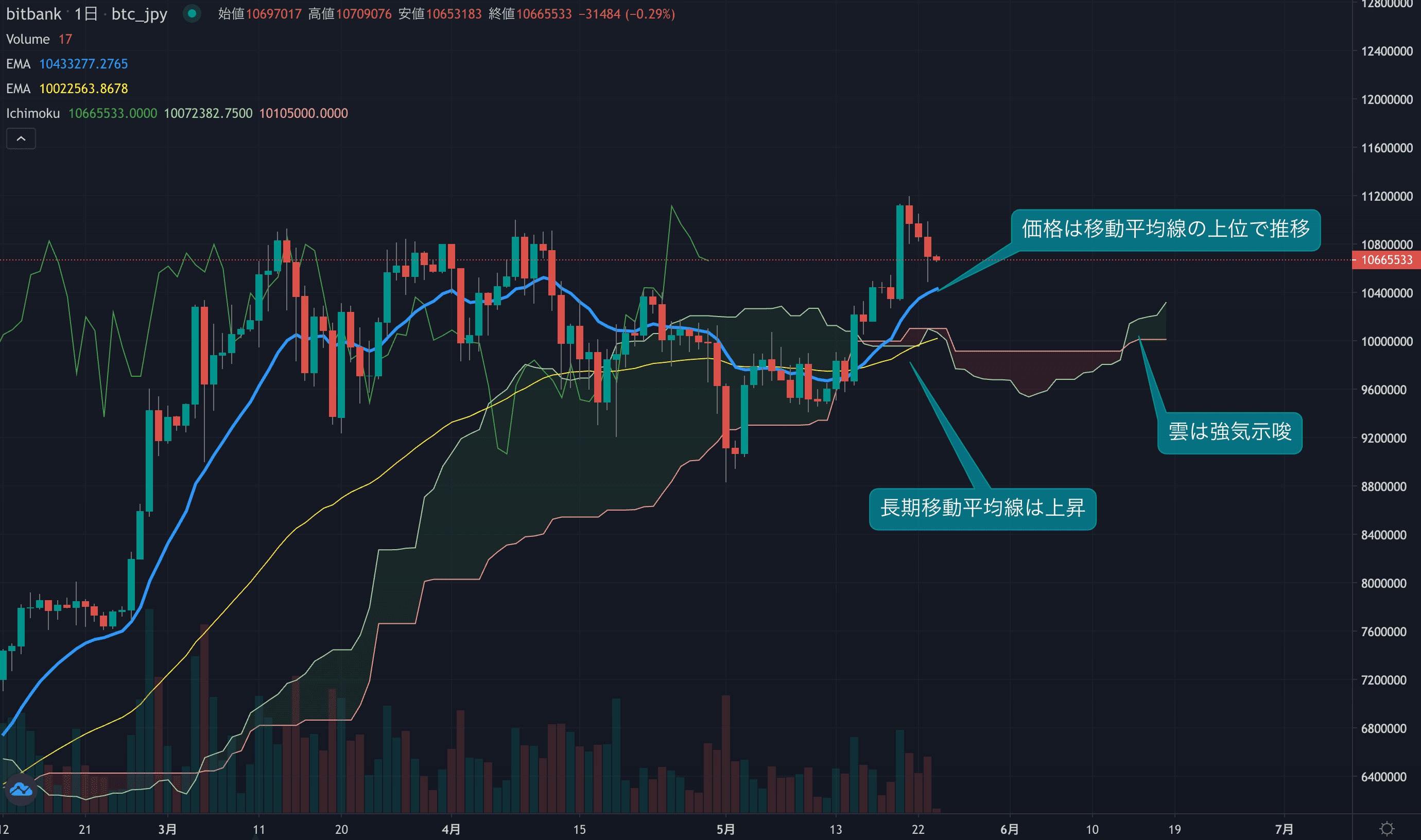 - 価格は14EMA(1039.7万円)を上回り強気示唆です。53EMA(999.7万円)は上昇しており、長期トレンドも強気です。一目均衡表の雲は先行スパン1(1021.3万円)が先行スパン2(1001.4万円)を上回り強気示唆です。