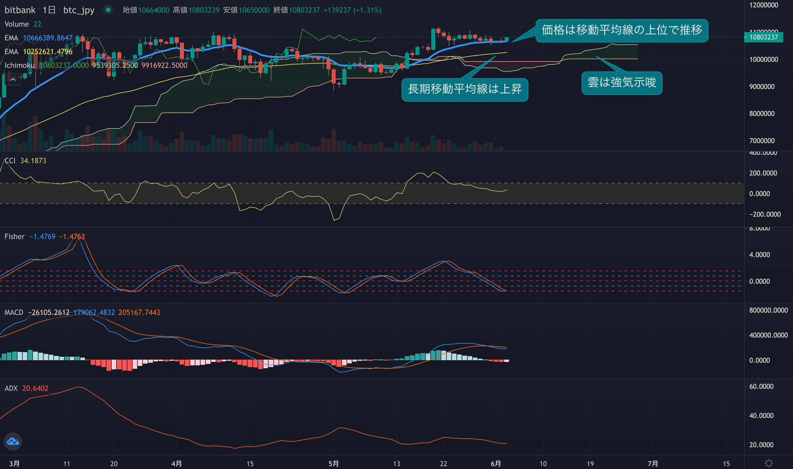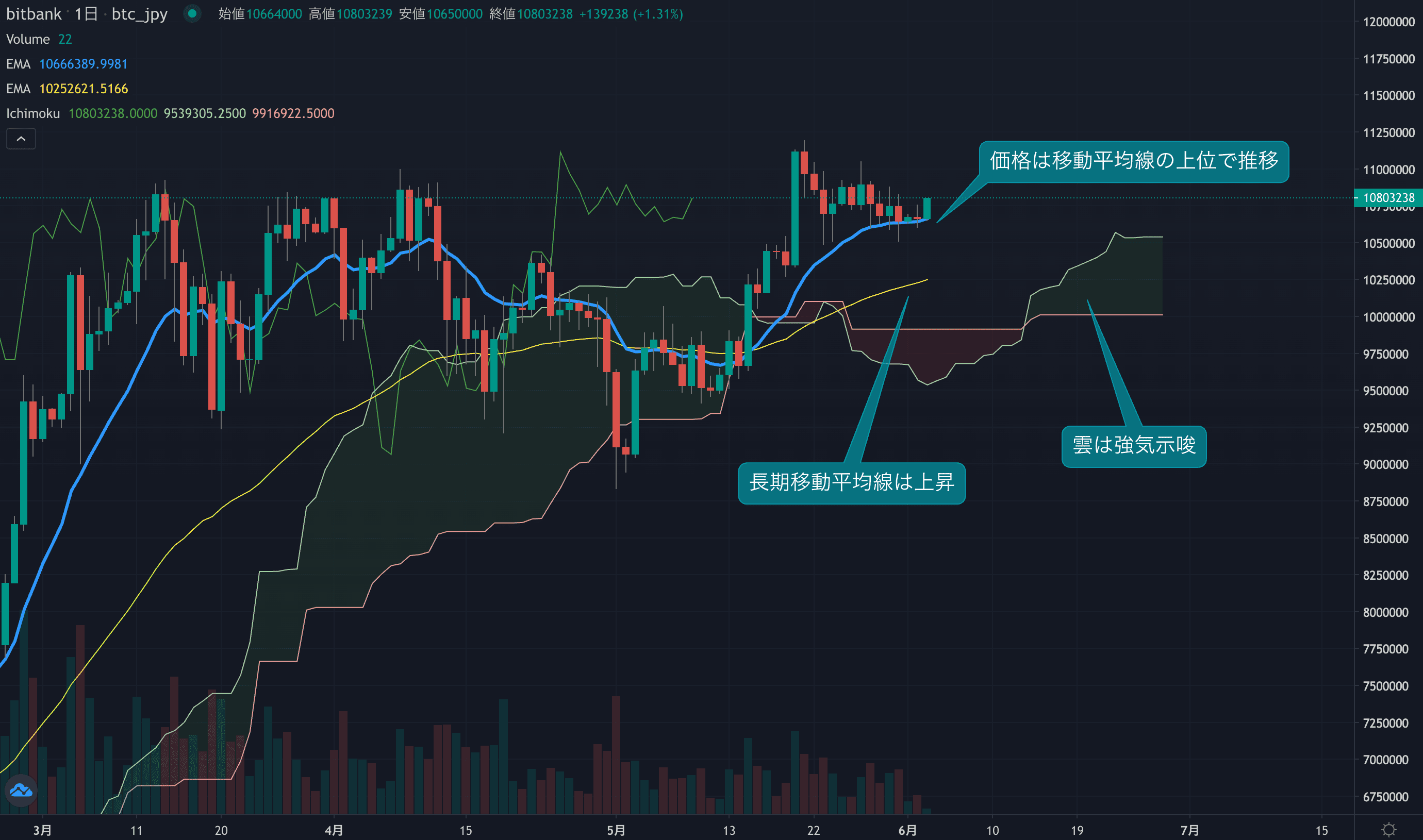 - 価格は14EMA(1064.5万円)を上回り強気示唆です。53EMA(1023.1万円)は上昇しており、長期トレンドも強気です。一目均衡表の雲は先行スパン1(1054.1万円)が先行スパン2(1001.4万円)を上回り強気示唆です。