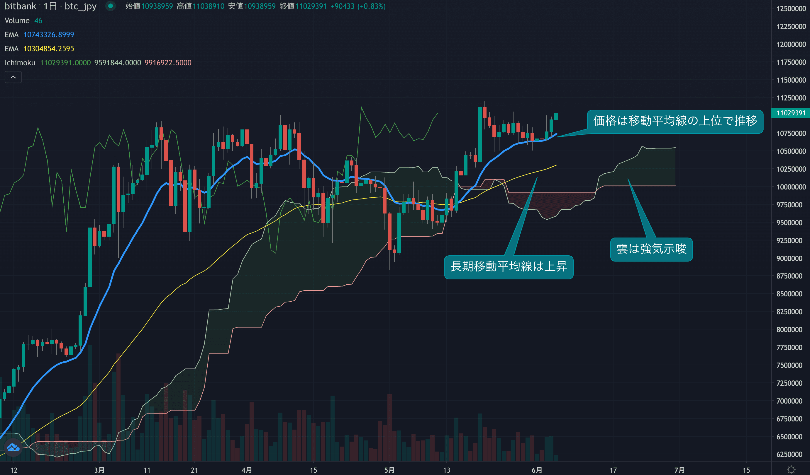 - 価格は14EMA(1069.9万円)を上回り強気示唆です。53EMA(1027.6万円)は上昇しており、長期トレンドも強気です。一目均衡表の雲は先行スパン1(1054.1万円)が先行スパン2(1001.4万円)を上回り強気示唆です。