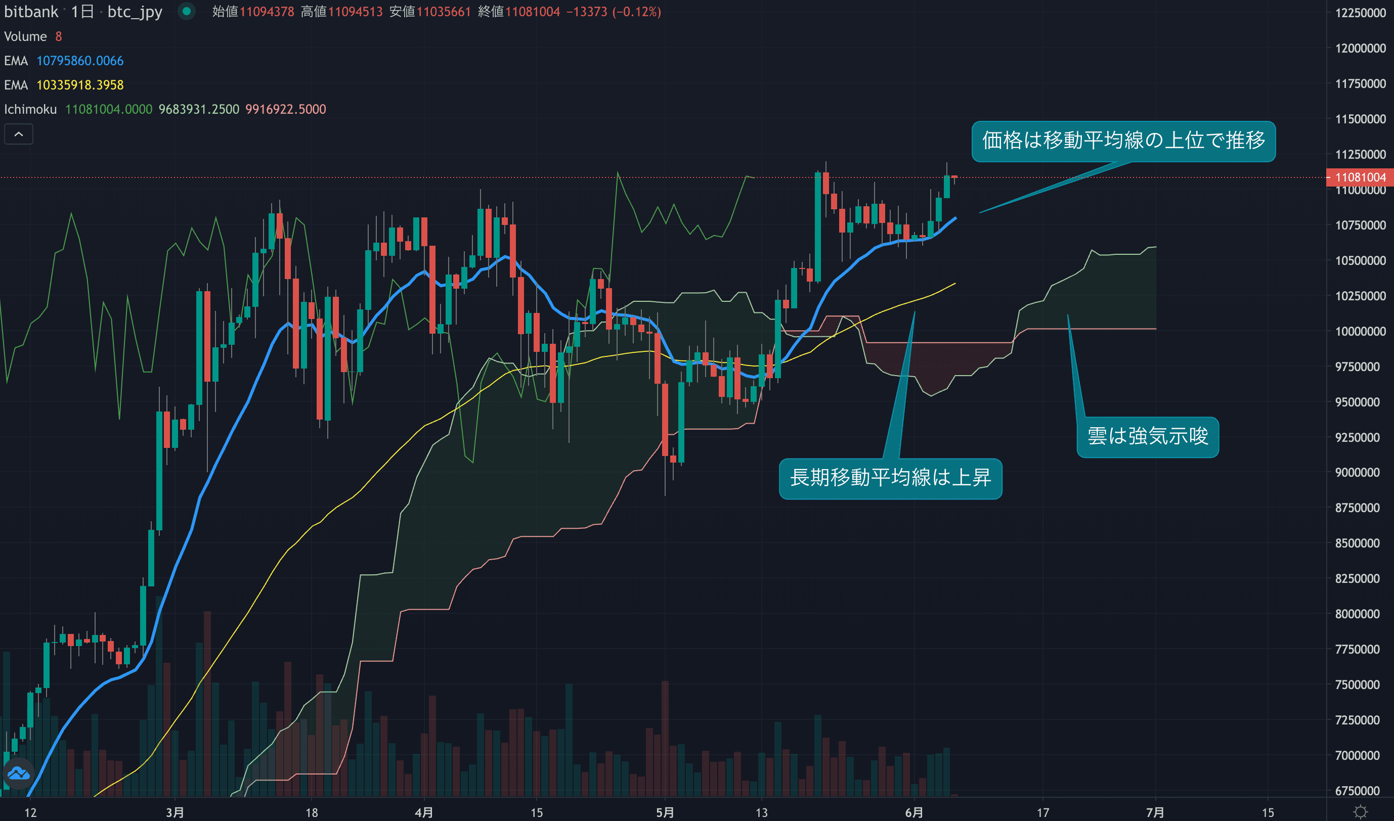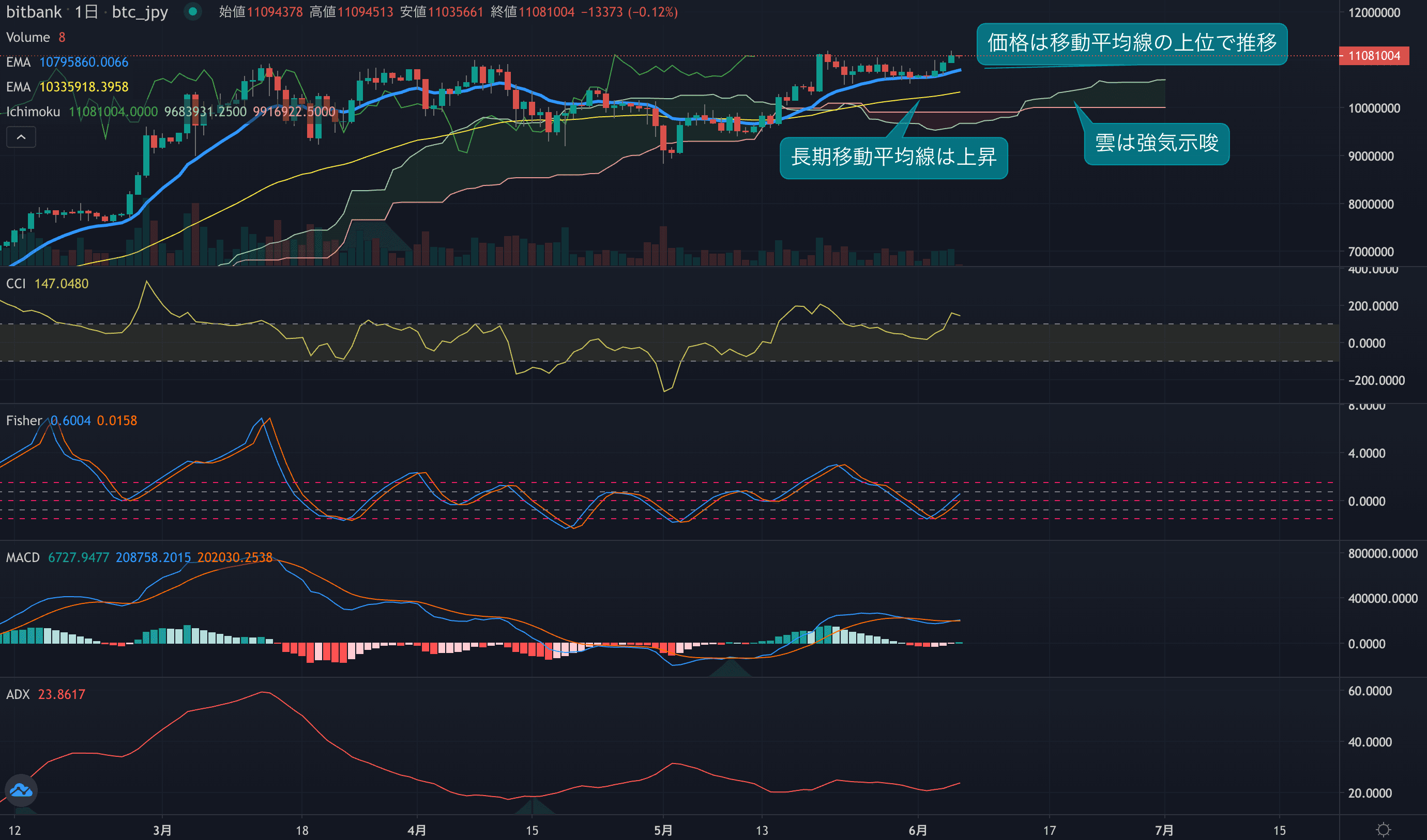 価格は終値で1100万円にタッチ、日足は底堅い動き続く