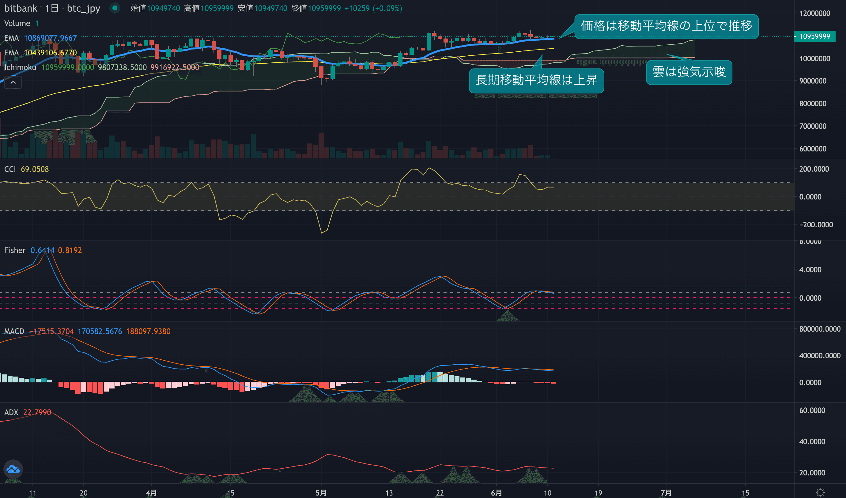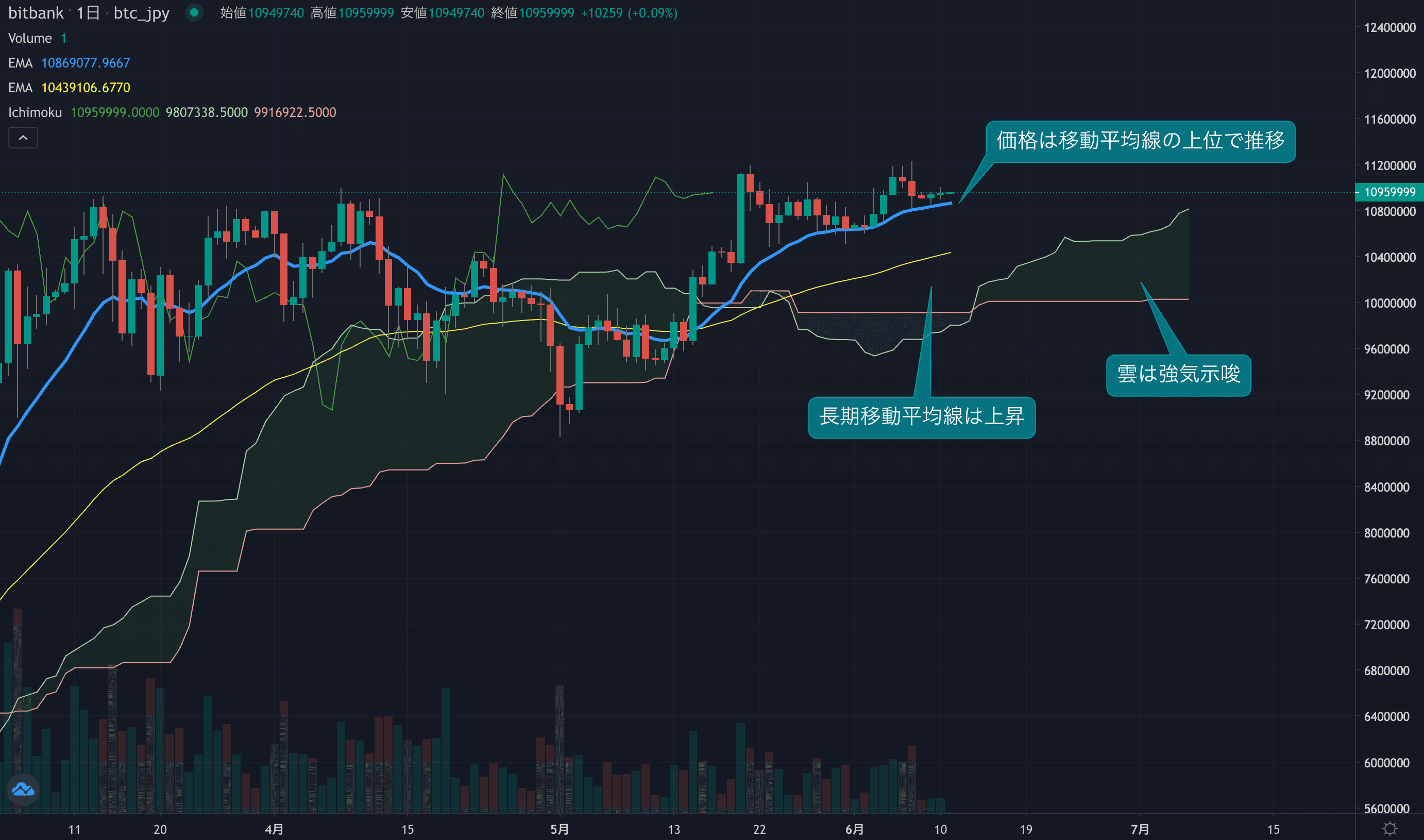 - 価格は14EMA(1085.5万円)を上回り強気示唆です。53EMA(1041.9万円)は上昇しており、長期トレンドも強気です。一目均衡表の雲は先行スパン1(1077.9万円)が先行スパン2(1003.1万円)を上回り強気示唆です。