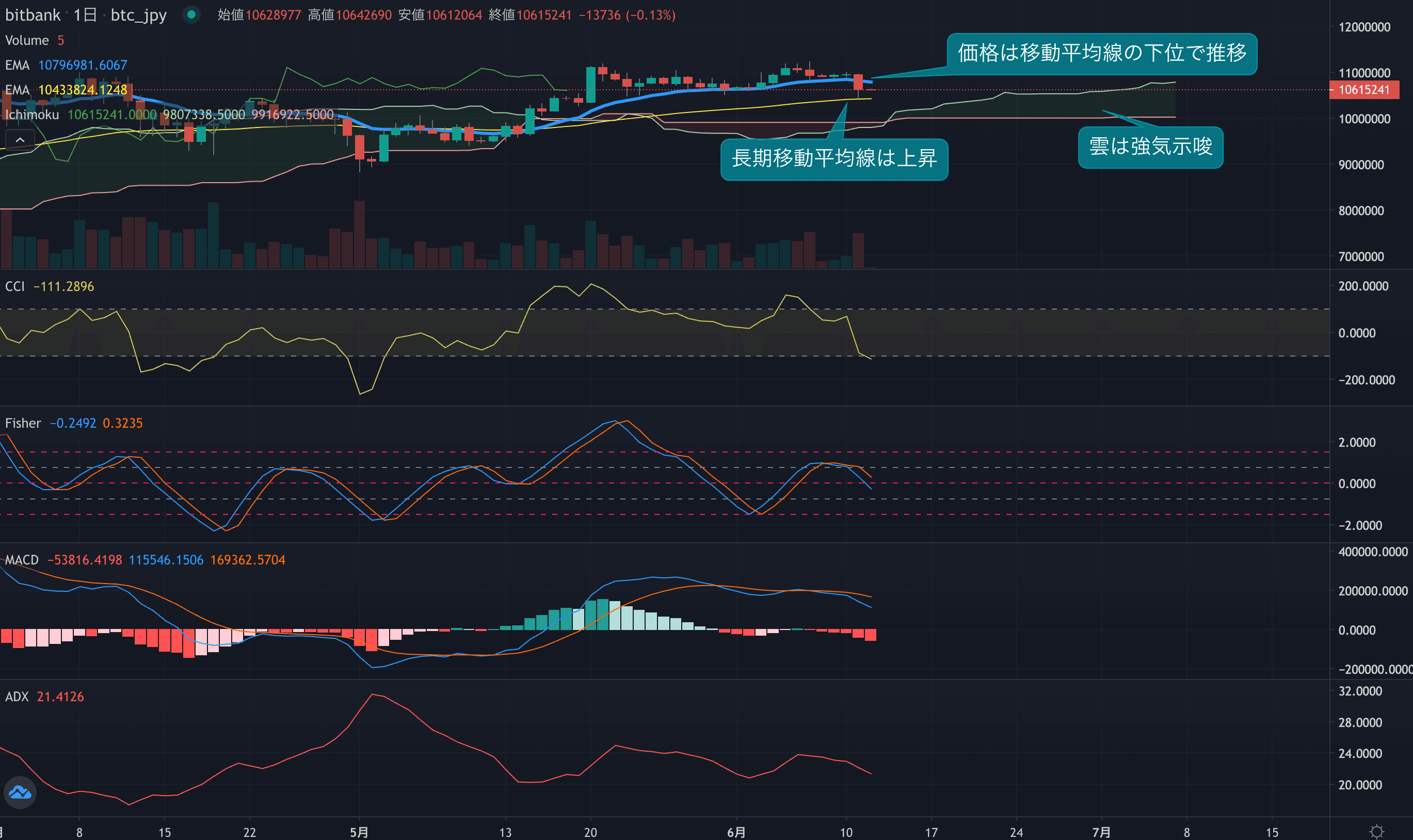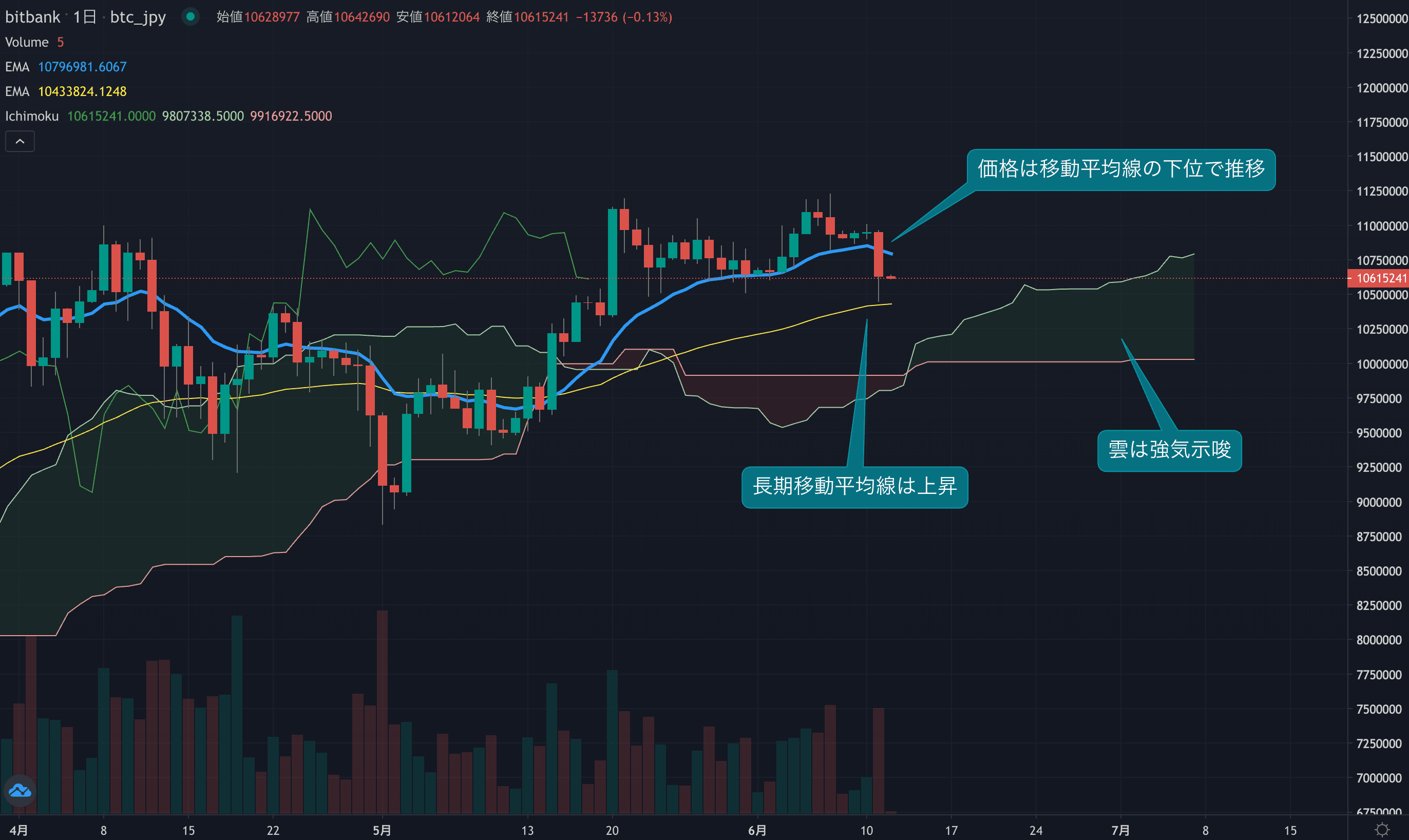 - 価格は14EMA(1082.4万円)を下回り弱気示唆です。53EMA(1042.6万円)は上昇しており、長期トレンドは強気です。一目均衡表の雲は先行スパン1(1076.7万円)が先行スパン2(1003.1万円)を上回り強気示唆です。