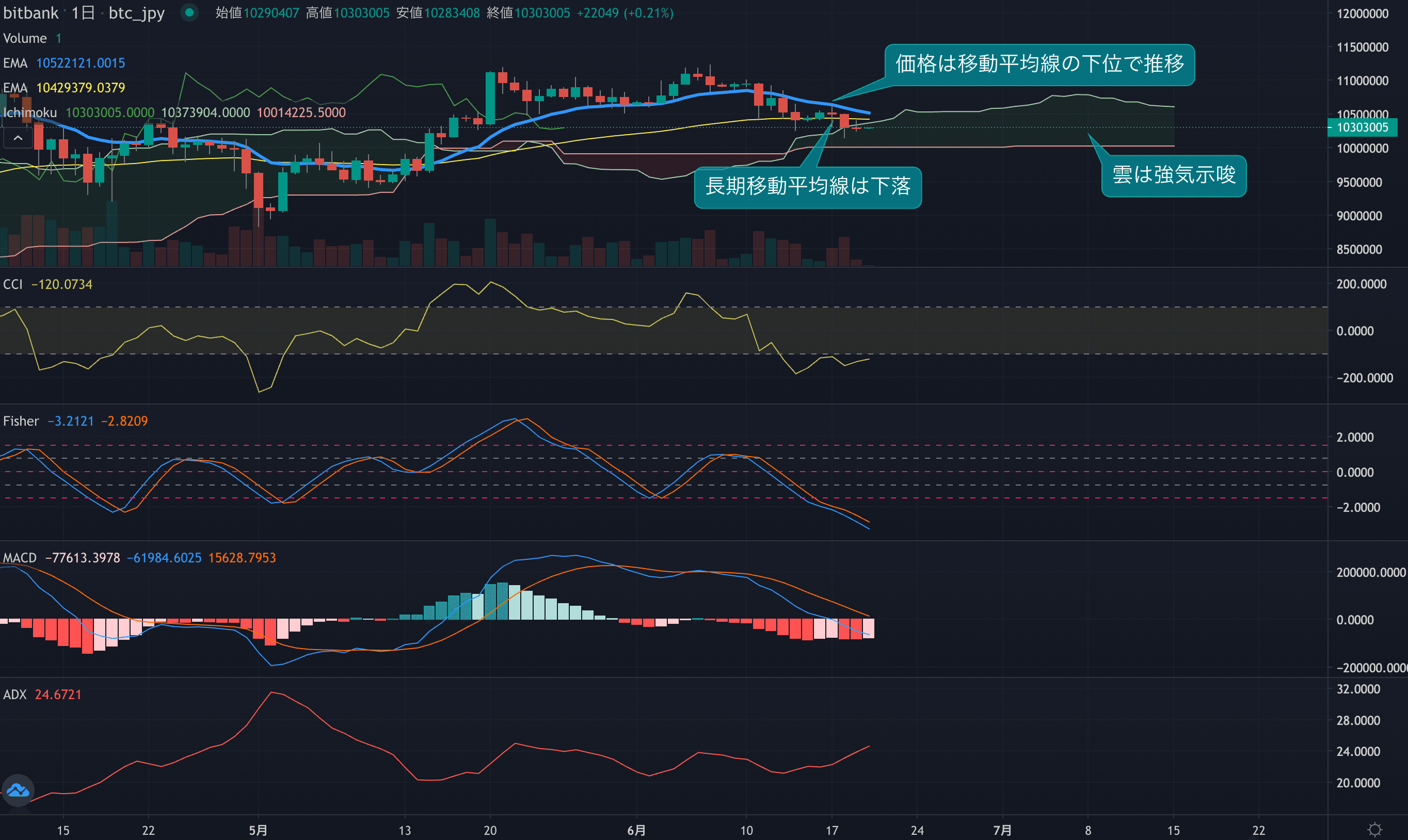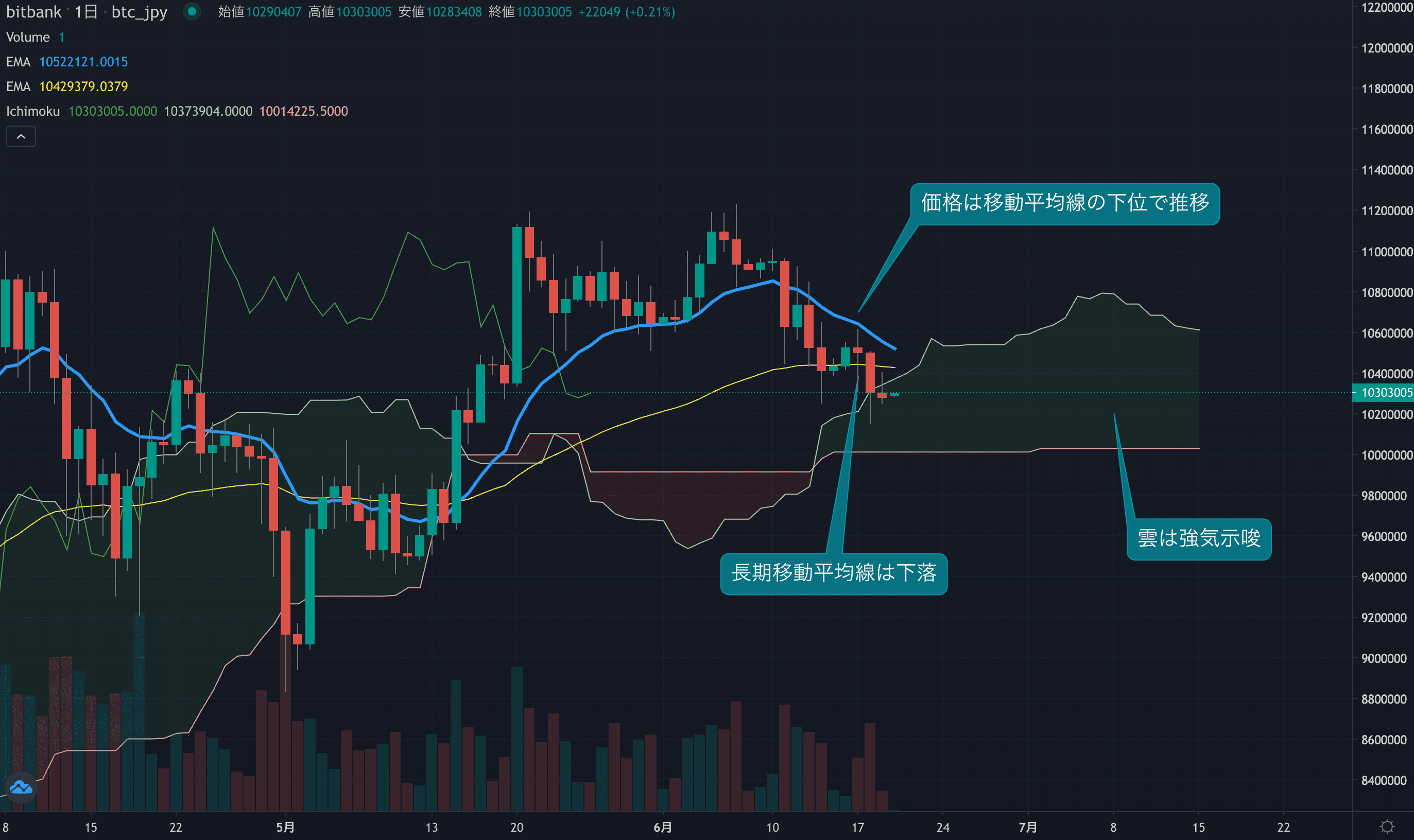 - 昨日のビットコインは0.1%下落し、終値は1028.8万円でした。今週は3日連続でマイナスとなっており、売りが優勢な状況となっています。日足は長期移動平均線を下回り、一目均衡表の雲の中で推移し始めました。