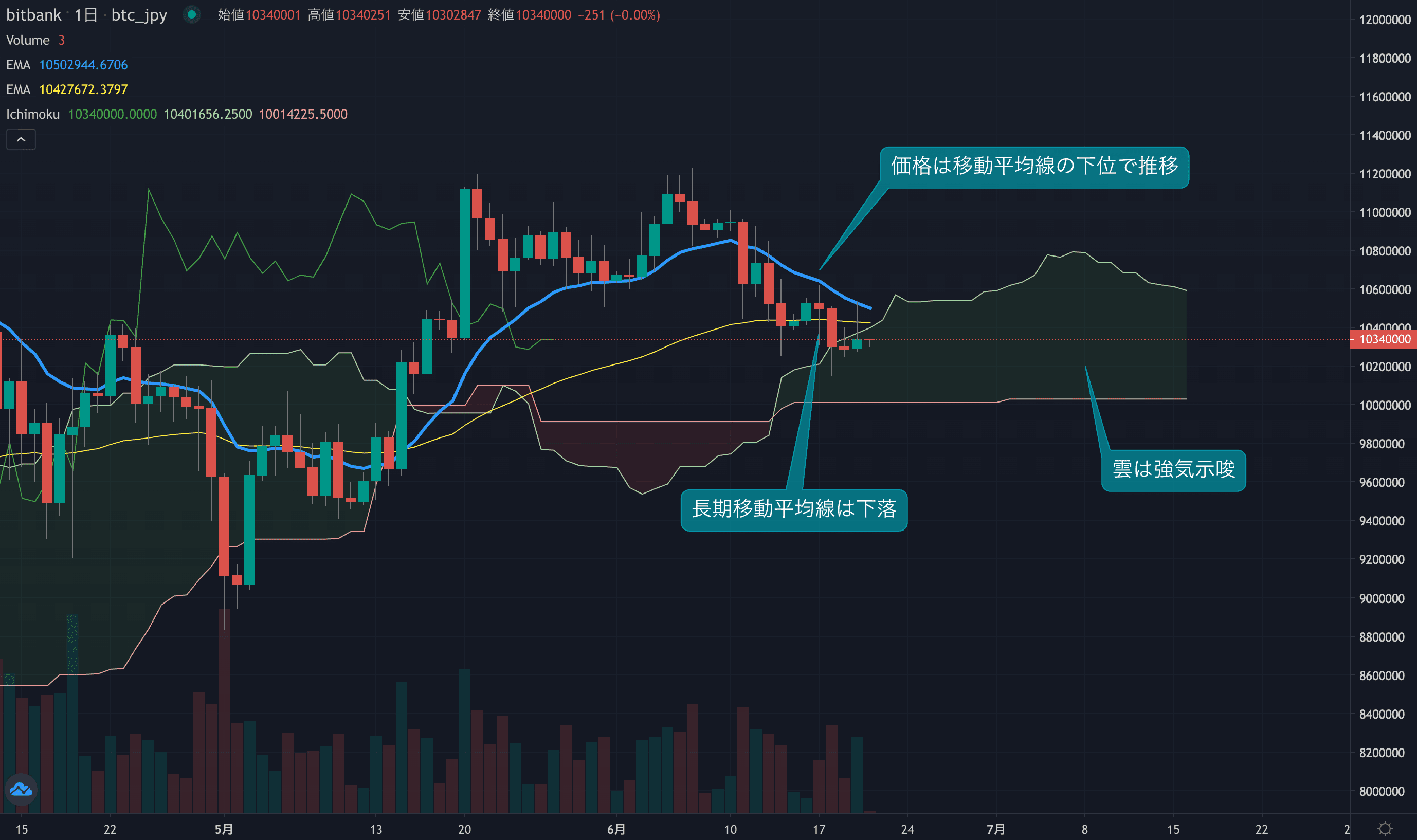 - 価格は14EMA(1052.8万円)を下回り弱気示唆です。53EMA(1043.1万円)は下落しており、長期トレンドも弱気です。一目均衡表の雲は先行スパン1(1061.4万円)が先行スパン2(1003.1万円)を上回り強気示唆です。