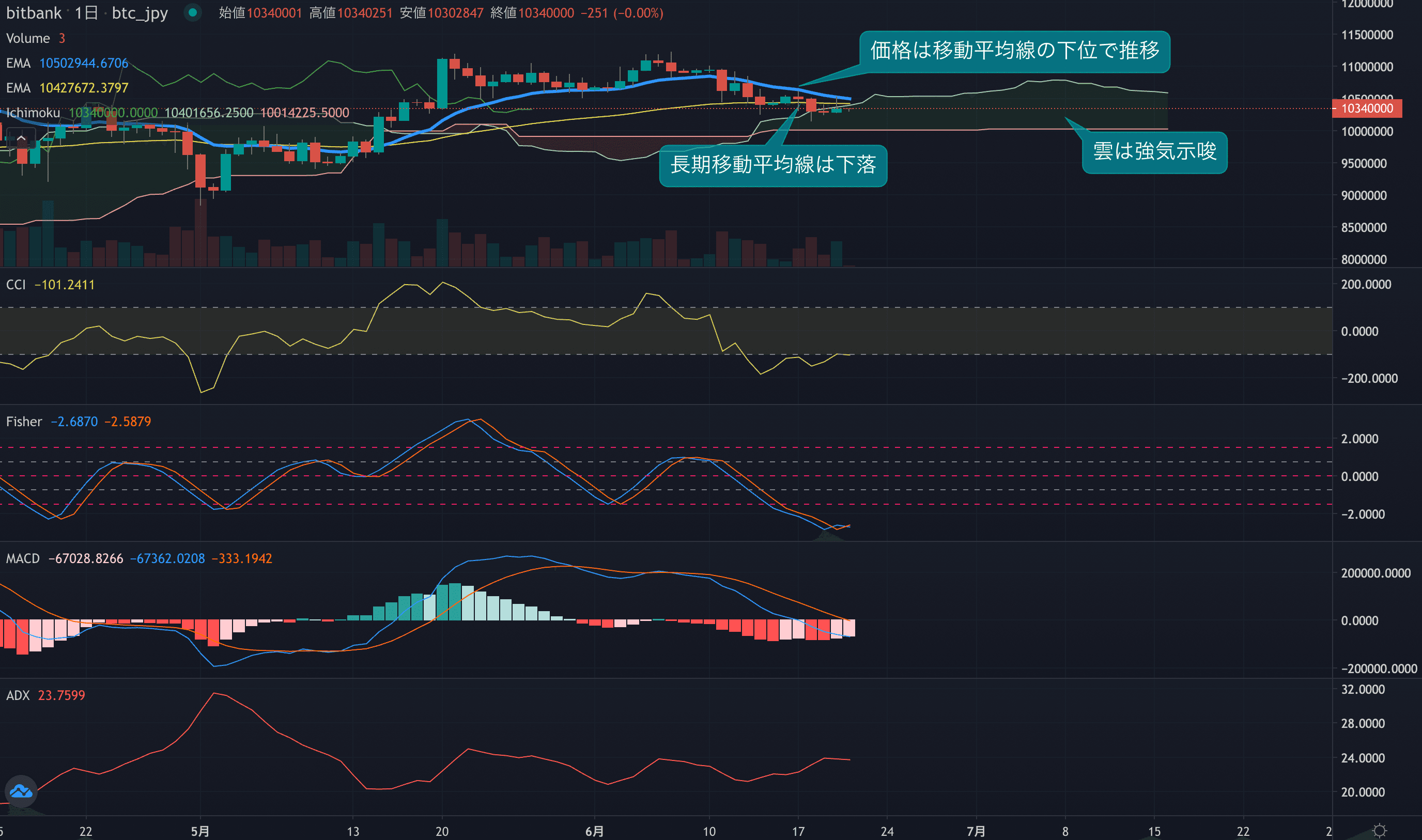 - 昨日のビットコインは0.5%上昇し、終値は1034.0万円でした。昨日は今週初となるプラスとなりました。価格は1050万円台を回復しましたが、終値にかけて上昇幅が縮小しました。短期移動平均線近辺から売られる形となりました。