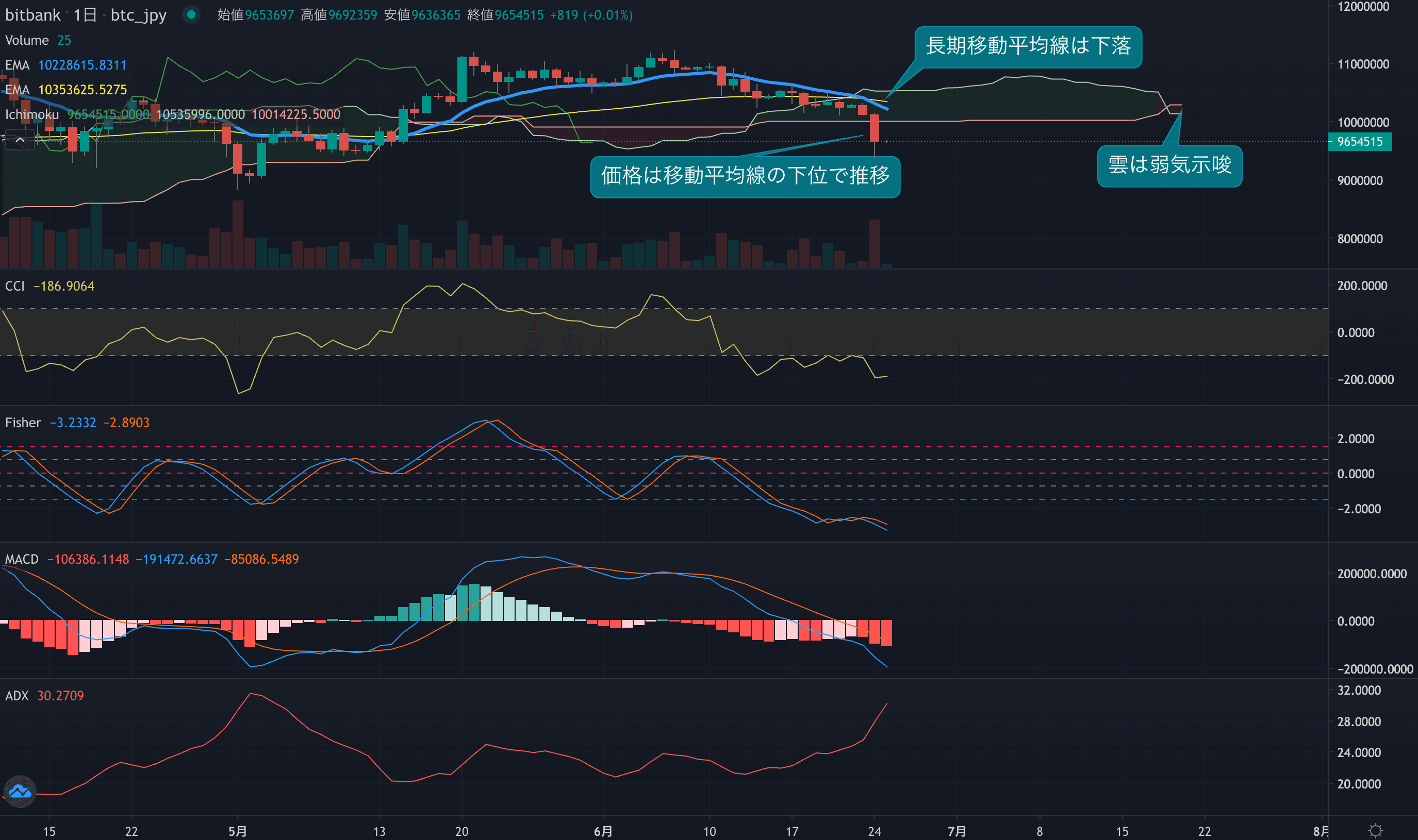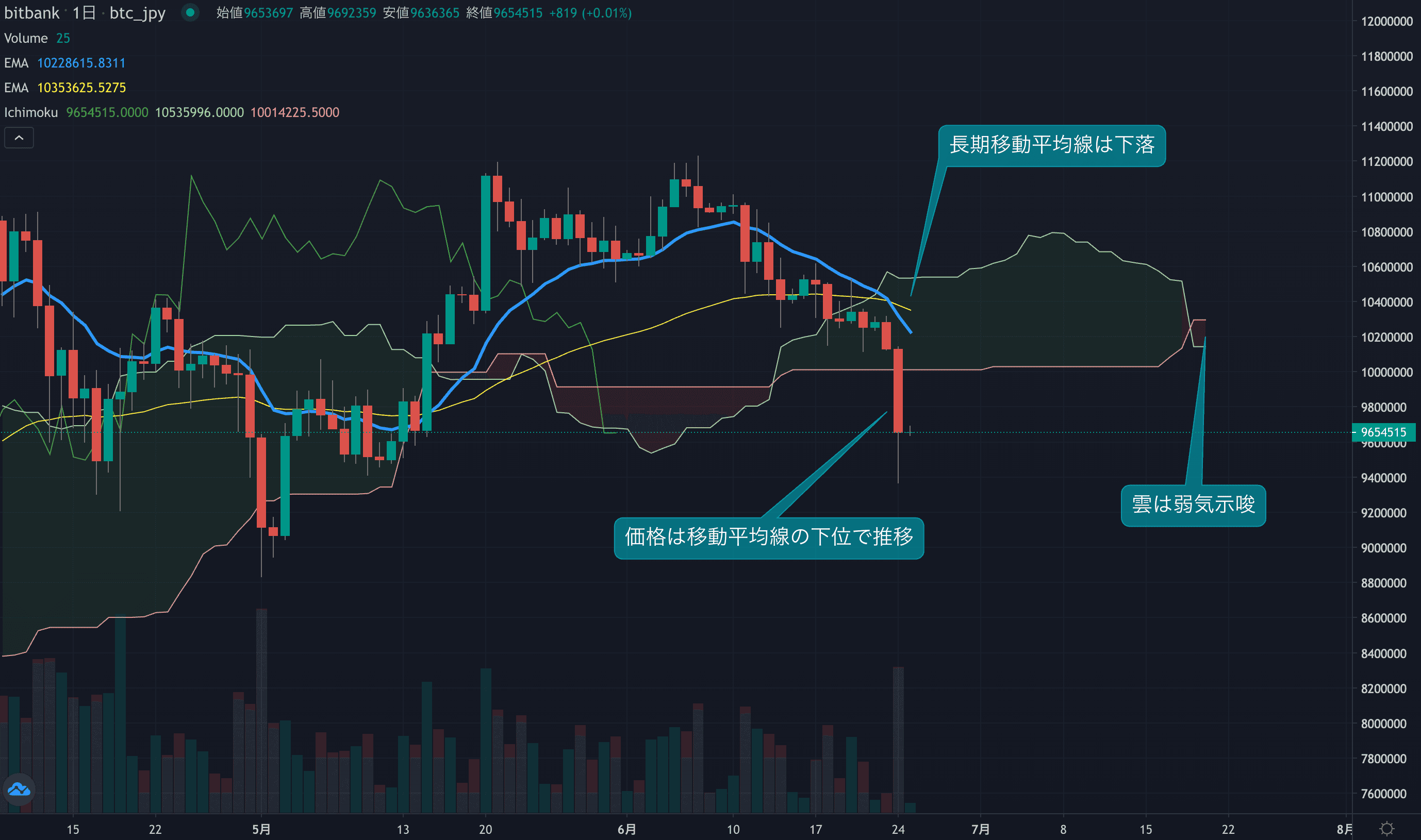 - 昨日のビットコインは4.6%下落し、終値は965.3万円でした。今週は月曜日から大きく下落する展開となりました。日足は一目均衡表の雲を下に抜け、1000万円を割り込みました。