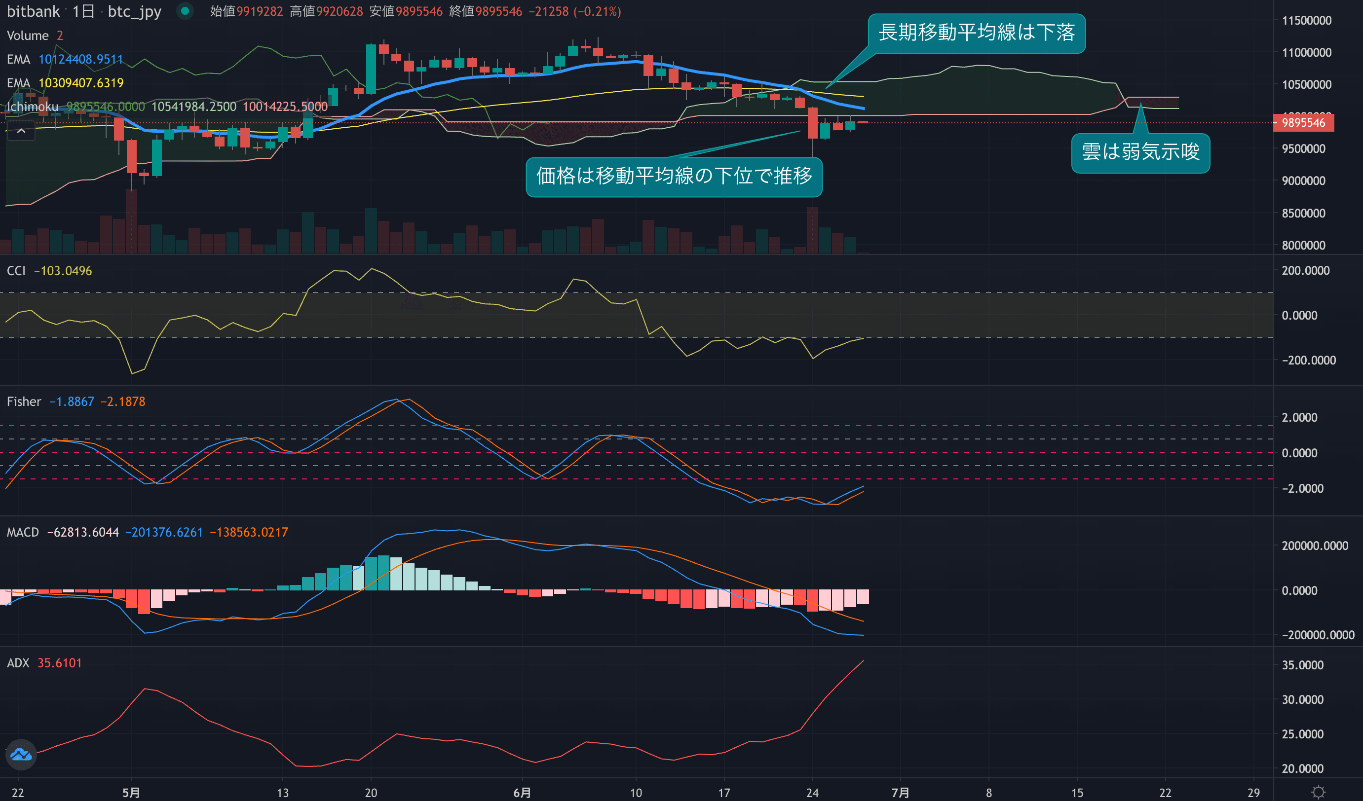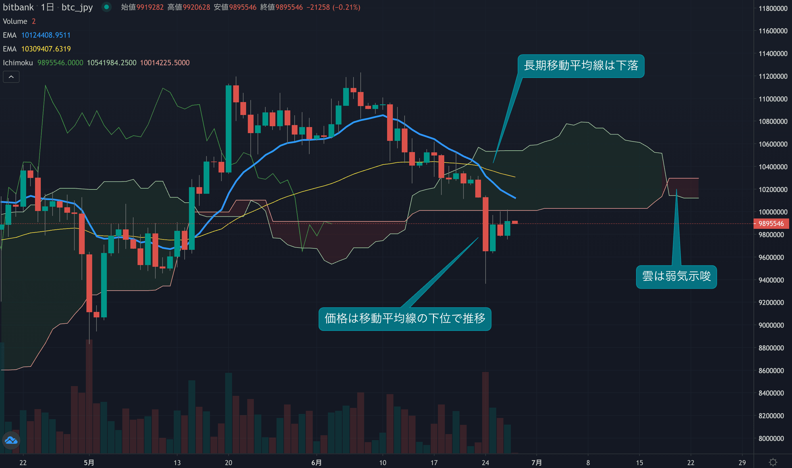 - 昨日のビットコインは1.3%上昇し、終値は991.6万円でした。価格は再度1000万円近辺まで上昇する場面がありましたが、終値ベースでは1000万円を超えることができませんでした。火曜日の終値とほぼ同じ水準となり、相場は横ばいです。日足は引き続き、移動平均線と雲の下位で推移しています。