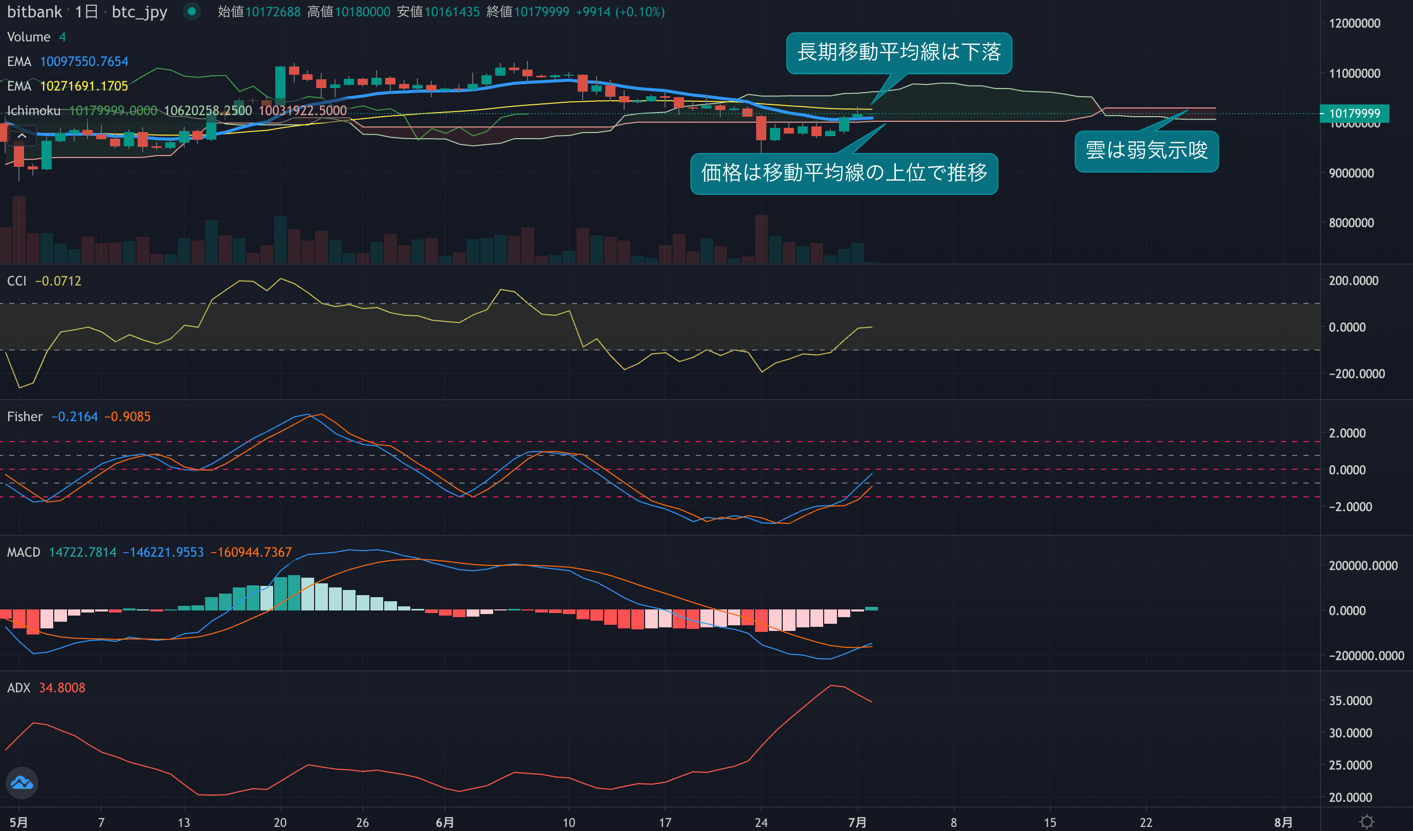- 今週のビットコインは週末からの買いの流れが月曜日も継続し、3日連続の陽線となりました。先週は前半戦から売られる動きとなりましたが、現在は反発する相場となっています。短期のオシレーターも上昇しており、テクニカルは改善しています。一方、昨日は1030万円近辺から上値が重くなる動きも見られ、長期的テクニカルが改善するには、この移動平均線を超えて行く必要があります。戻りが売りが意識されれば、再度下落の流れが発生する可能性もある価格帯です。上下どちらにも動きやすい価格帯であるため、慎重なポジション取りが求められます。