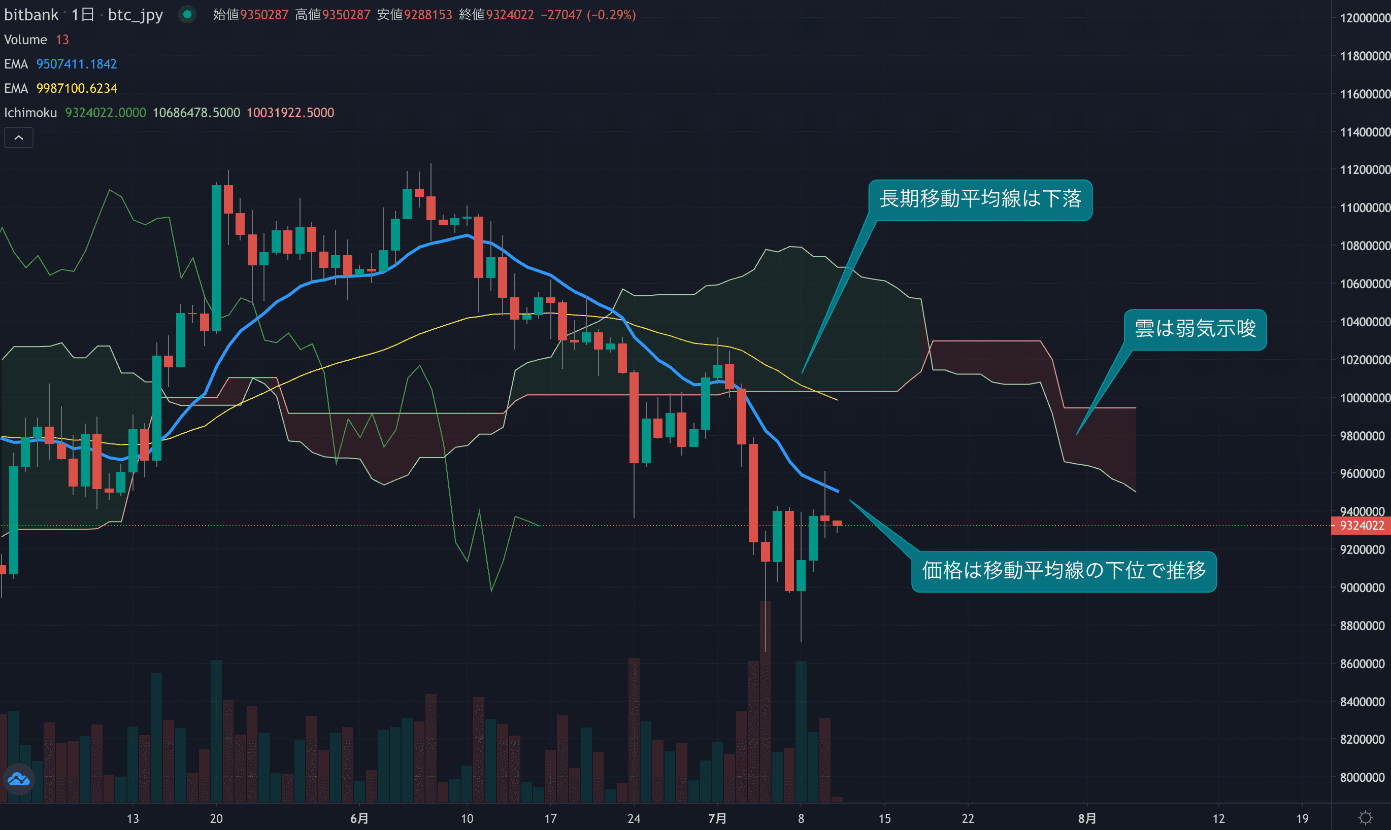 - 価格は14EMA(953.5万円)を下回り弱気示唆です。53EMA(1001.2万円)は下落しており、長期トレンドも弱気です。一目均衡表の雲は先行スパン1(954.6万円)が先行スパン2(994.5万円)を下回り弱気示唆です。