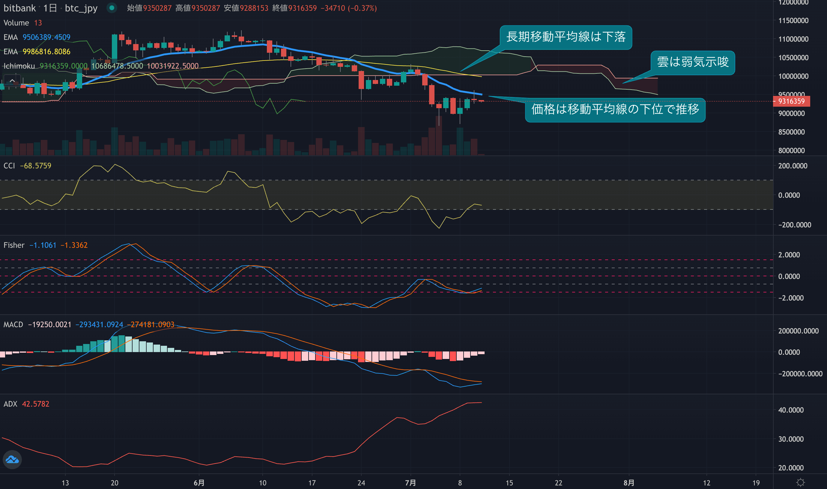 - 昨日のビットコインは0.2%下落し、終値は935.1万円でした。ほぼ横ばいとなりましたが、日足は長い上髭を付けたローソク足となりました。移動平均線近辺から戻り売りが発生しました。