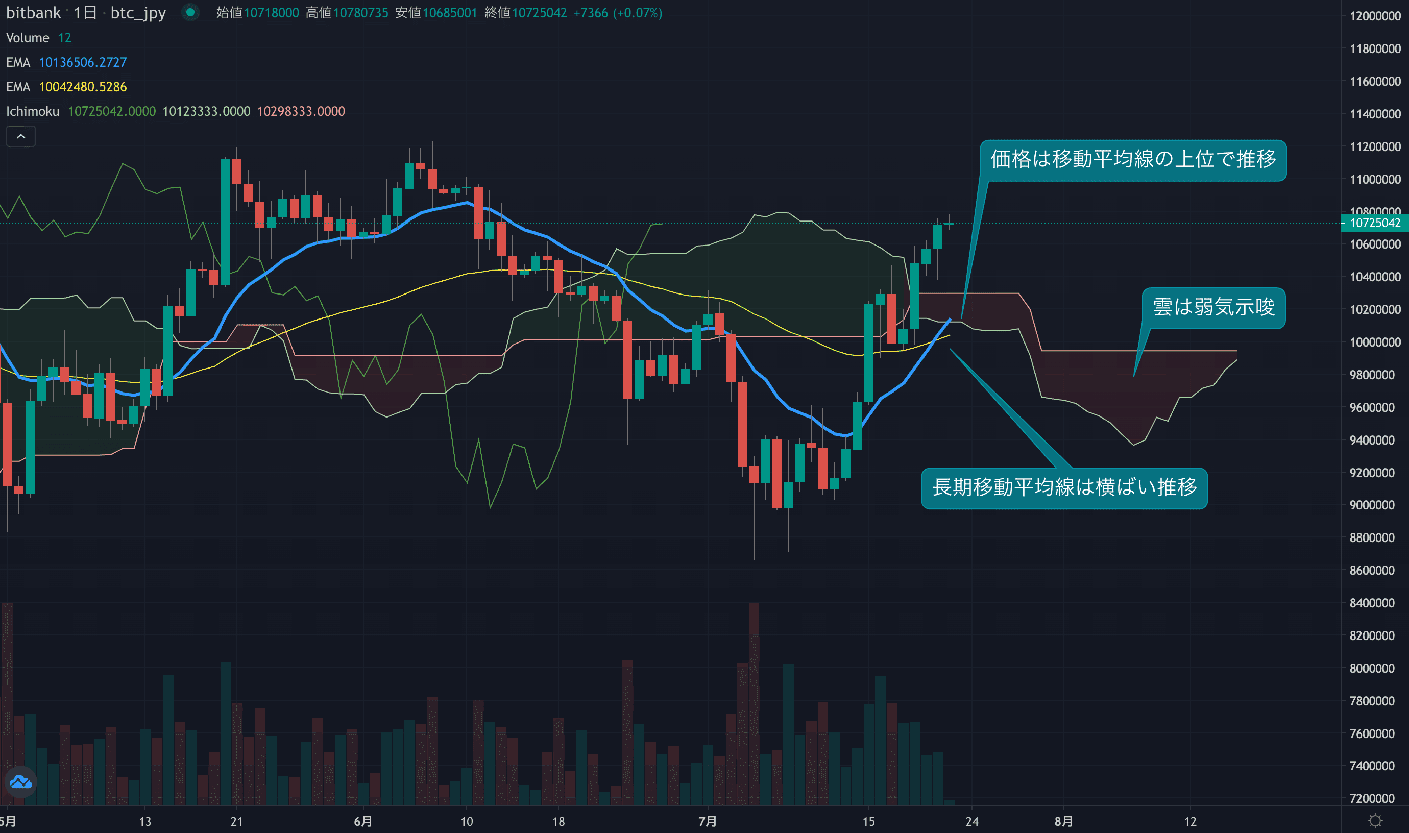 - 昨日のビットコインは1.3%上昇し、終値は1071.7万円でした。週末も底堅い動きとなり、先週後半から4日連続で陽線となりました。日足は一目均衡表の雲も上抜け、強い値動きとなっています。