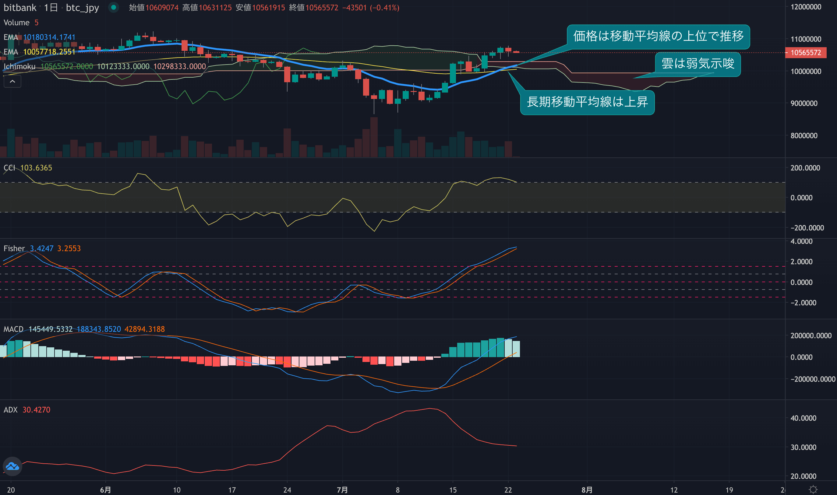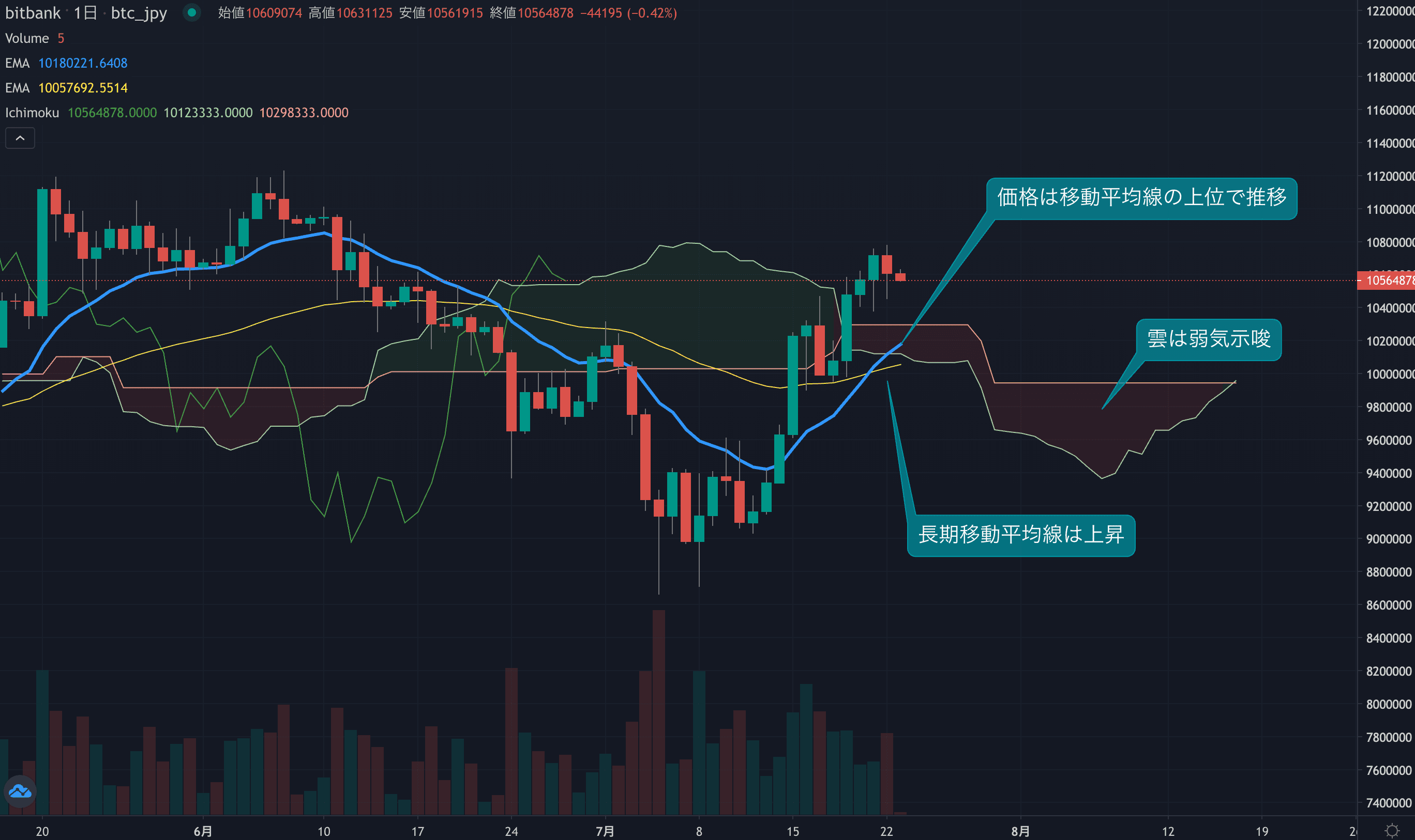 先週の大幅上昇の反動から月曜日は反落、一目均衡表の雲は強気示唆へ移行