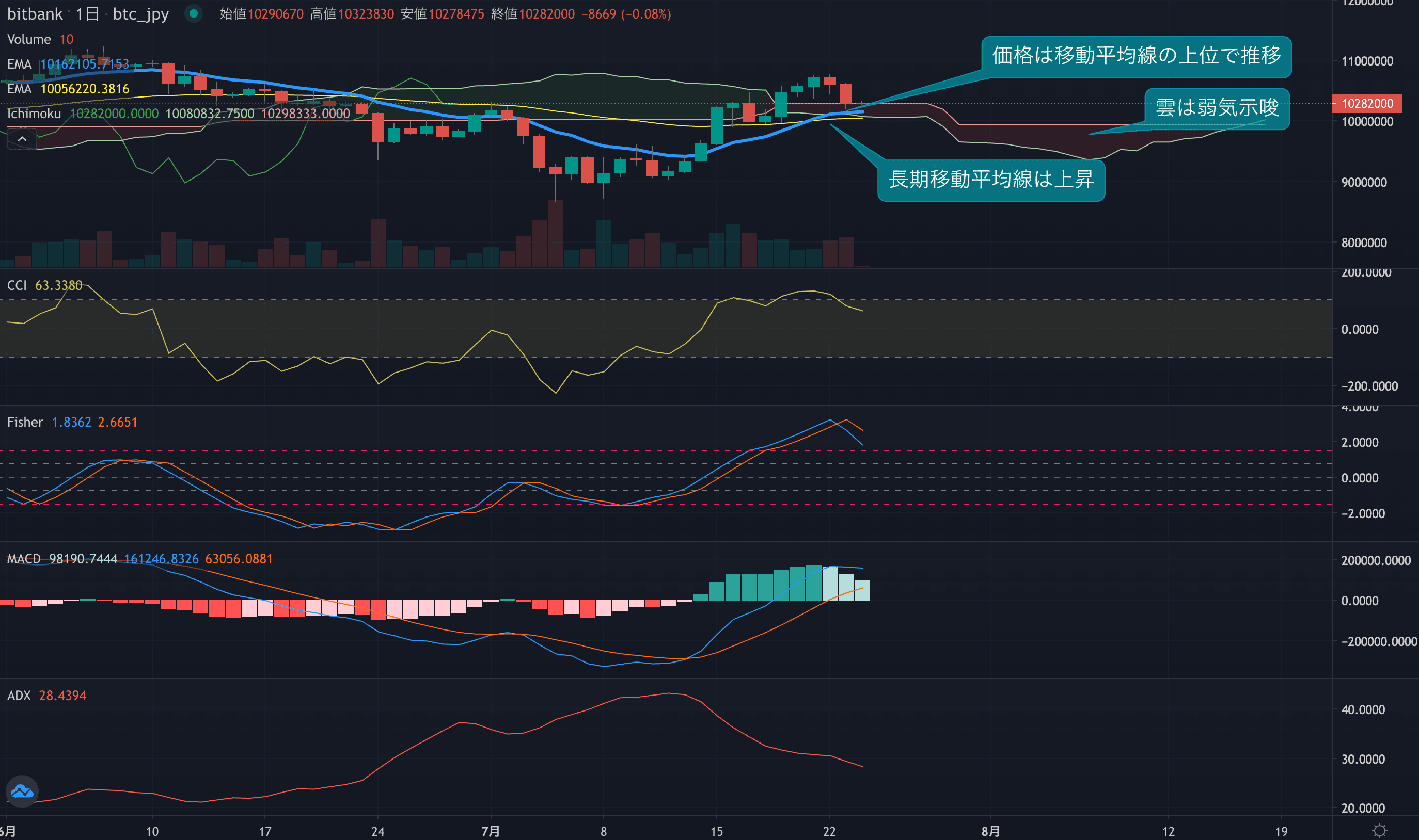 - オシレーター系インジケーターは、短期で下落し始めています。CCIは80まで下落。Fisherでは昨日デスクロスが発生しました。長期オシレーターのMACDは遅行線を上回り、上昇しています。