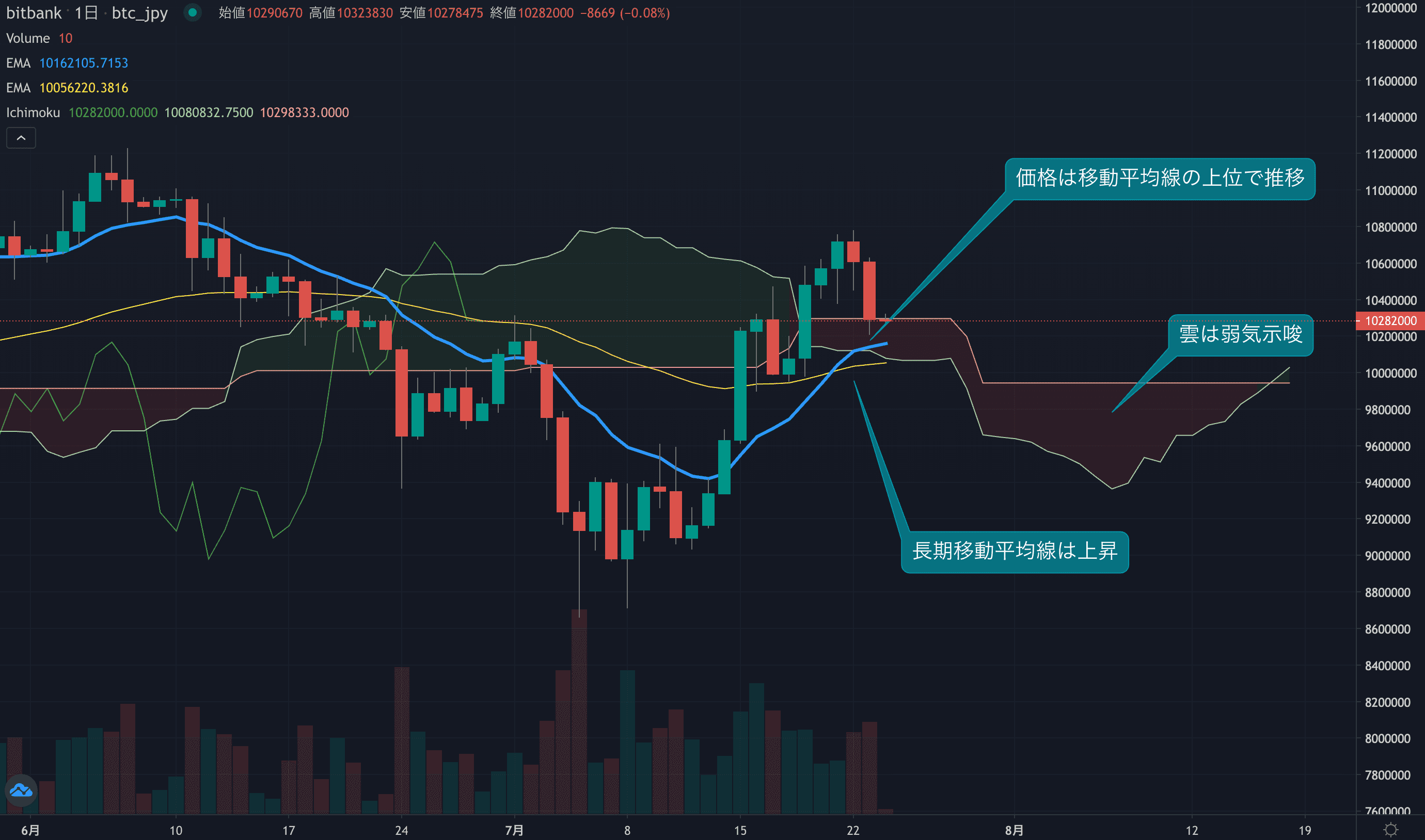 - 今週のビットコインは軟調な相場となり、日足は一目均衡表の雲の上限近辺まで下落しました。ここから下は移動平均線も推移しており、テクニカル的なサポートが期待されます。日足はまだ底堅い動きが見られる一方、短期のオシレーターが下落し始めていることは気になるところです。1000万円を割り込むような動きがあれば、テクニカルが崩れるため警戒する必要があります。本日は移動平均線近辺でサポートされるか注目となります。