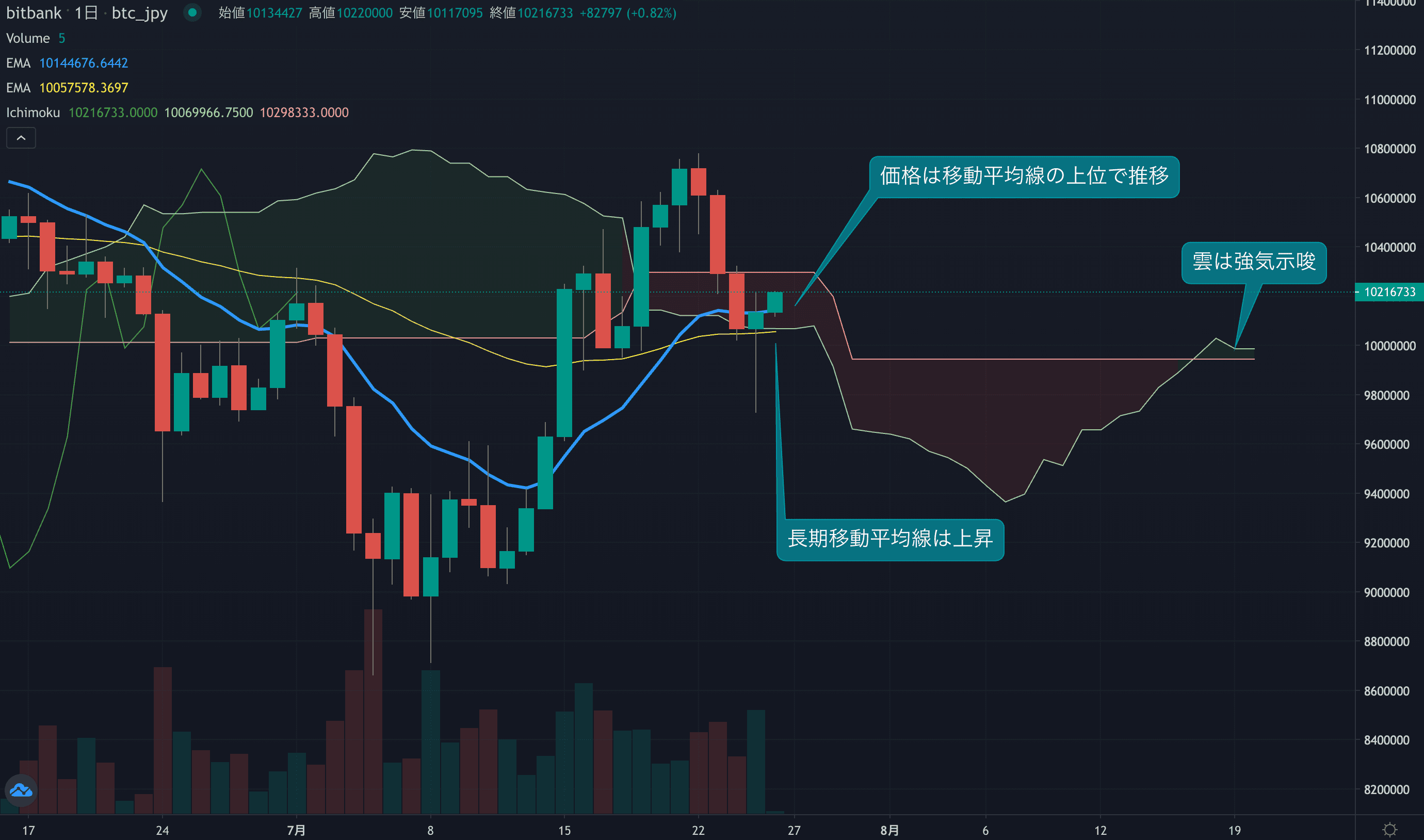 - 価格は14EMA(1013.3万円)を僅かに上回り強気示唆です。53EMA(1005.1万円)は上昇しており、長期トレンドも強気です。一目均衡表の雲は先行スパン1(998.7万円)が先行スパン2(994.5万円)を上回り強気示唆です。