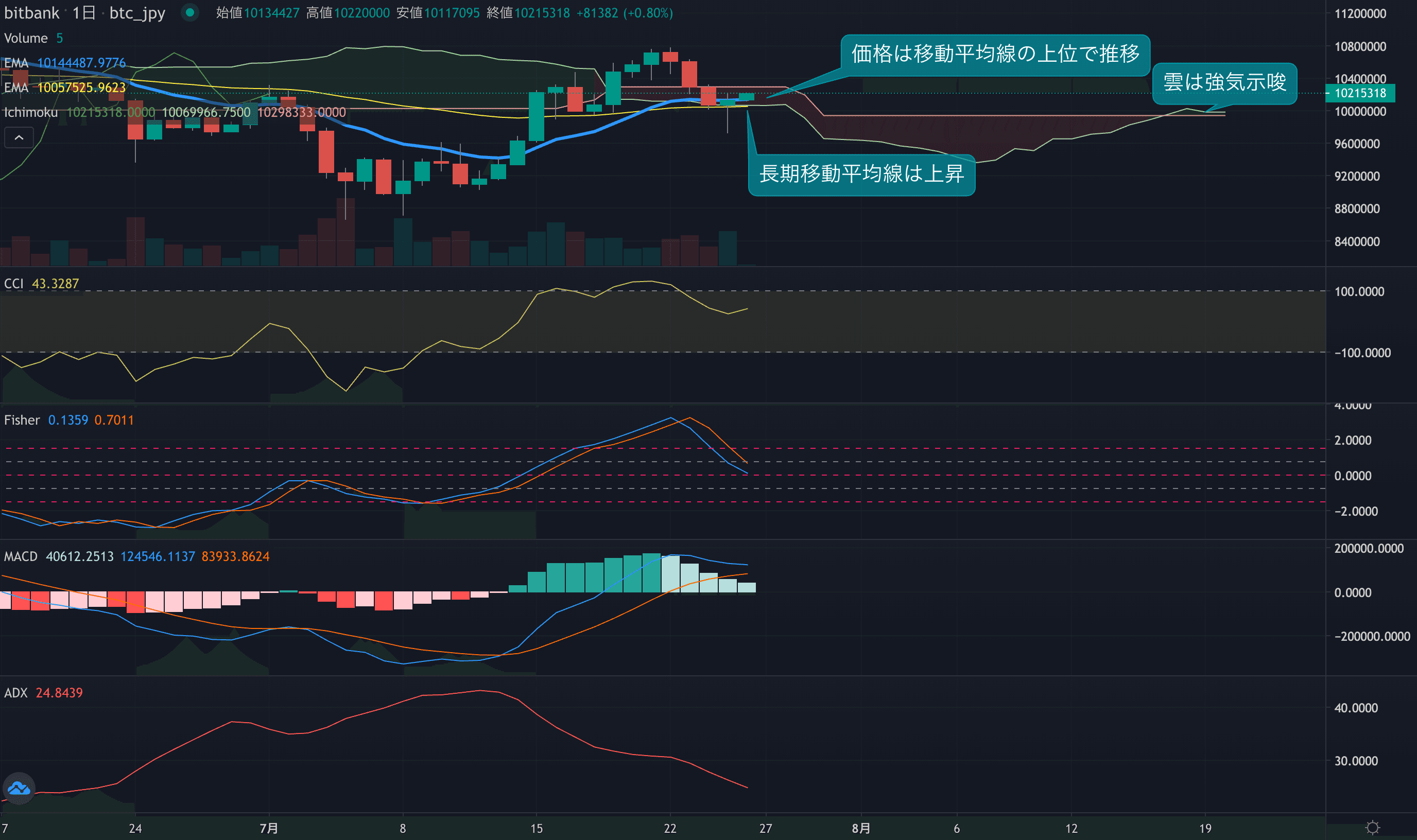 - 強気バイアス・シグナル : CCI(26)はプラス圏で推移しており強気示唆