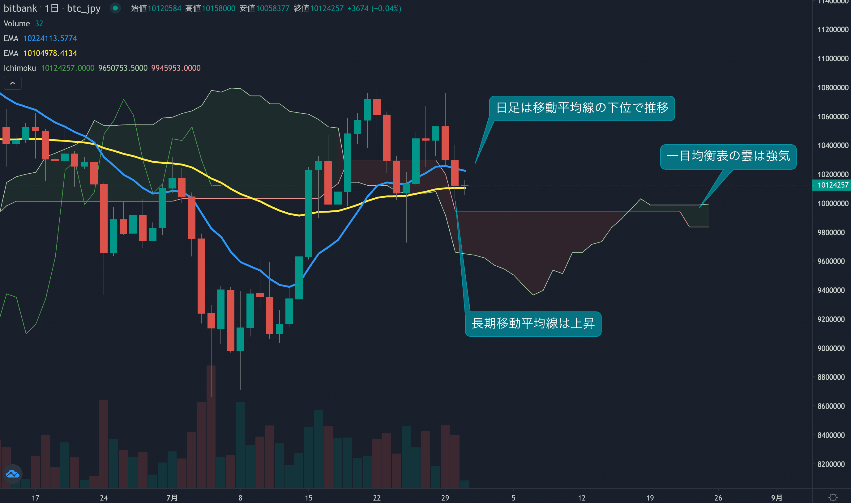 - 価格は14EMA(1023.9万円)を下回り弱気示唆です。53EMA(1010.4万円)は上昇しており、長期トレンドは強気です。一目均衡表の雲は先行スパン1(998.7万円)が先行スパン2(983.5万円)を上回り強気示唆です。