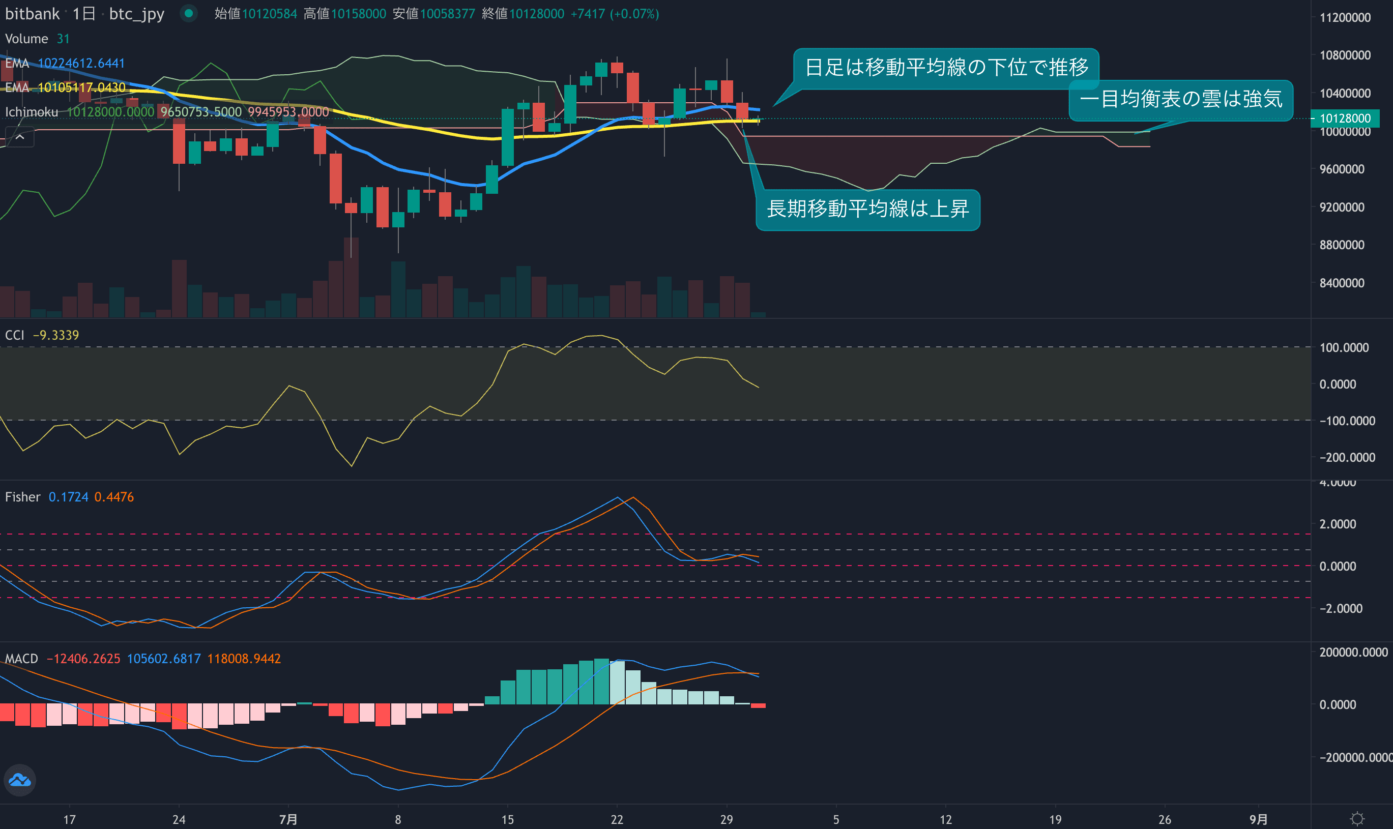 - オシレーター系インジケーターは、足元で下落し始めています。CCIは14まで下落。Fisherでは昨日デスクロスが発生しました。長期オシレーターのMACDも本日からデスクロスし始めています。