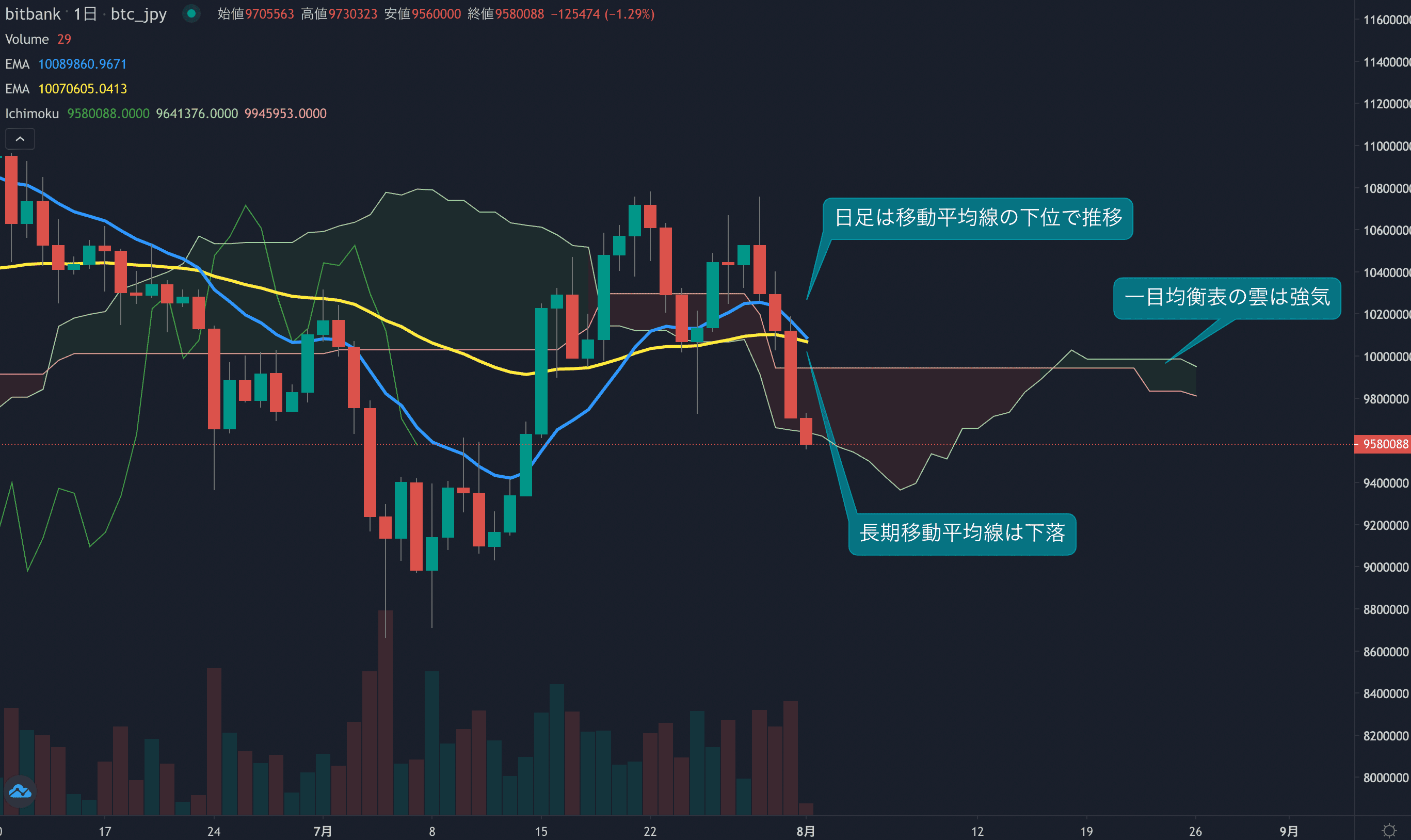 - 昨日のビットコインは4.1%下落し、終値は970.5万円でした。今週はこれまで3日連続でマイナスとなり、流れが下落方向で動いています。日足は一目均衡均衡表の雲の下限付近まで下落しました。長期移動平均線も下回り、弱い値動きとなっています。
