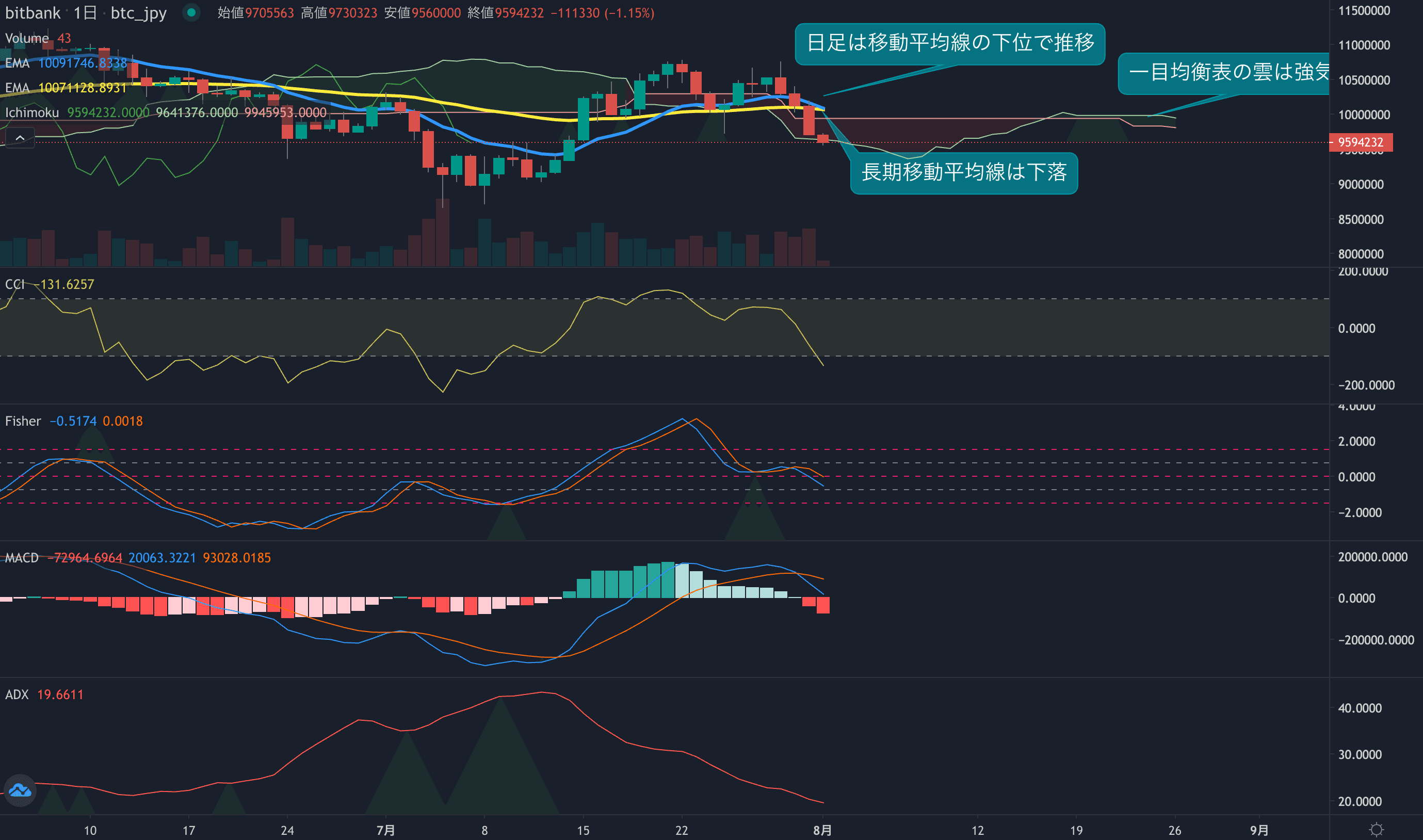 - 今週のビットコインは昨日までに7%強下落し、本日も安値で取引されています。昨日は日銀が利上げを行ったことで外国為替市場で円高となり、対円のビットコインも大きく下落する影響が出ました。テクニカル的には一目均衡表の雲を下に抜けると、下落トレンドが発生する可能性が高まります。現状はADXが示すように相場には大きなトレンドはないものの、週後半も下落するようなら安値を掘る展開が予想されます。対円チャートは先週の安値を割り込んでおり、非常に弱い動きとなっています。金融政策変更の影響により相場には警戒感が急速に高まっています。