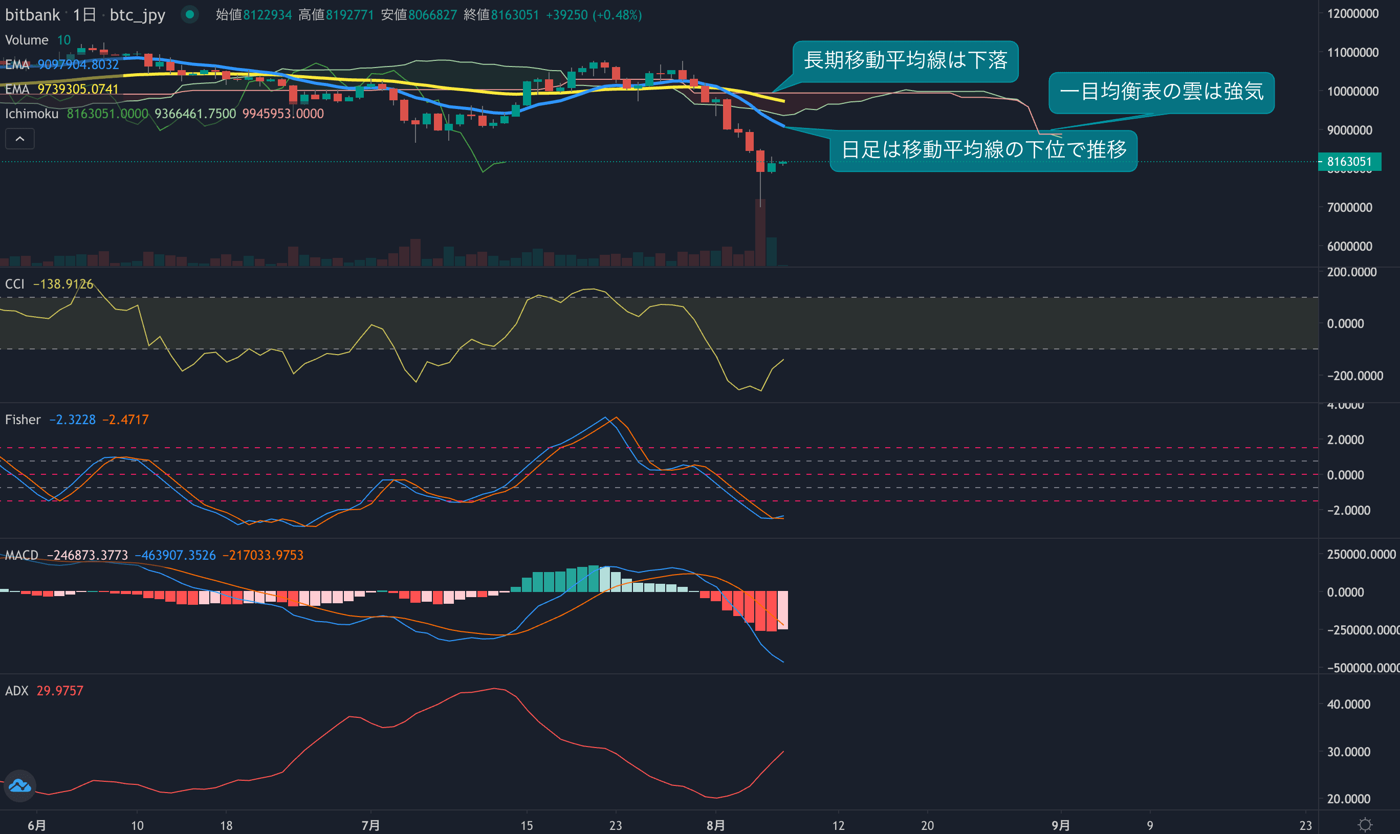 - 火曜日の相場はこれまでの下落から持ち直し、小幅に上昇しました。短期的に売られ過ぎた反動から短期のオシレーターは反転し始めており、相場の巻き戻しが起こっています。本日も小幅に上昇して取引されており、買いが継続しています。短期の移動平均線は900万円台で推移しており、短期的には反発の余地を残しています。週次のマイナス幅はすでに2%を下回っており、プラスを回復できるか注目です。