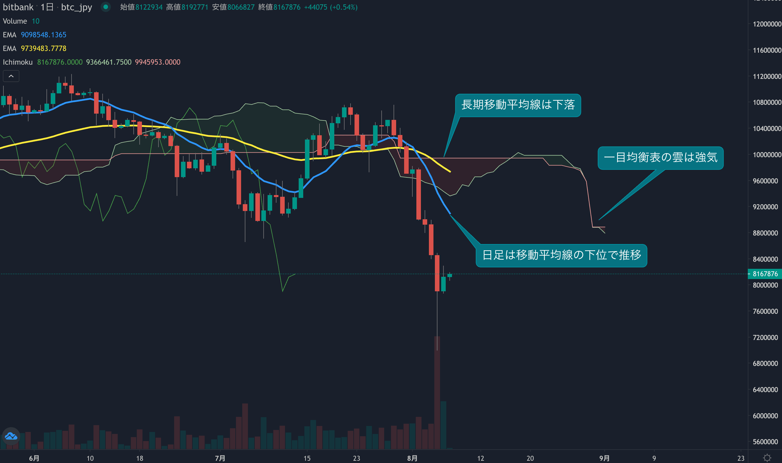 - 価格は14EMA(924.1万円)を下回り弱気示唆です。53EMA(979.9万円)は下落しており、長期トレンドも弱気です。一目均衡表の雲は先行スパン1(888.4万円)が先行スパン2(889.0万円)を下回り弱気示唆です。