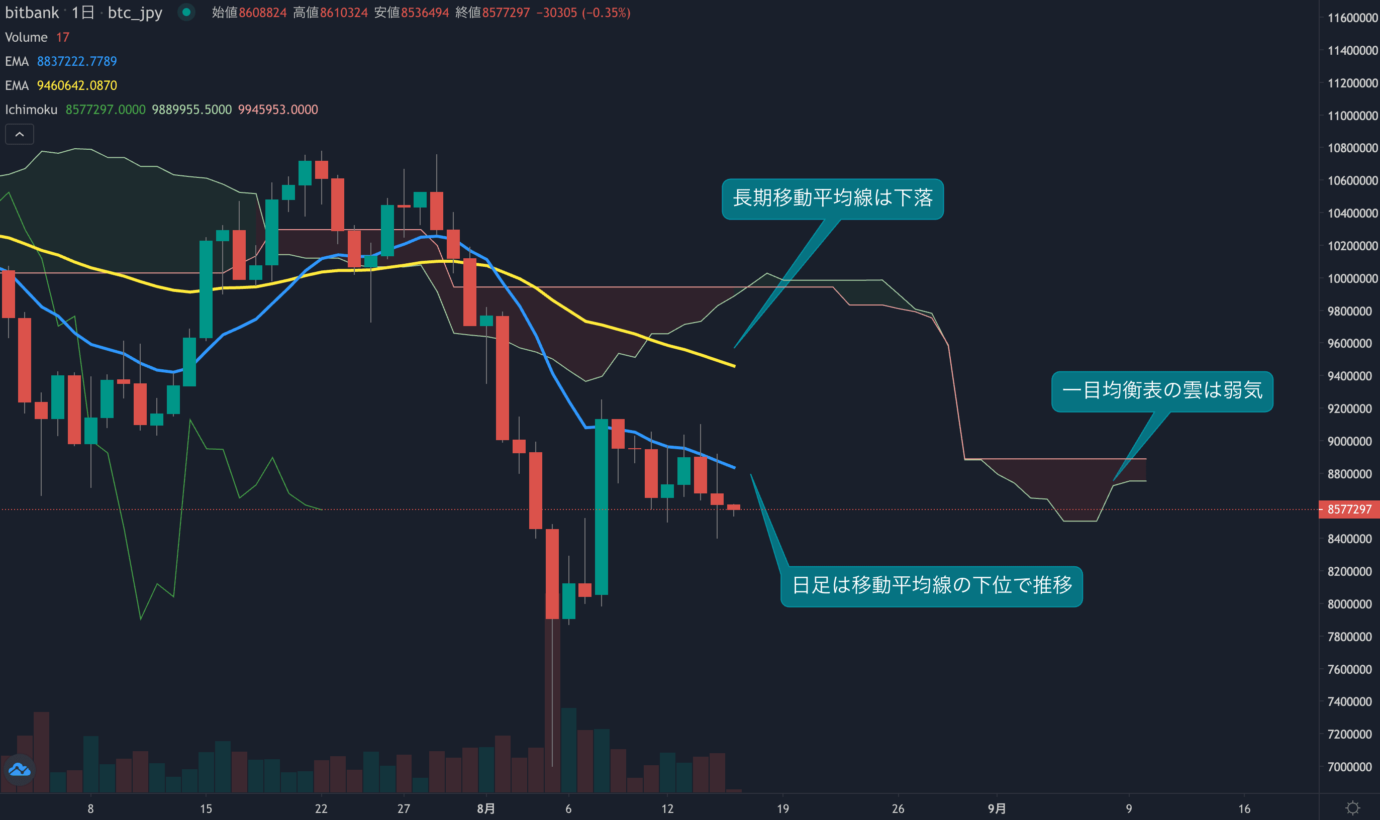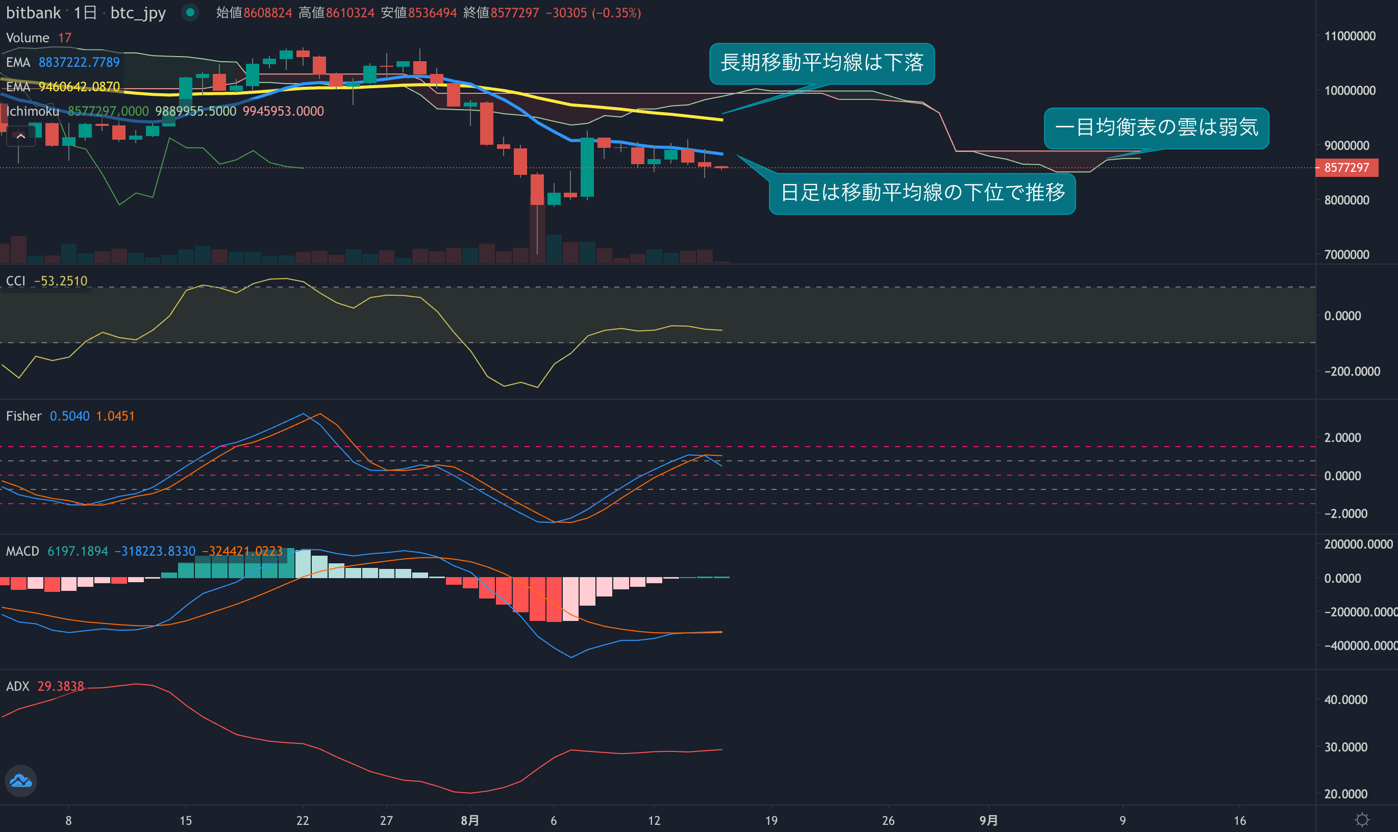 昨日も移動平均線で跳ね返される動き、価格は一時840万円まで下落
