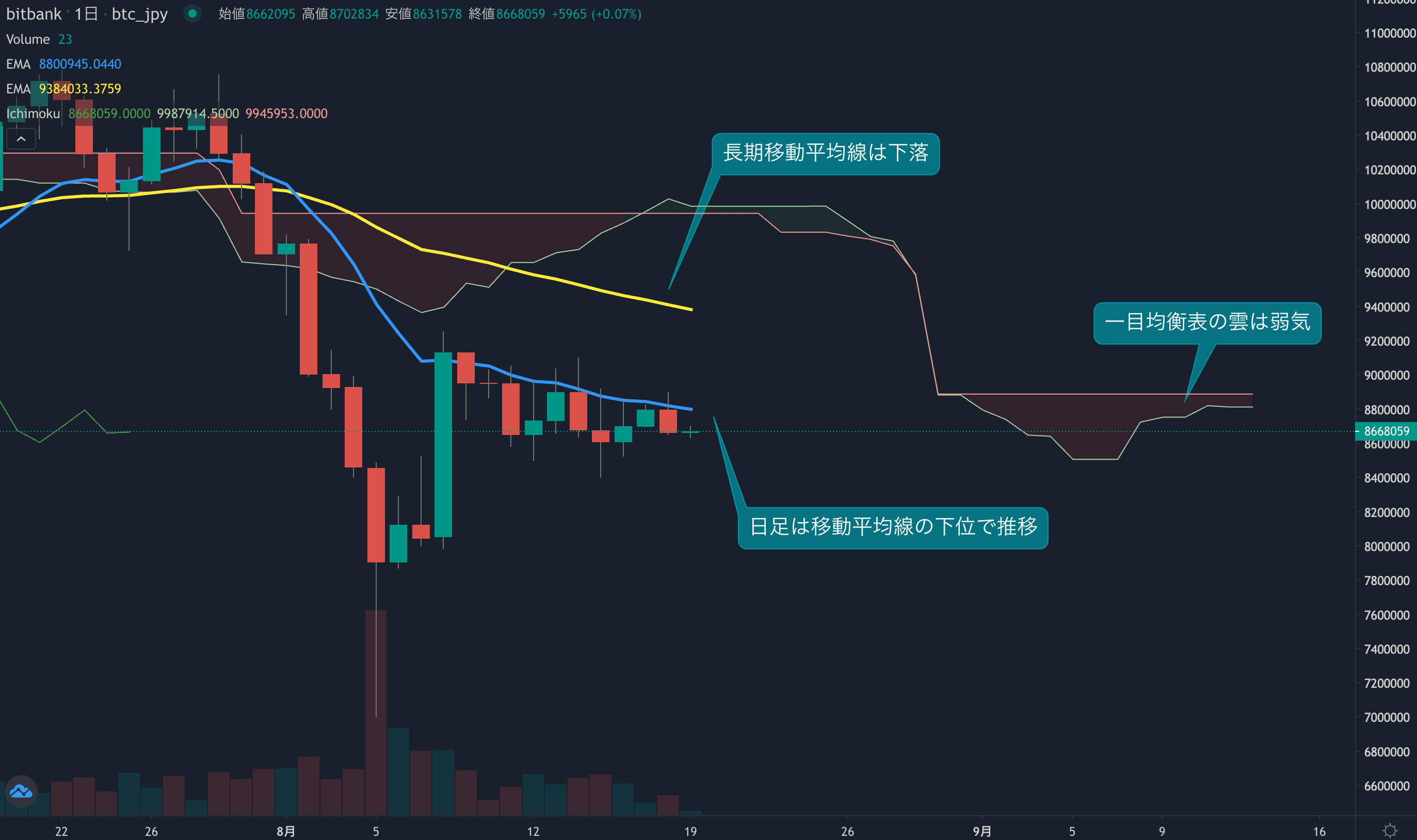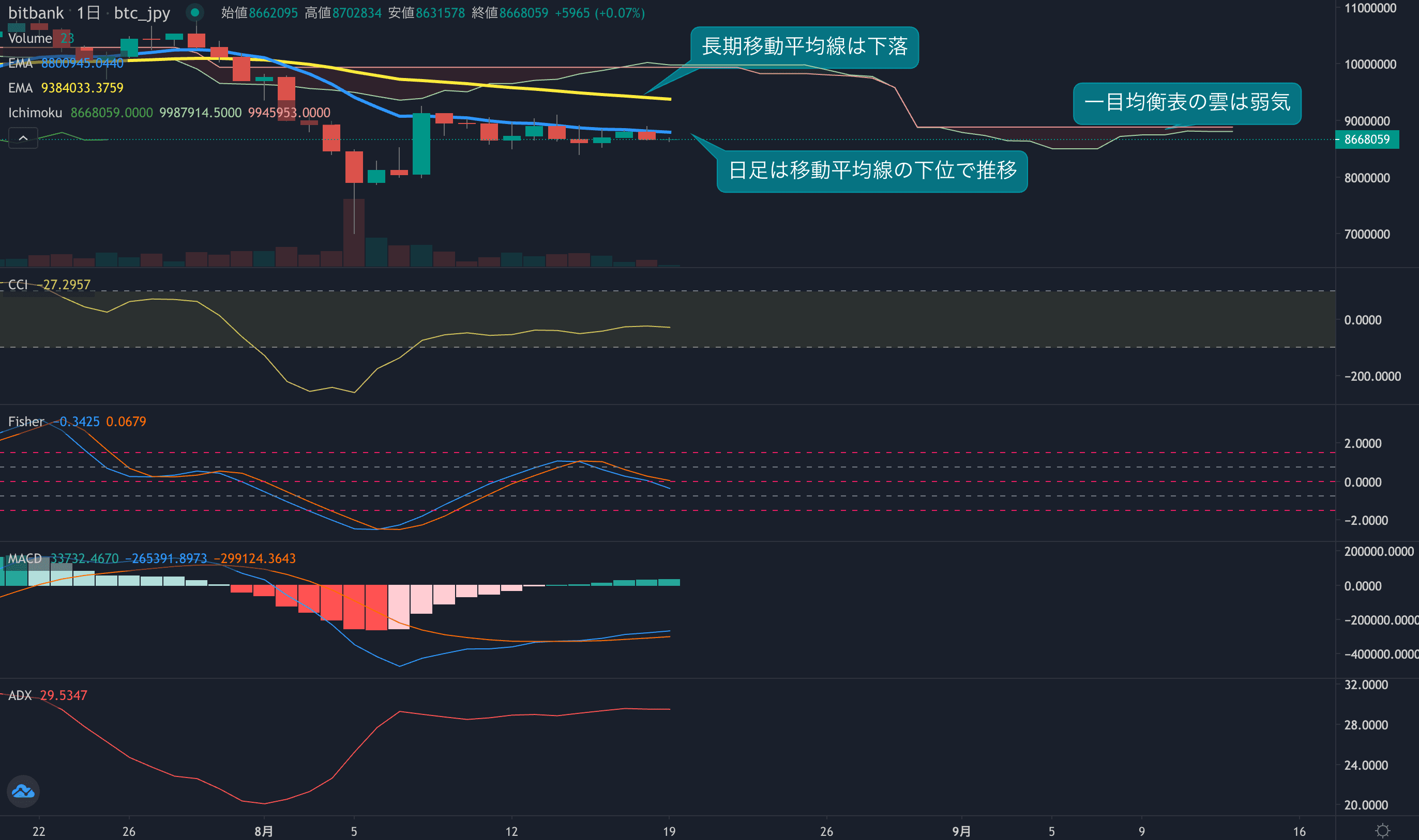 - ビットコインの8月2週目となった先週の週足は0.1%上昇した陽線となりました。ほぼ横ばいの展開となりましたが、2週連続で陽線を記録しました。一方、相場は上値も重い動きが続いており、足元で900万円台の回復に苦労しています。昨日も900万円台を維持することができませんでした。日足チャートは弱気な形が維持されており、価格が移動平均線を下回り、オシレーターもマイナスで推移しています。ここ2週は陽線となりましたが、下落の反動が主な要因となっています。まだ上値を追う動きは見られておらず、底値を探りに行く動きに警戒です。