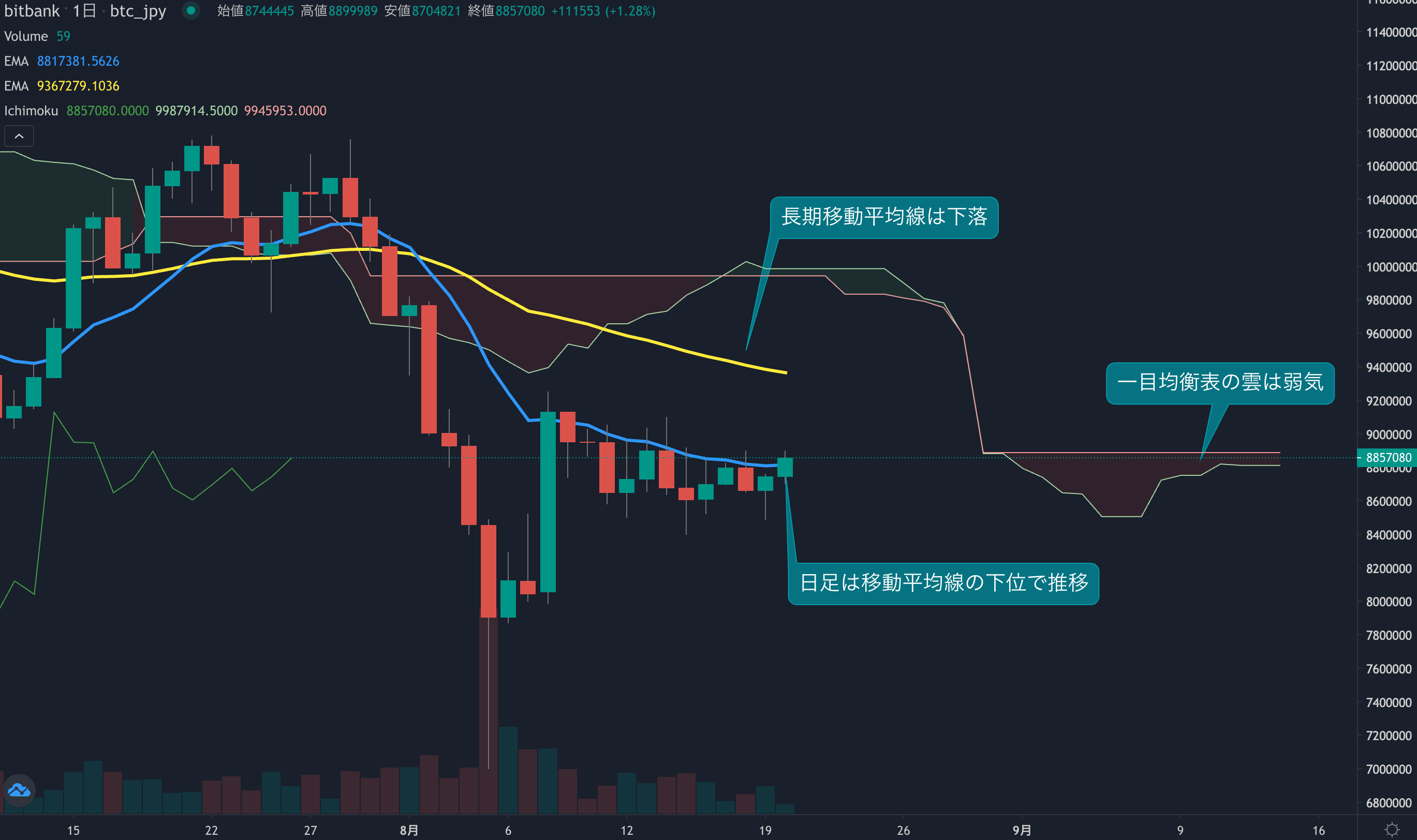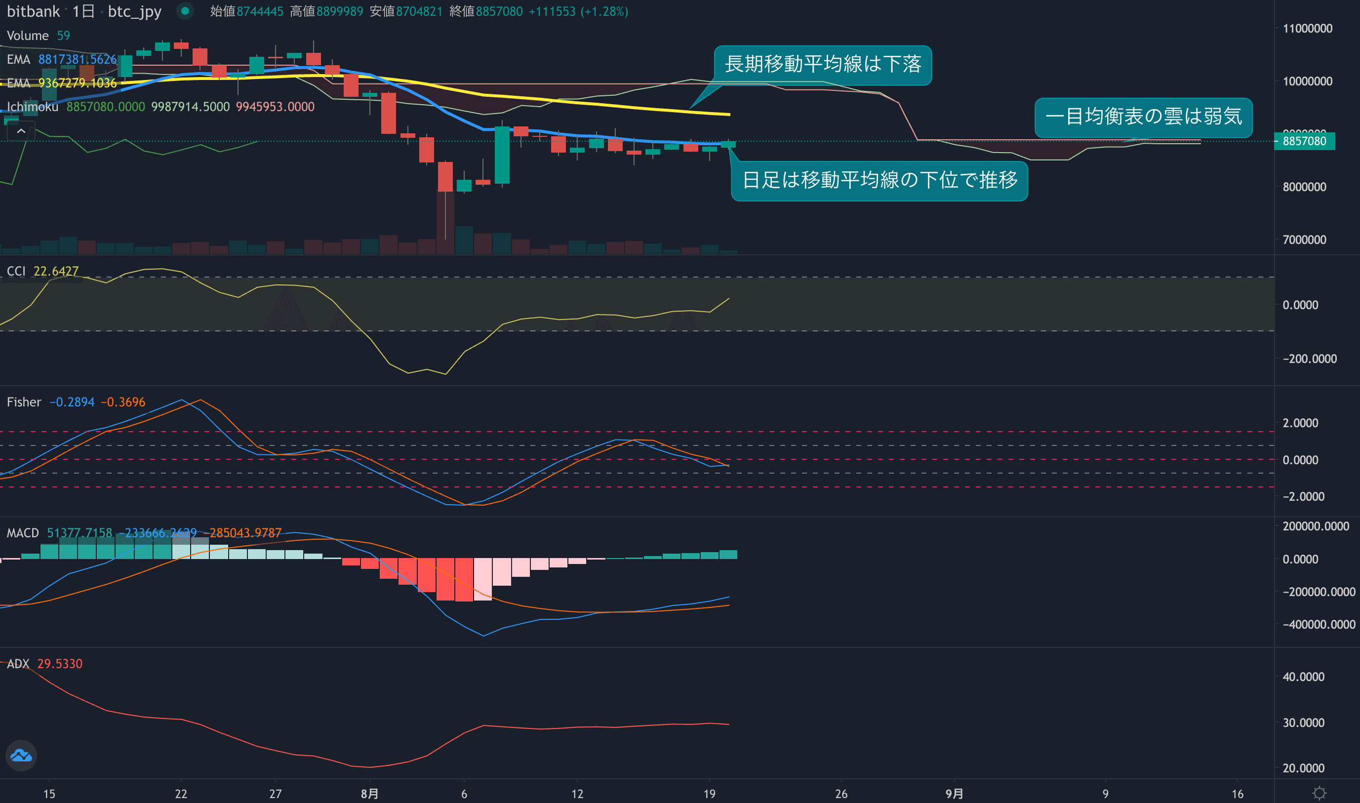- 昨日のビットコインは0.9%上昇し、終値は874.5万円でした。一時850万円近辺まで下落する場面がありましたが、買い戻しが入り、終値にかけてプラスとなりました。一方、移動平均線を上回るには至りませんでした。