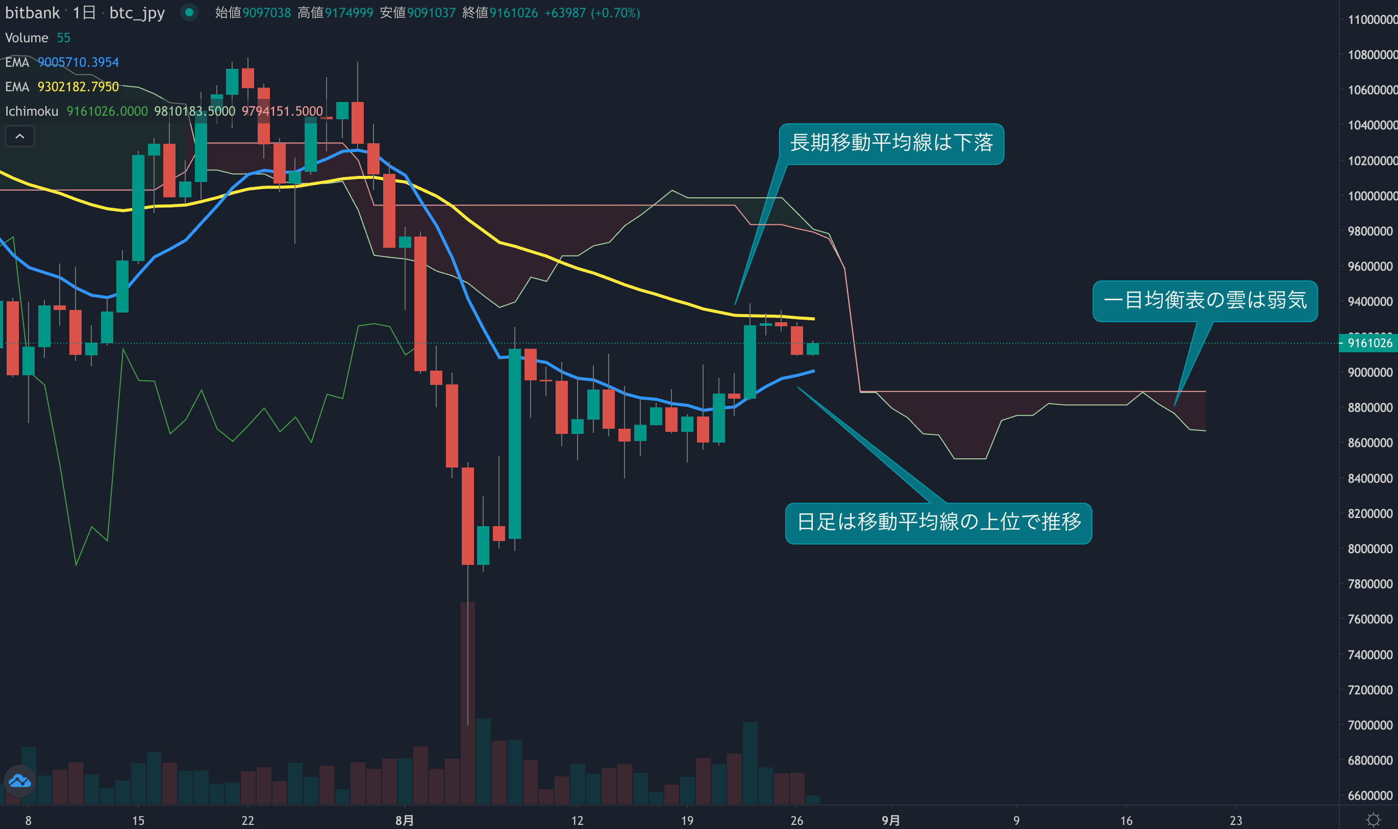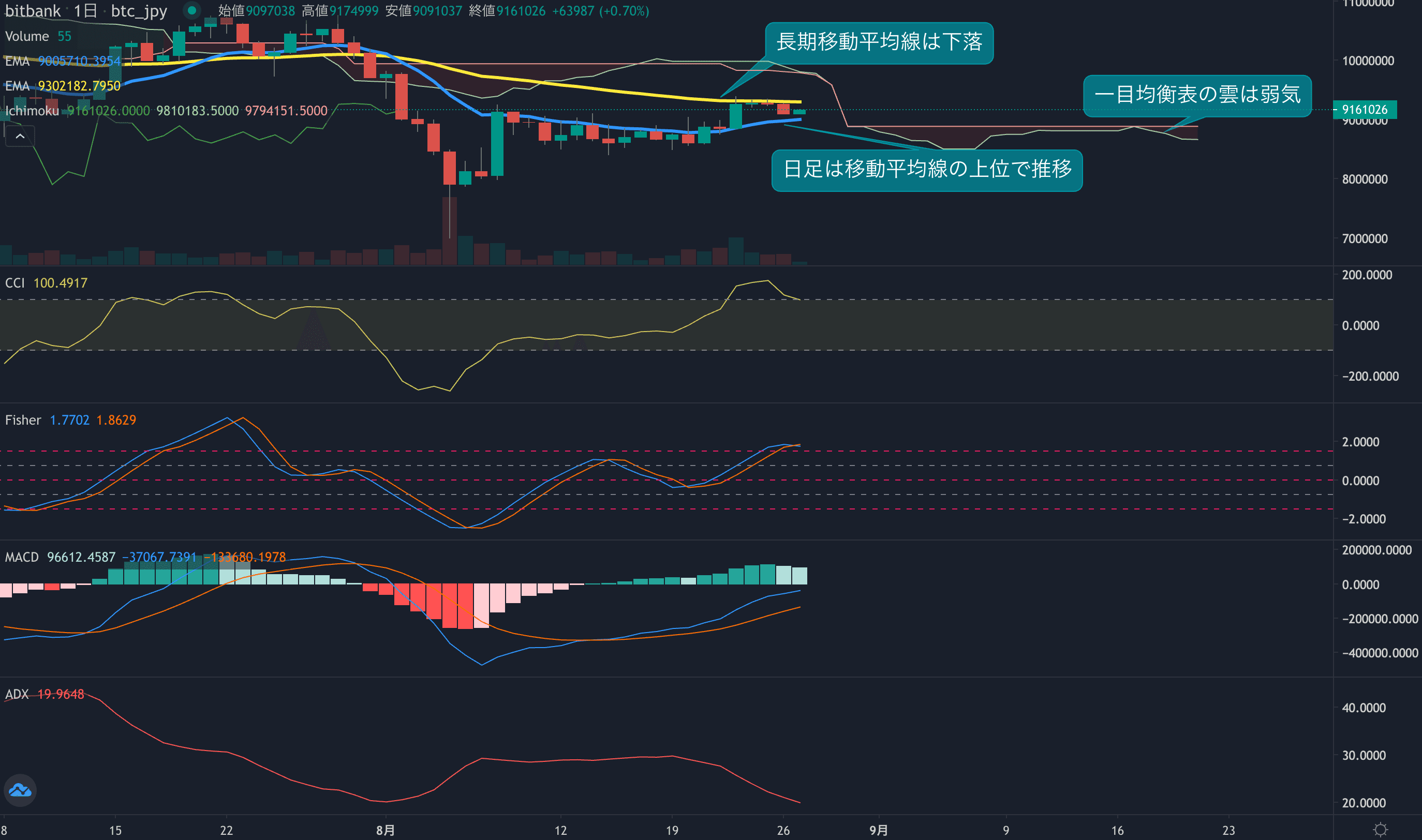 - 昨日のビットコインは1.7%下落し、終値は909.7万円でした。今週は下落して取引が始まりました。先週金曜日に4.6%上昇した反動で短期的な売りが出ています。さらに日足は長期移動平均線に上値を抑えられる形となっています。