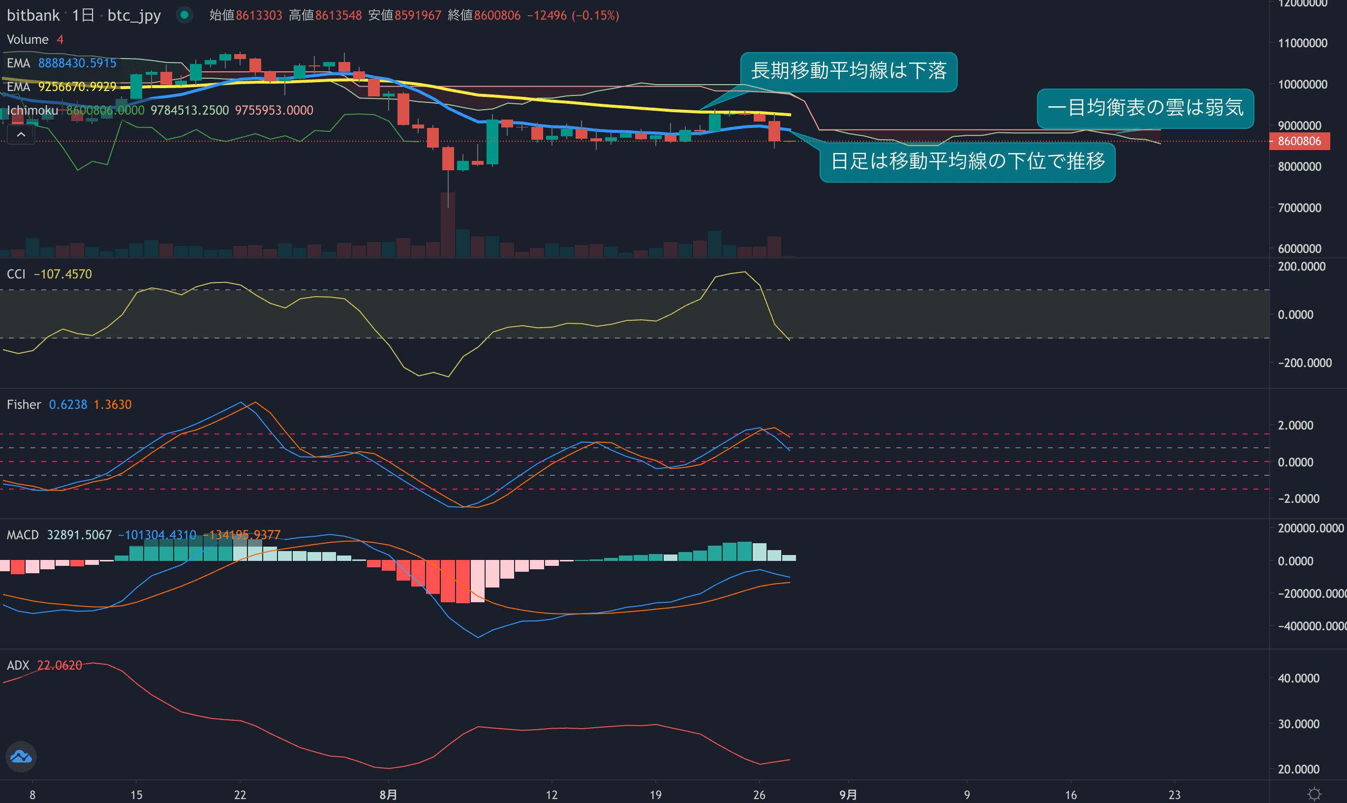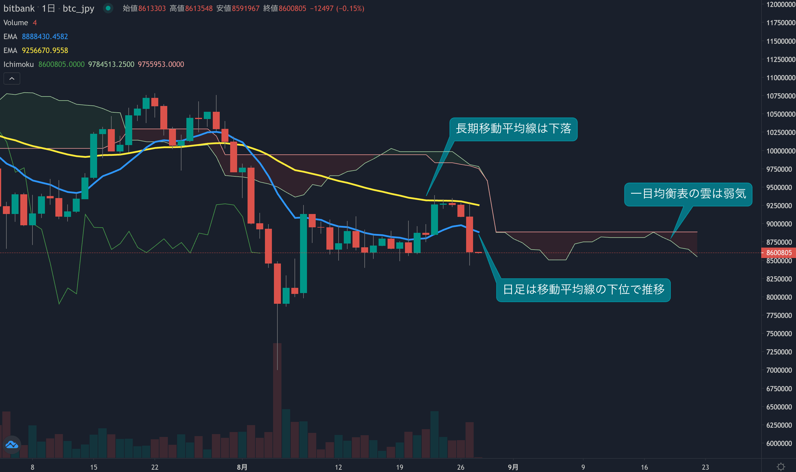 - 昨日のビットコインは5.3%下落し、終値は861.3万円でした。相場は再び900万円を割り込み、安値を探る展開となりました。日足は移動平均線を下回り、下落方向への動きが強くなりました。